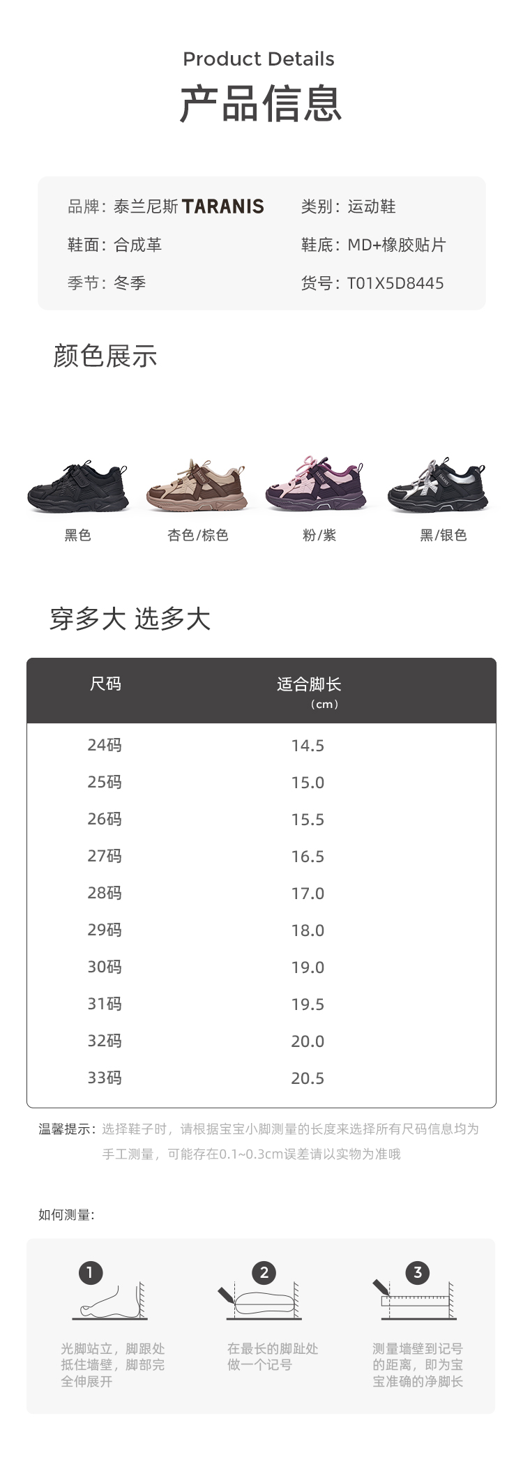 【新品】泰兰尼斯小童段冬款舒适加绒时尚保暖运动鞋T01X5D8445