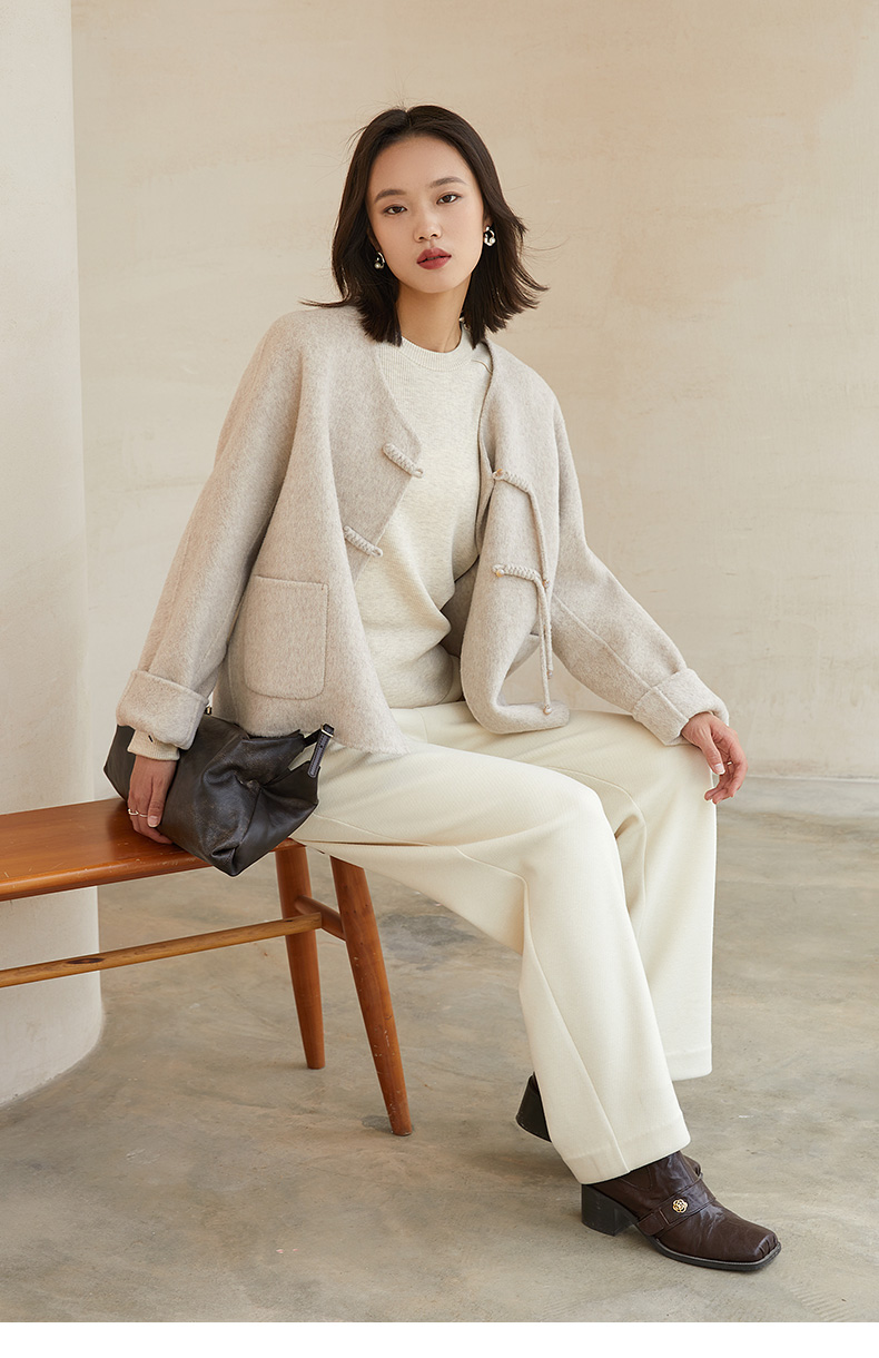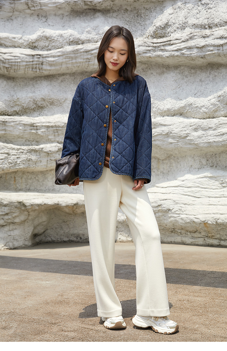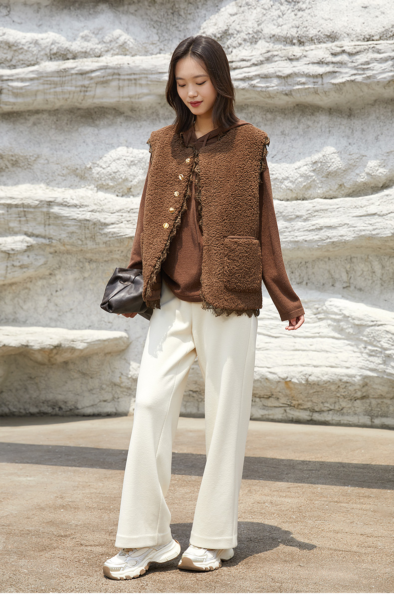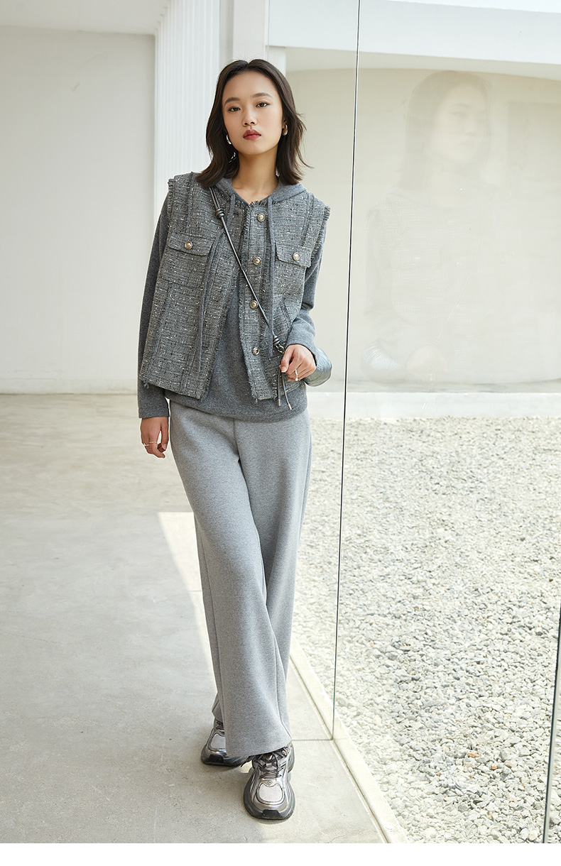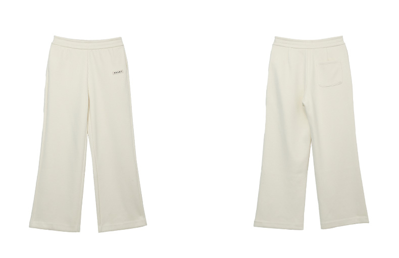 米白色高腰阔腿休闲裤 秋冬宽松显瘦品牌标识装饰百搭直筒裤