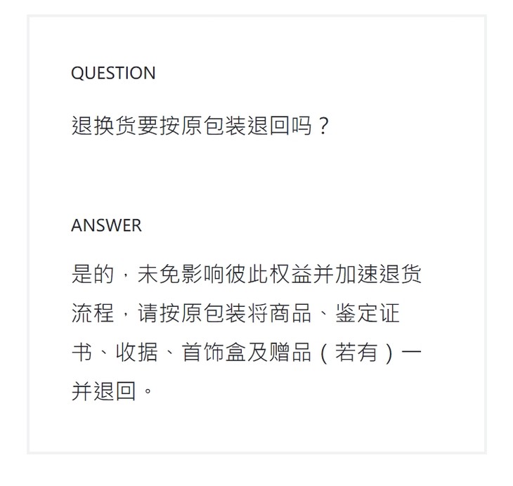 拥有珠宝保修一年期限。为竭尽所能达到每位客户的要求,正常配戴磨损划痕或其他人为、外力因素造成的损害则不在此范围内。