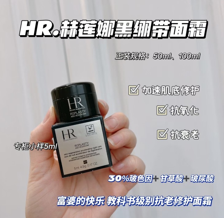HR赫莲娜黑绷带面霜 5ml|原价💰187 👍 贵妇界修复抗老面霜的代名词:黑绷带😎。擅长烂脸修复,对红血丝、毛孔粗大、痘印、细微伤口都有明显效果,受欢迎程度极高🔥,各类面霜大赏均榜上有名。作为一款王牌修复面霜,它有着30%业界最高浓度玻色因💧,超强的渗透力,不断刺激胶原蛋白再生,维持皮肤的紧实度、细腻度、光泽度✔,预防皱纹、毛孔粗大、下垂松弛问题的产生。质地润而不油👯,适合各种肤质,特别是混合偏干肤质。💥效果实实在在摆在那,想入手黑绷带,5ml搞一下📣!