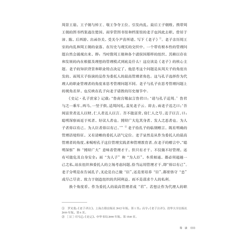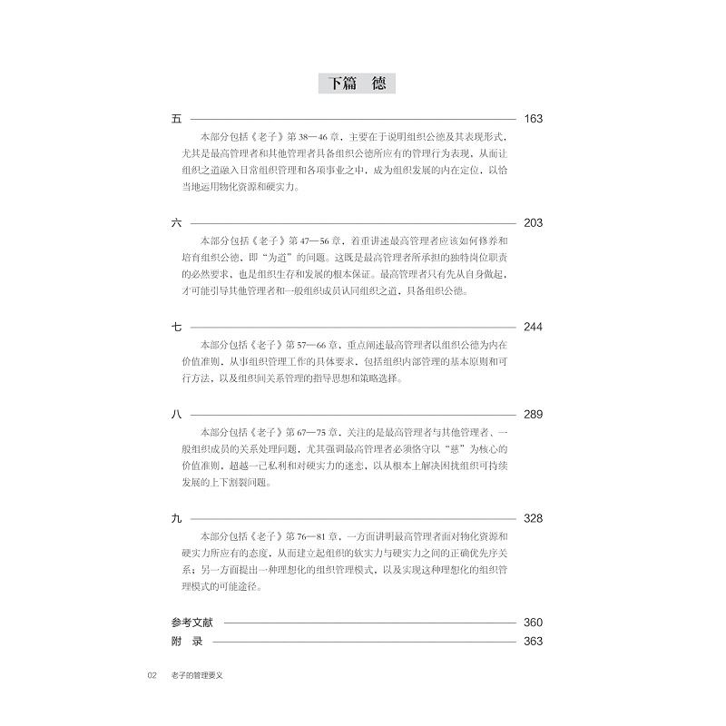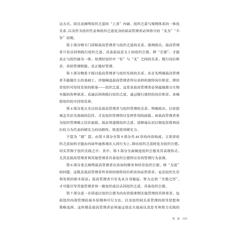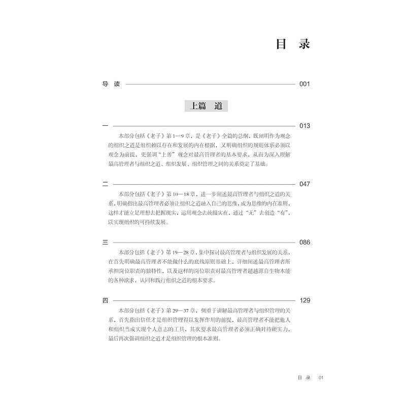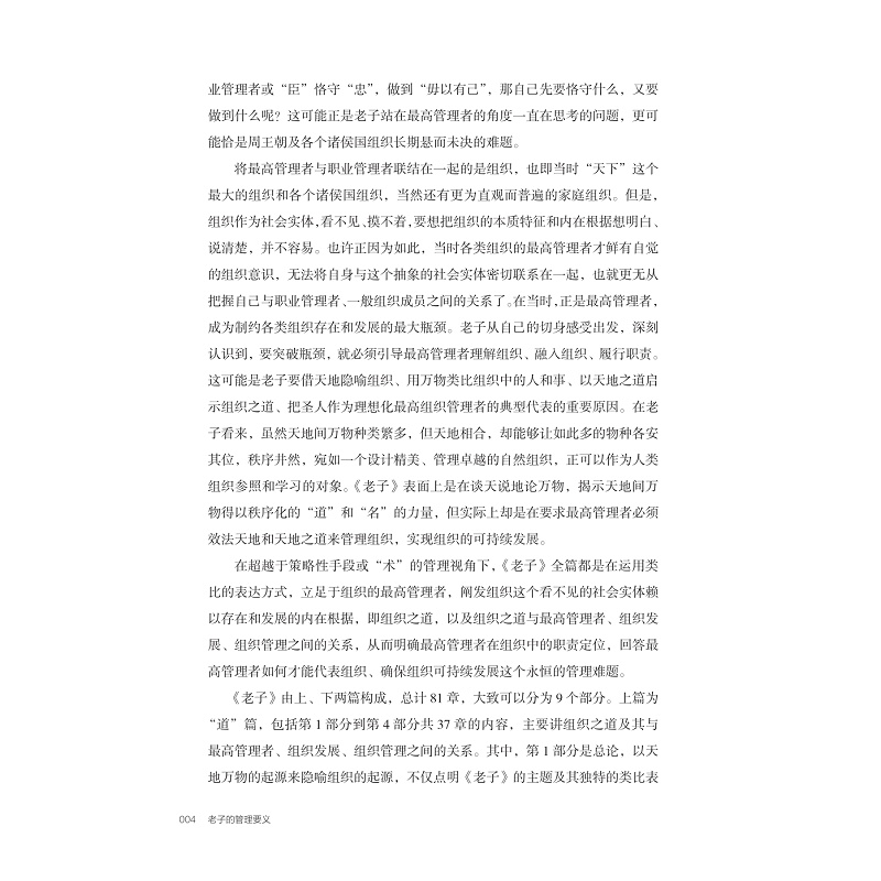 《老子》的永恒魅力,恰在于关切人之为人、组织之为组织的根本问题。本书从管理视角出发,逐章详细解读了《老子》中所蕴藏的丰富而又深邃的管理思想。在管理视角下,《老子》通篇都是在用独特的类比表达方式,立足于组织的最高管理者,深刻揭示组织赖以存在和发展的内在根据,即组织之道,以及组织之道与最高管理者、组织发展、组织管理之间的关系,系统阐明“尊道”“贵德”做管理的核心要义。在技术迅猛发展、组织不断变革、环境日益动荡的时代背景下,重温《老子》的管理要义,回归《老子》的底层逻辑,或许能让被遮蔽的思想和观念重新闪光,照亮组织和管理的未来之路。