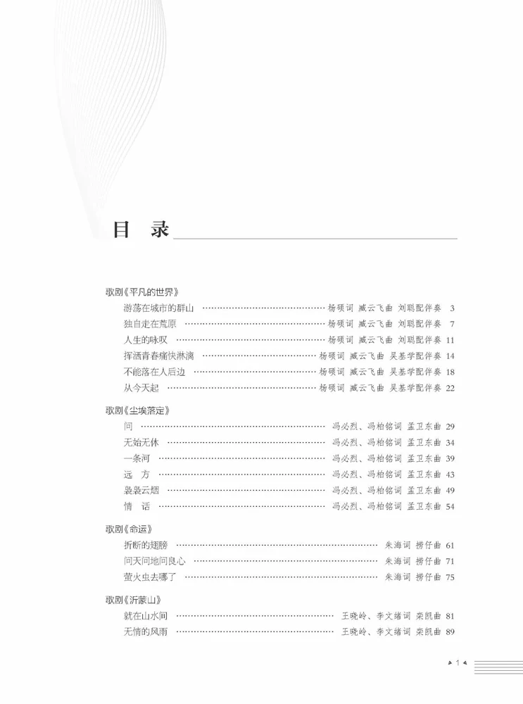 《中国歌剧百年——精选唱段集萃》以年代为编辑原则分为九册,涵盖了20世纪20年代至2018年创作的117部歌剧,366首唱段。本书是第九册,收录了2018年度“中国民族歌剧传承发展工程”重点扶持剧目《平凡的世界》《尘埃落定》《命运》和《沂蒙山》其中的24个唱段。乐谱均以五线谱记谱,并全部配有钢琴伴奏谱;曲谱后有作品简介,包含剧情介绍、音乐本体分析和演唱技术提示等内容,使演唱者可以更加直接地了解作品的年代归属与时代特性,从而对音乐本身有了更深层次的理解。