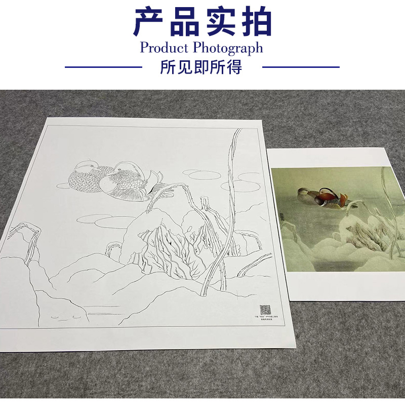 【大彩图】龚雪青工笔画白描底稿斗方小品《鸳鸯》临摹勾线花鸟线稿XQ57