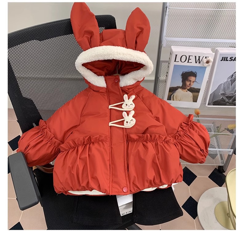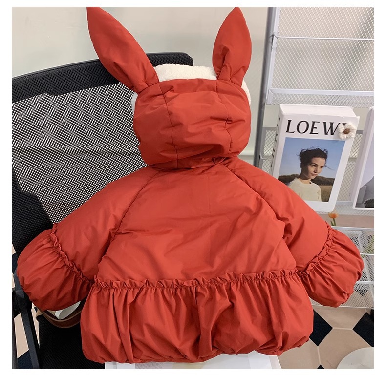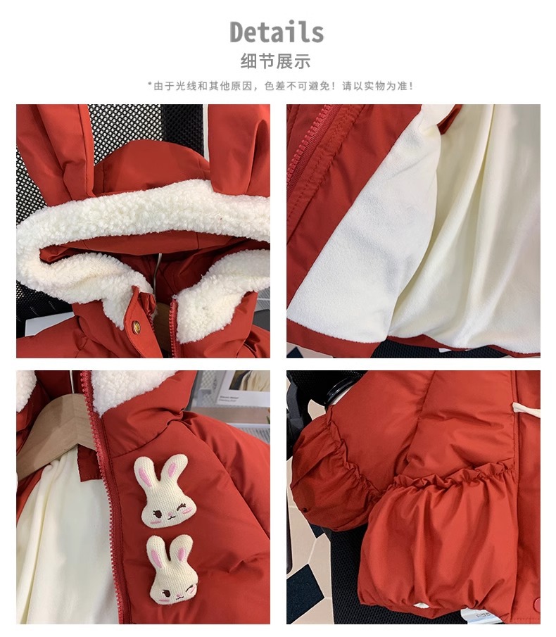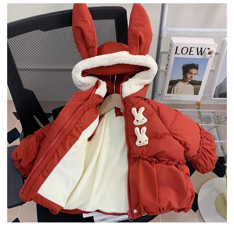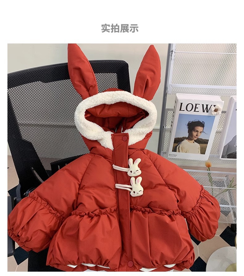 【全棉面料,轻柔舒适,兔子绒毛领设计,增添可爱气息~】新款女童羽绒棉服 冬装洋气儿童冬季夹棉外套 小女孩兔子棉袄-QQ