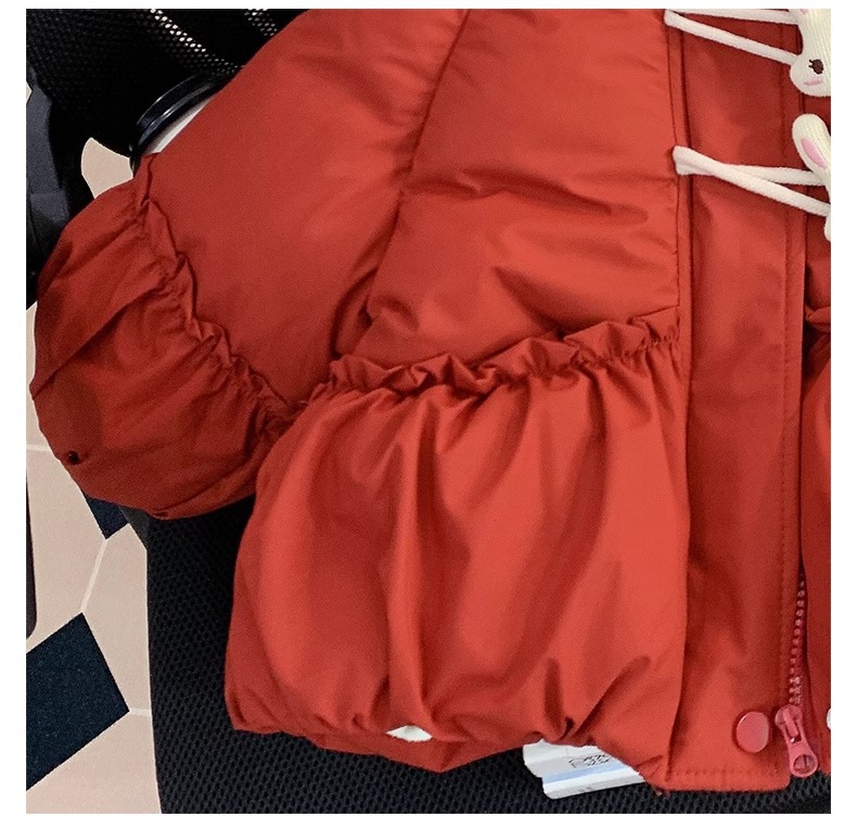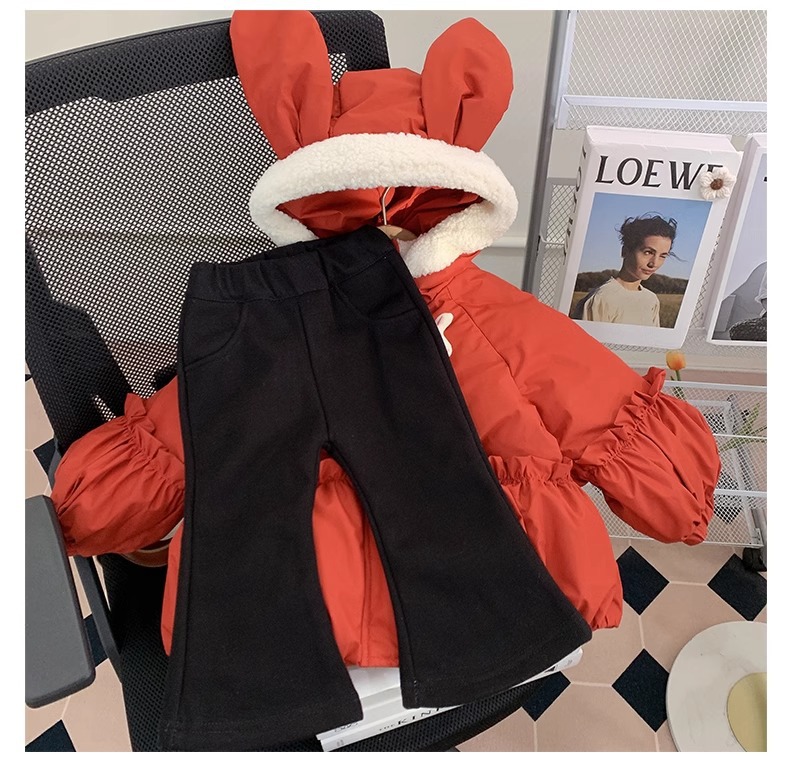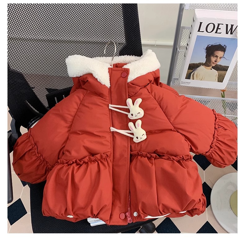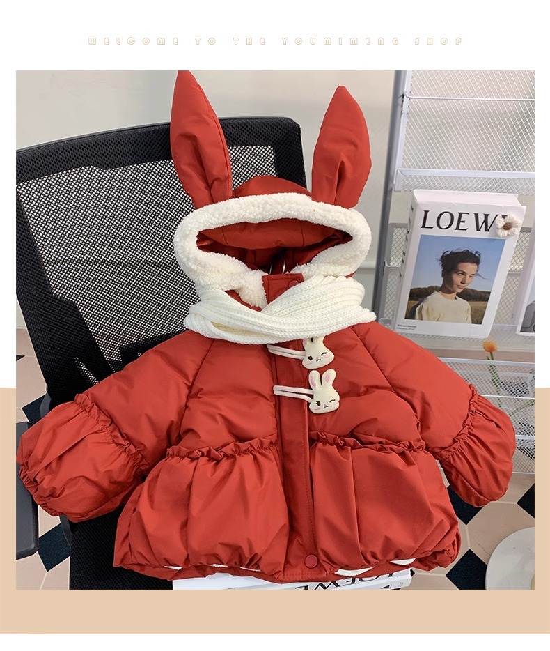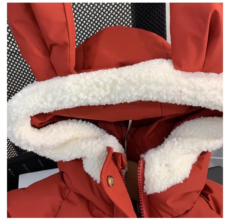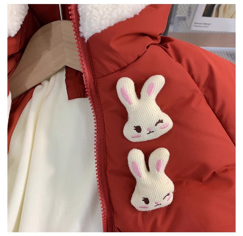 【全棉面料,轻柔舒适,兔子绒毛领设计,增添可爱气息~】新款女童羽绒棉服 冬装洋气儿童冬季夹棉外套 小女孩兔子棉袄-QQ