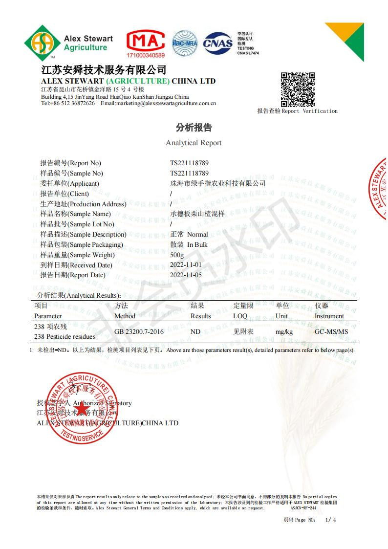 去年板栗上架之前,我们和山楂又做了260+农残抽检,无检出。