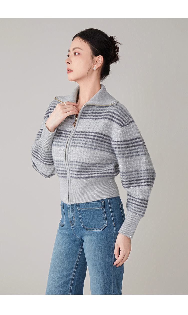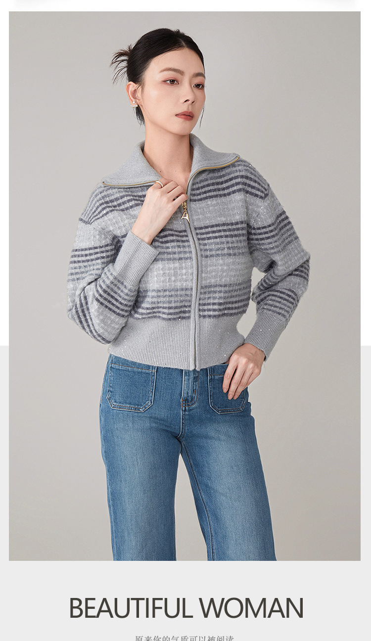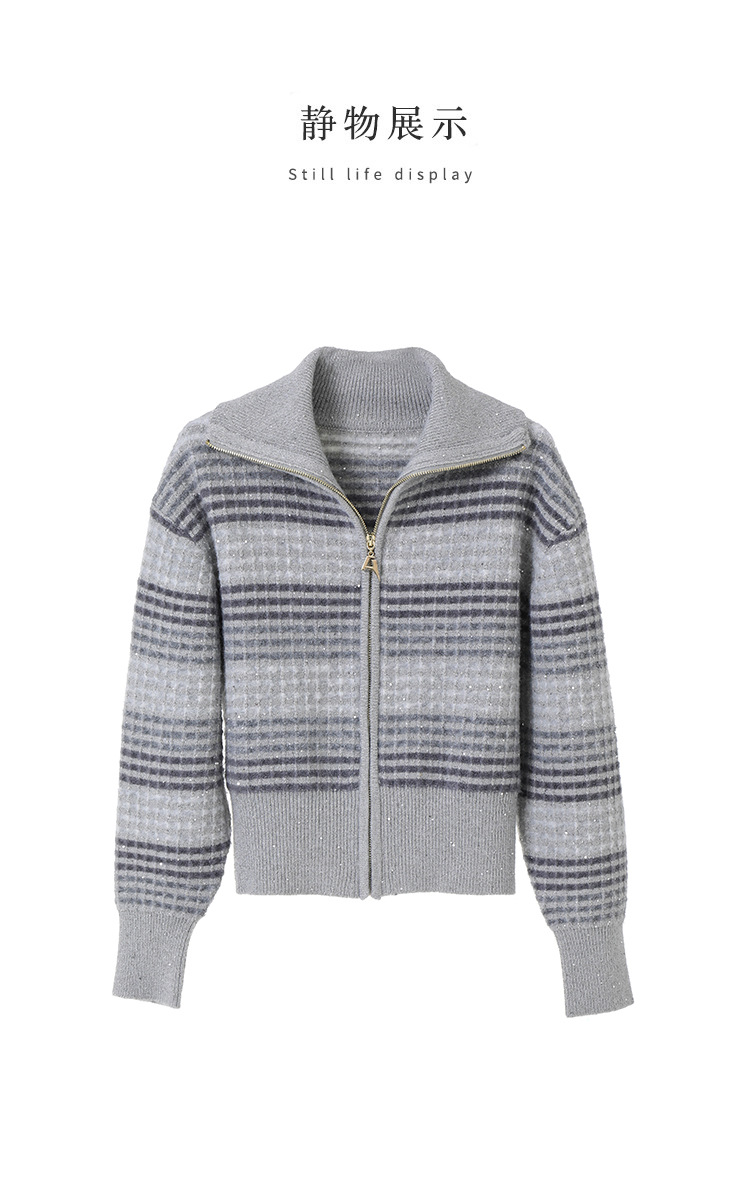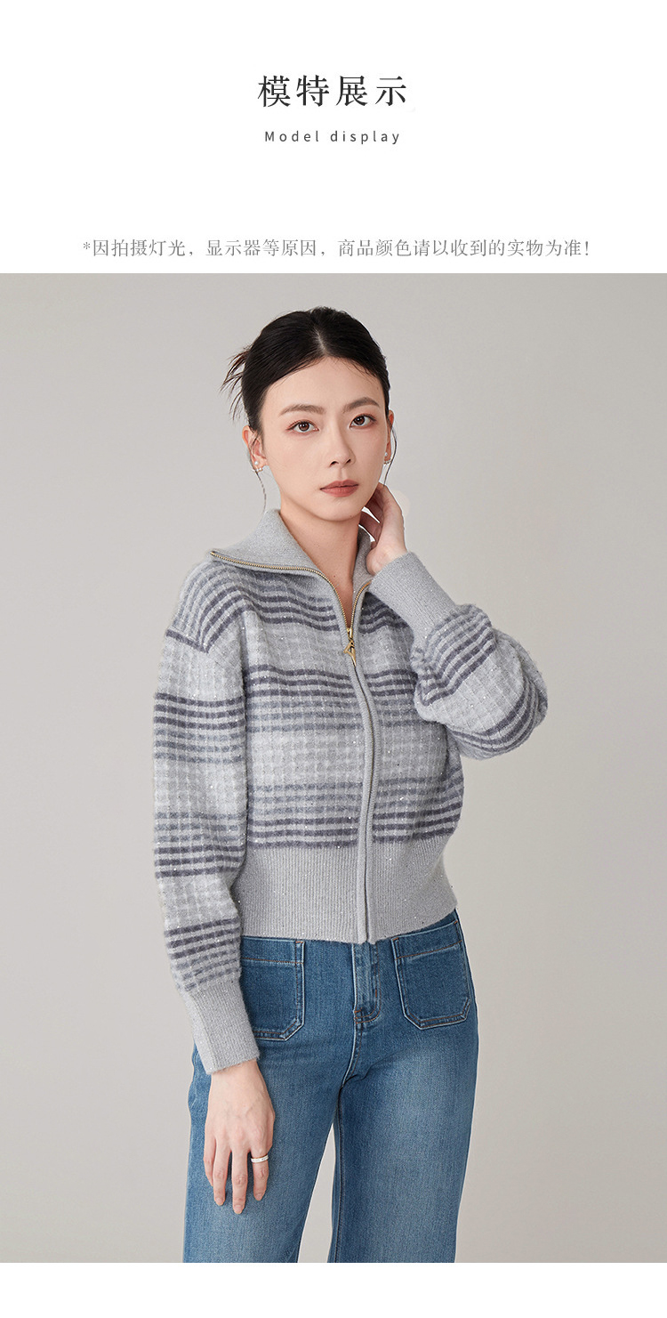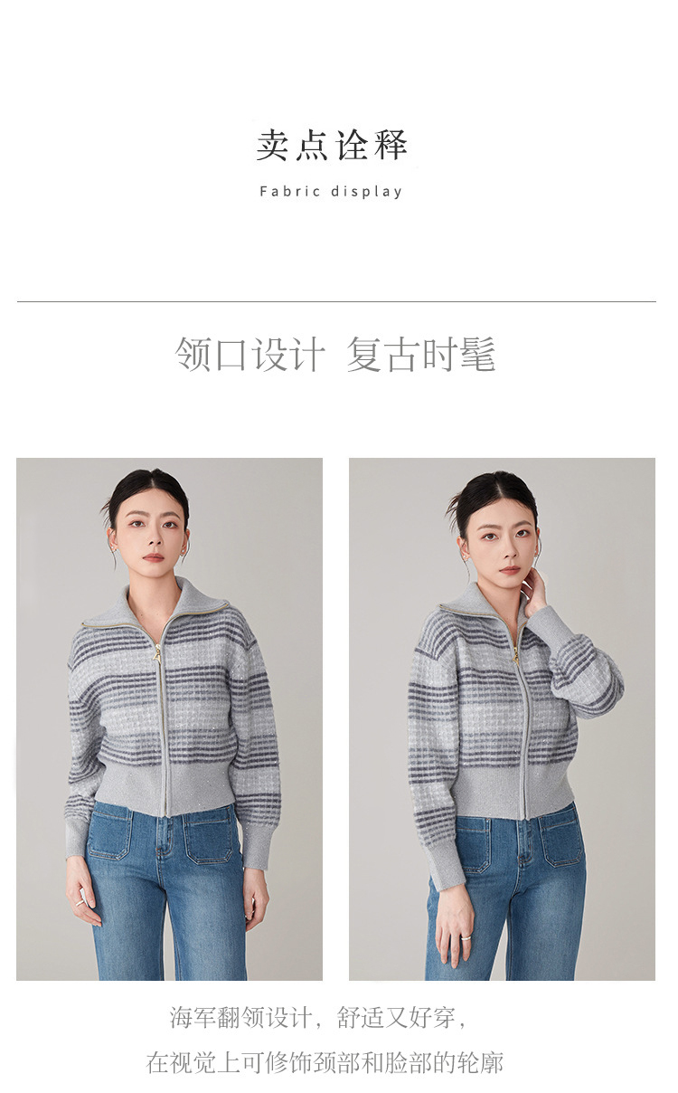 【hrf】全新升级【铂金会员293/天猫399/差价106】(33517) 洛诗琳2024秋季新款休闲时尚羊毛拉链撞色条纹针织衫外套