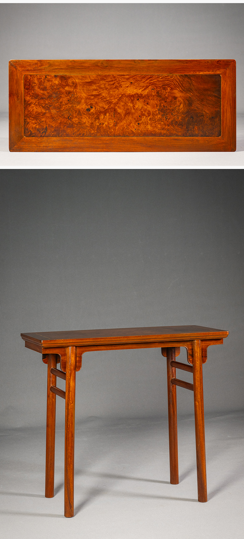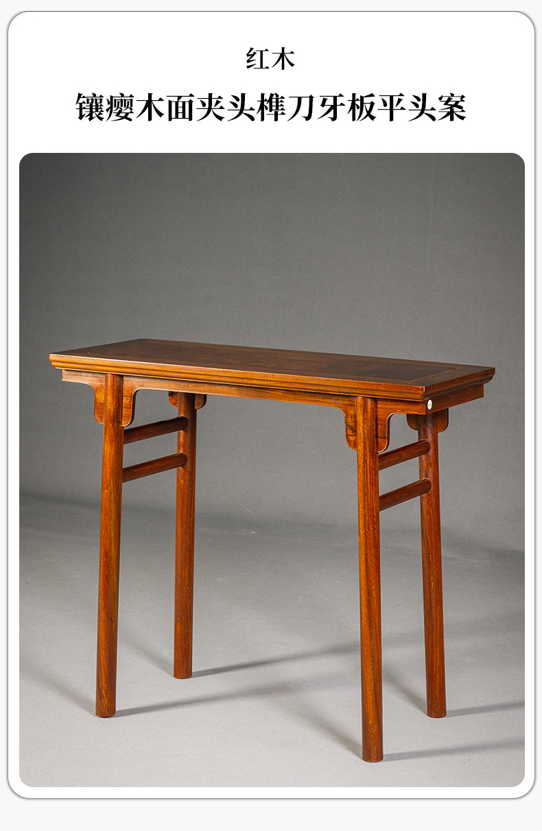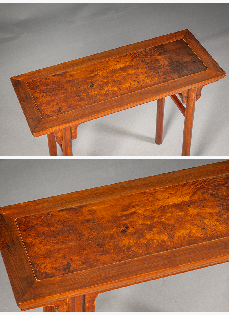 红木镶瘿木面夹头榫刀牙板平头案