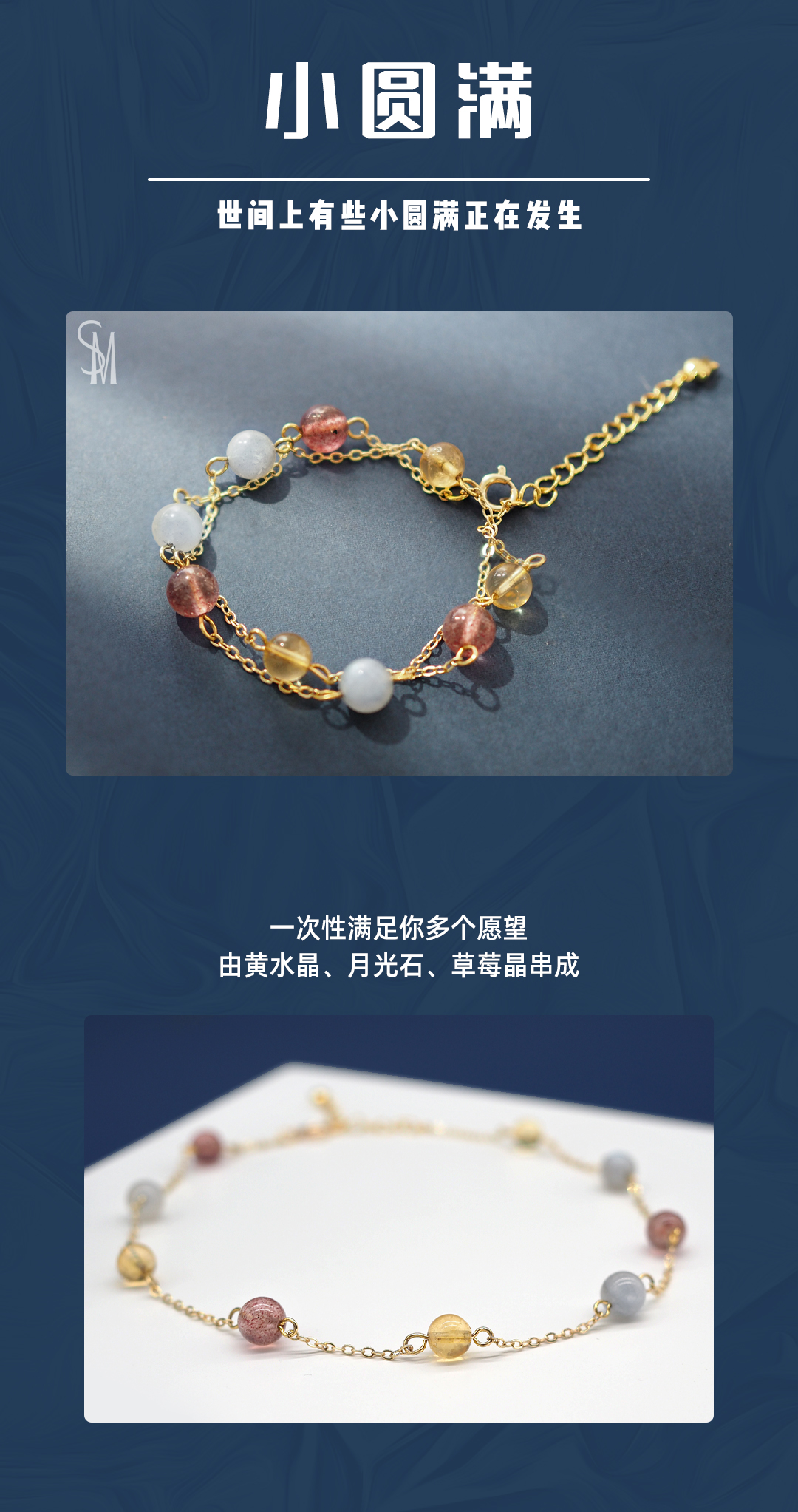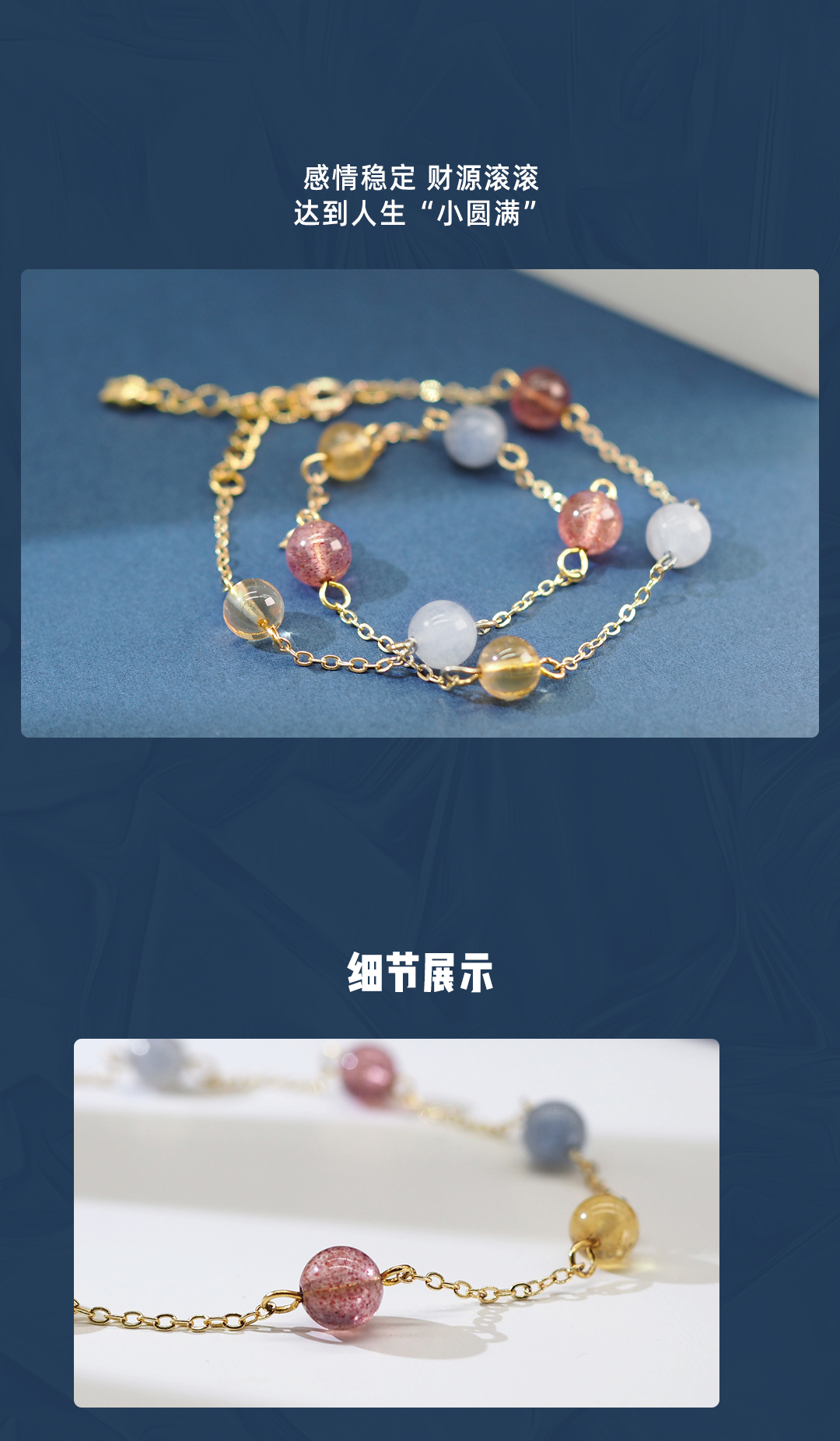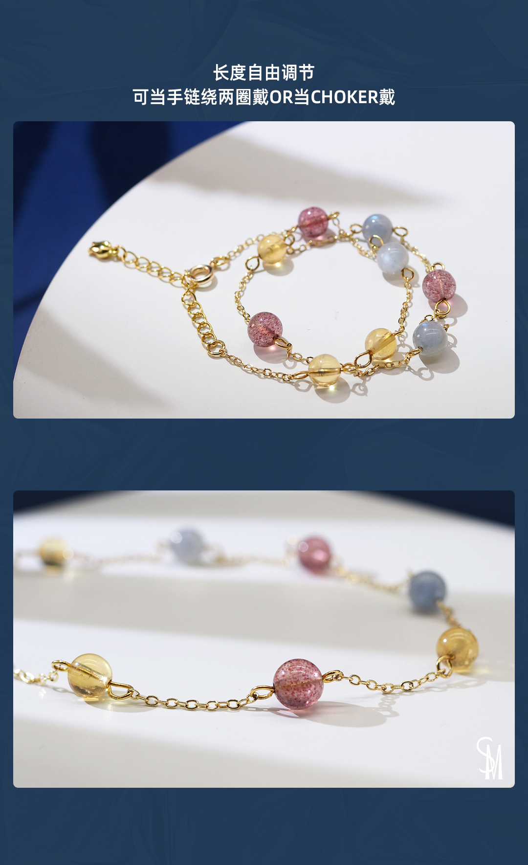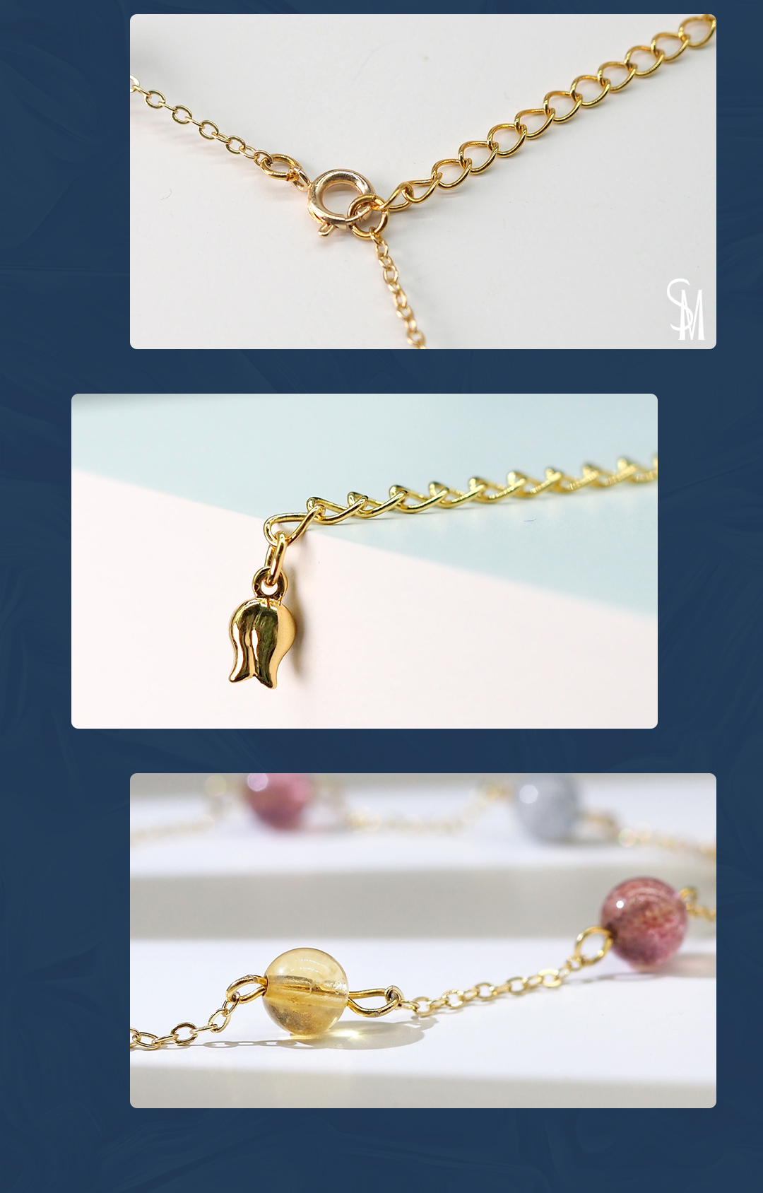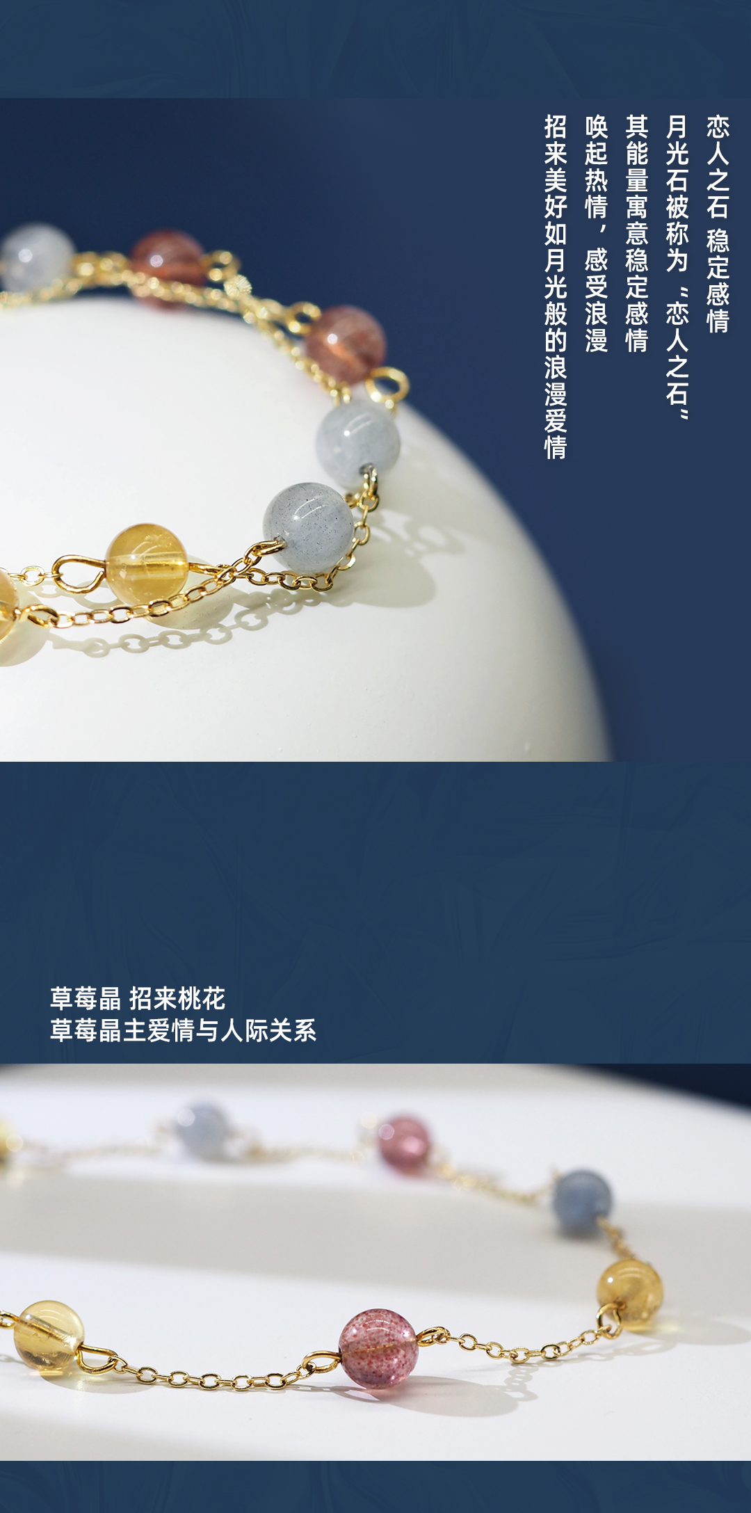 3、本手链为单颗珠体6mm的天然黄水晶、草莓晶及灰月光串成,金属部分为铜镀金,由于尺寸为手工量度,可能略有误差。