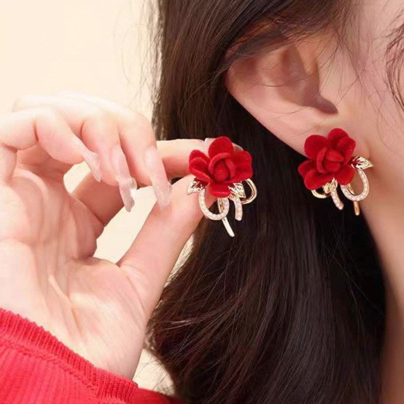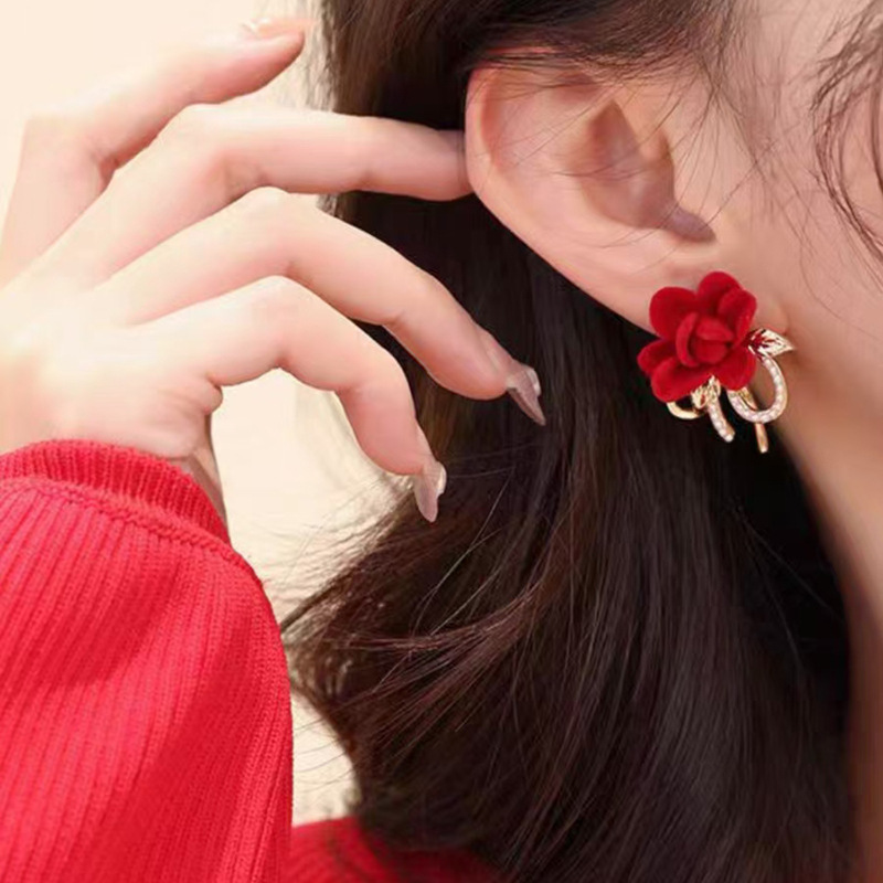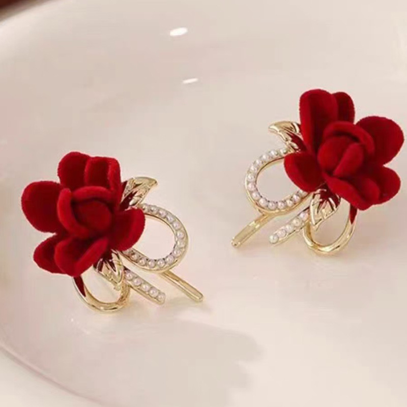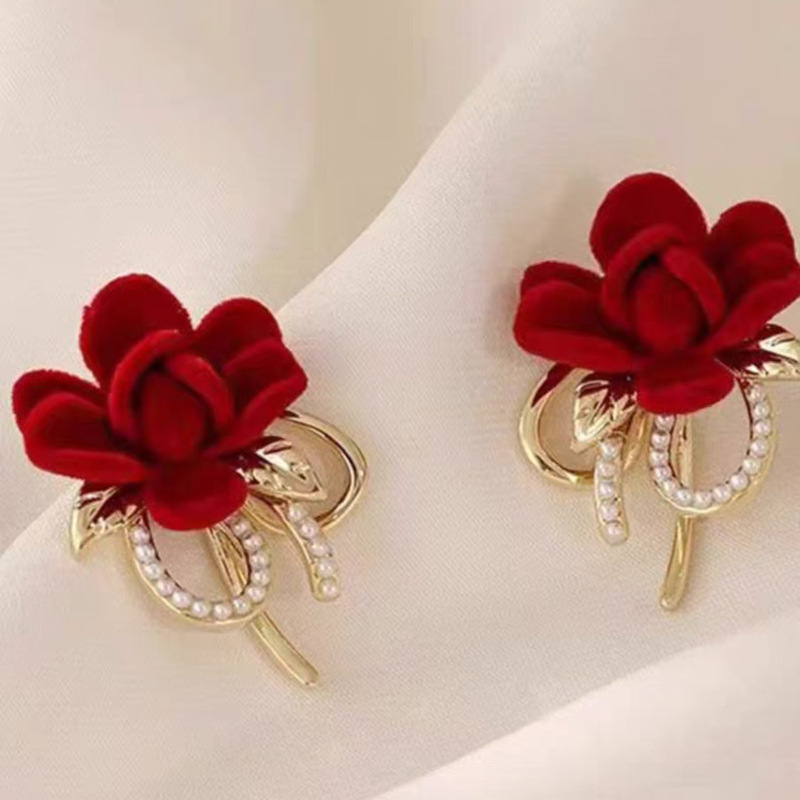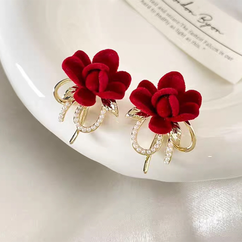 JU-C0210秋冬新款红色花朵耳环女法式气质简约甜美丝绒耳钉复古珍珠耳饰品