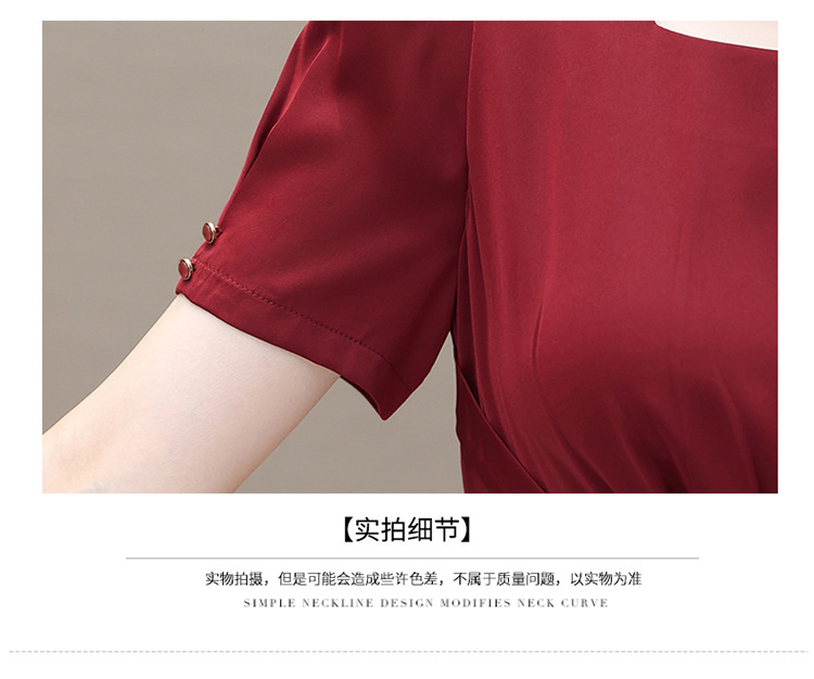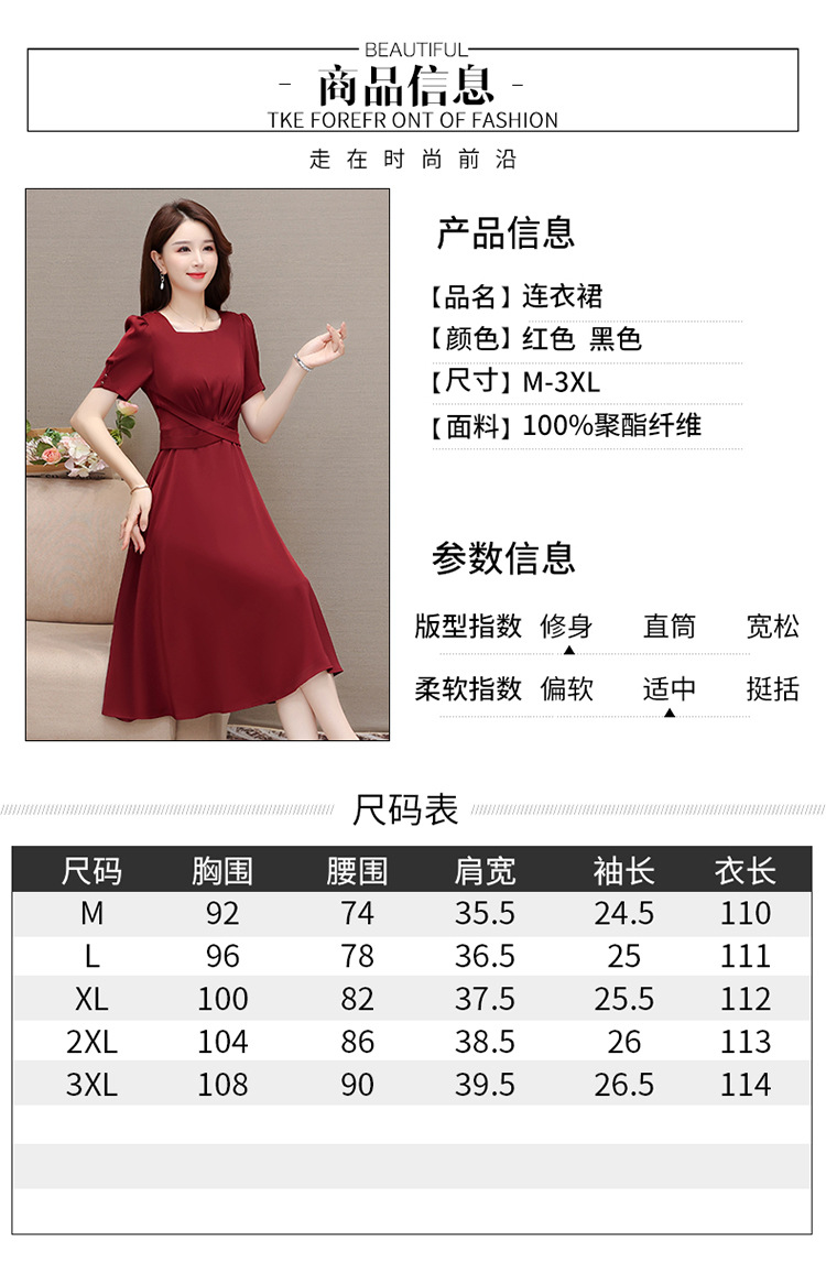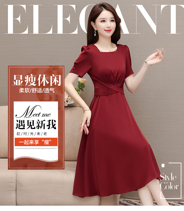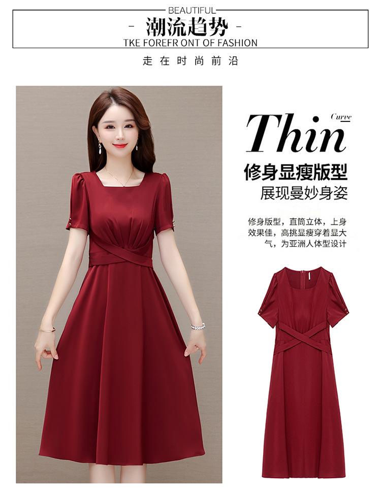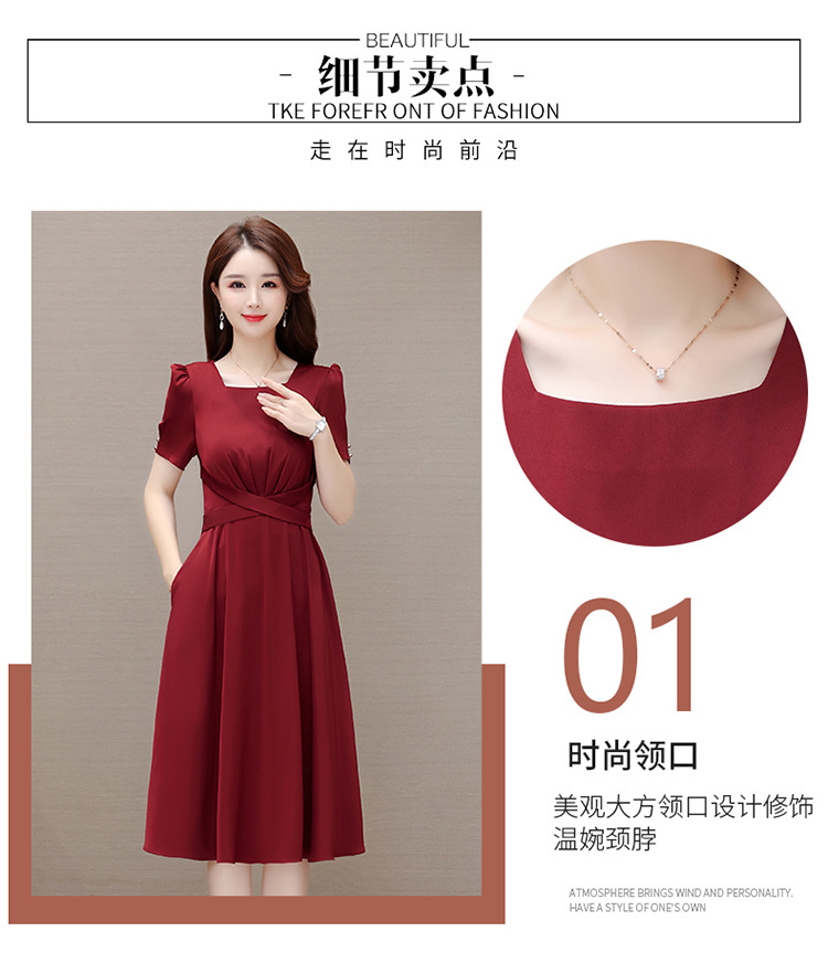 纯色方领连衣裙,收腰时尚中长款短袖百褶裙QYM- JJ-FDP080-Y