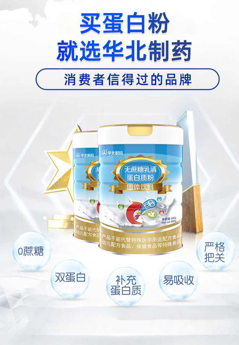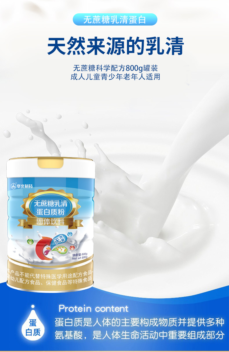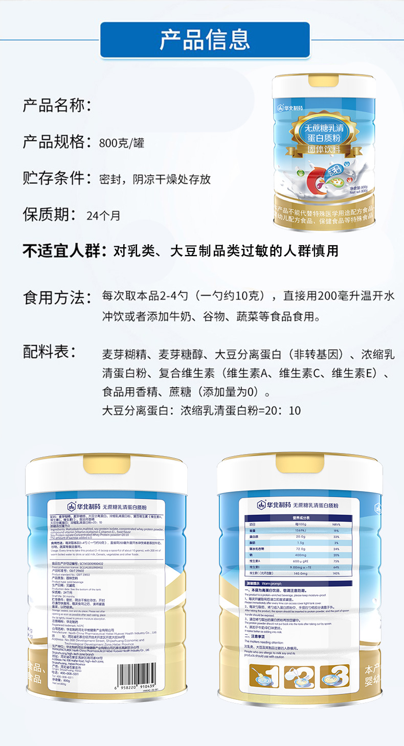 华北制药无蔗糖乳清蛋白质粉 800g/桶 非转基因大豆分离蛋白