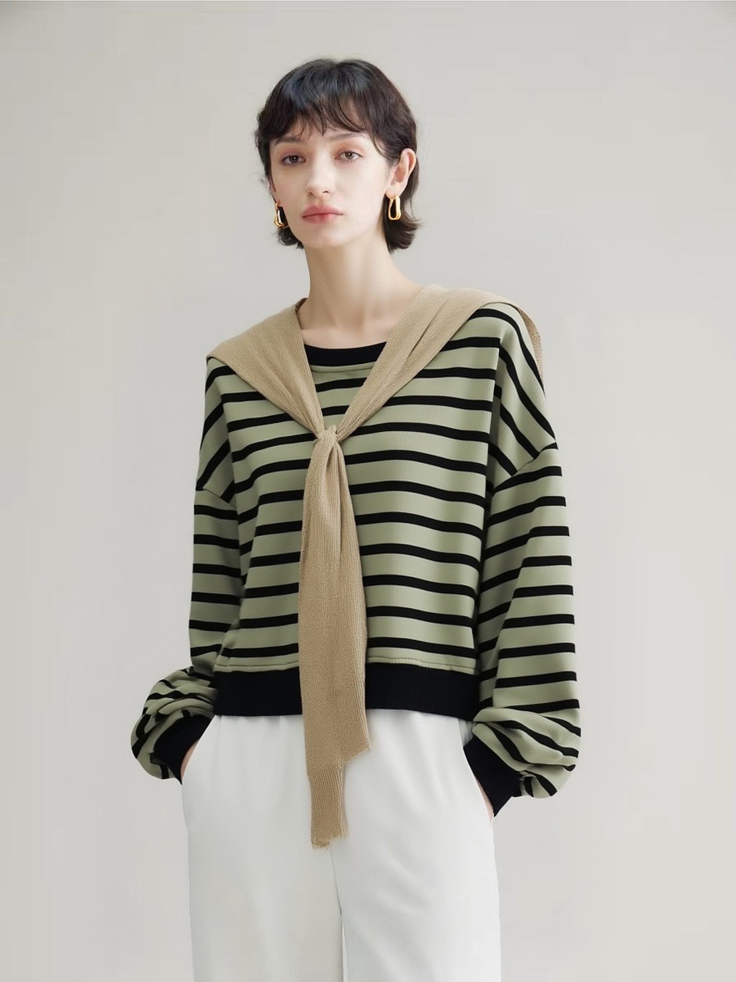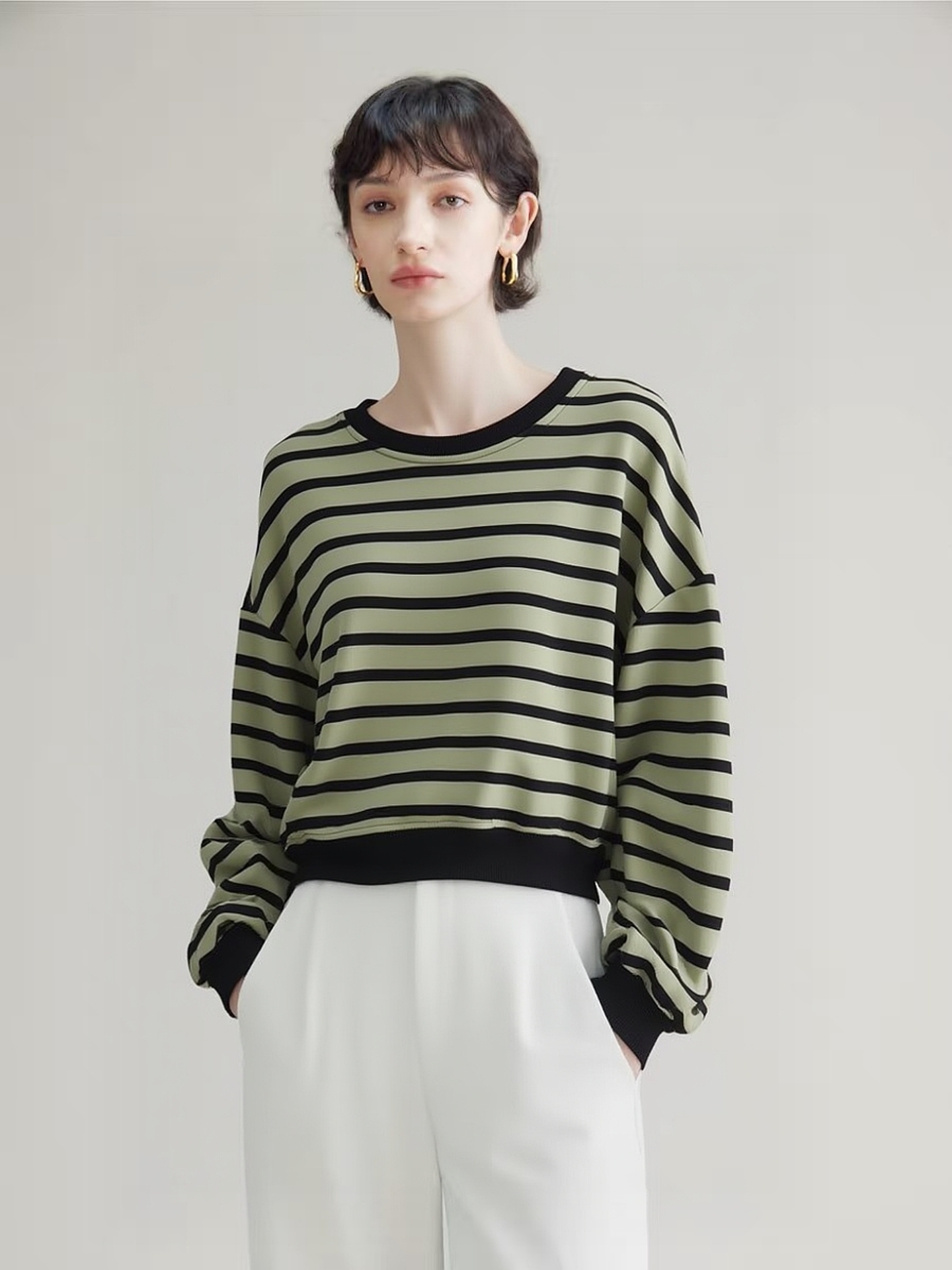【卫衣系列】赠送披肩~条纹宽松短款卫衣-喜出