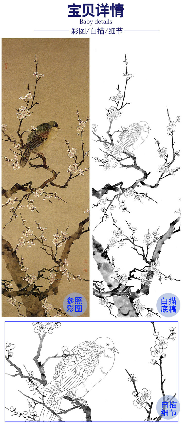陈之佛竖幅工笔花鸟白描底稿《梅树栖鸠》-多种白描尺寸可选-QA74