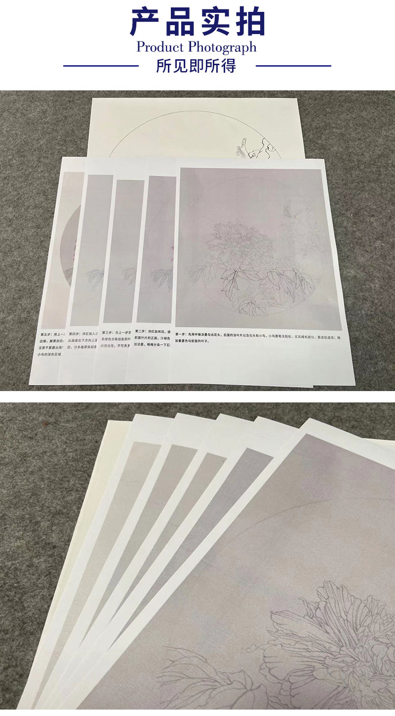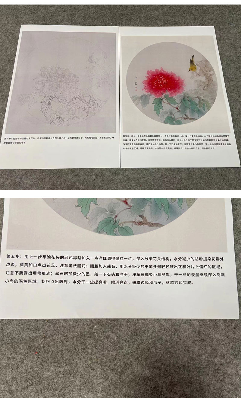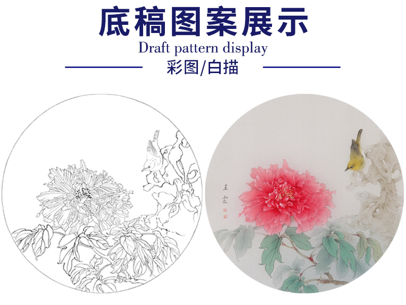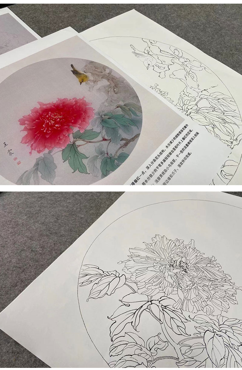 【有步骤】王震工笔画白描底稿圆形小品《牡丹圆光》牡丹翠鸟初学者临摹花鸟线稿WZ12