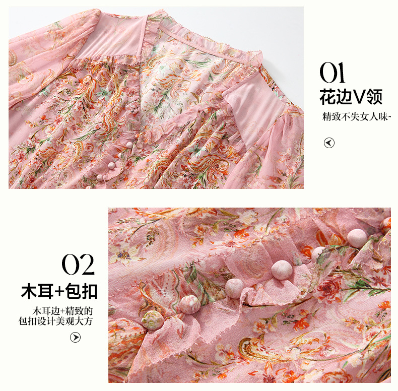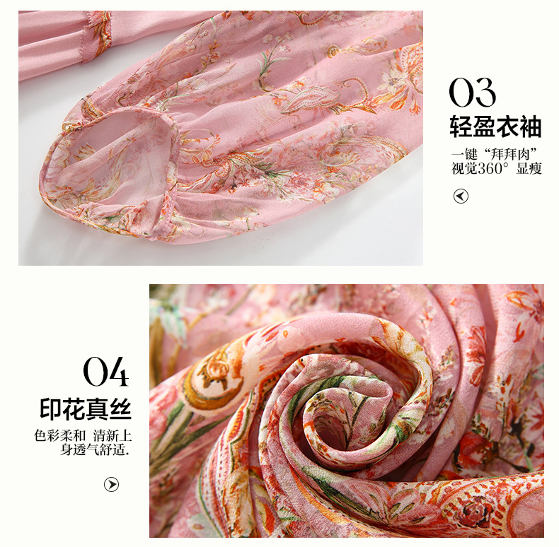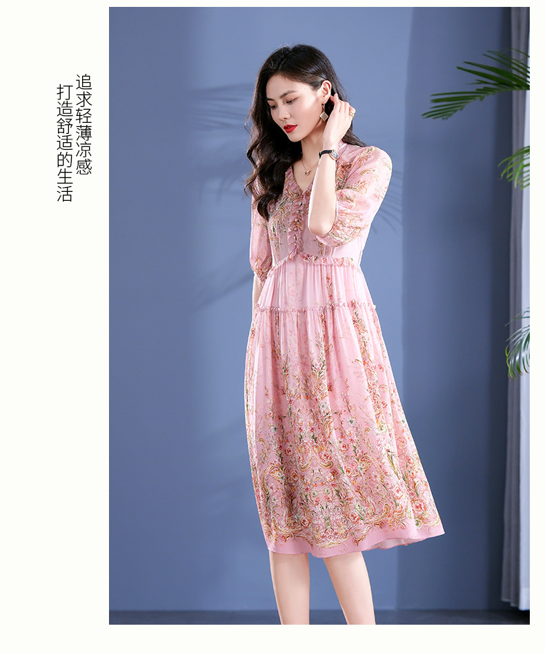 丁摩100%桑蚕丝超重工减龄花边真丝印花中长款大摆连衣裙收腰款5ZF-90275