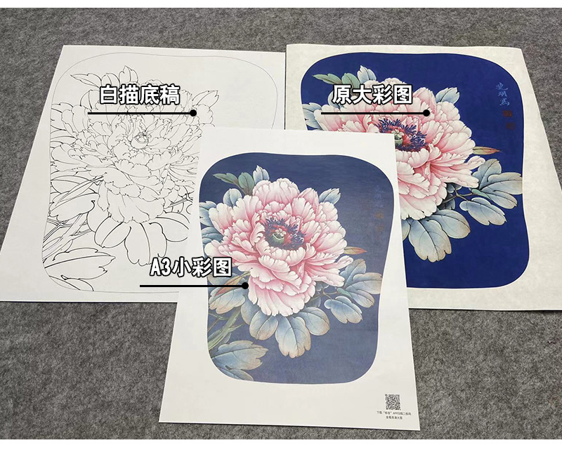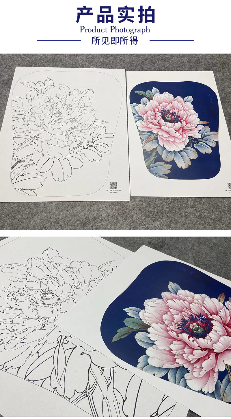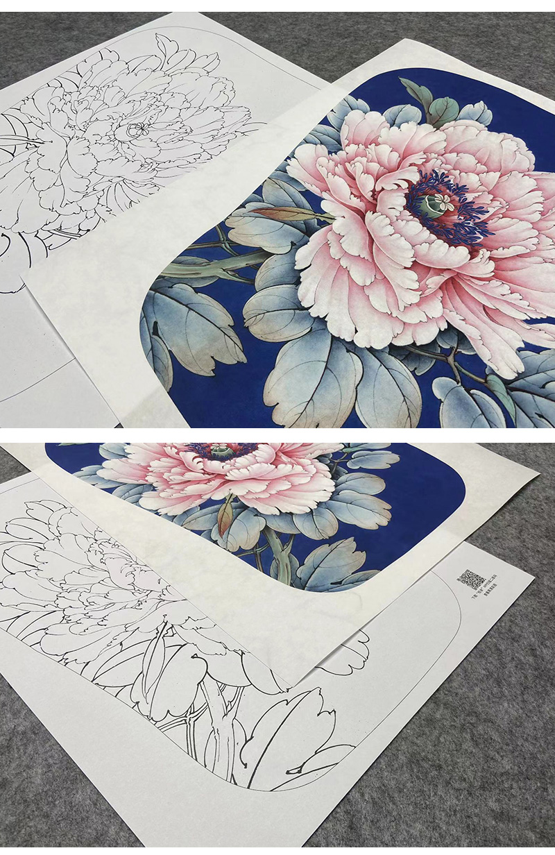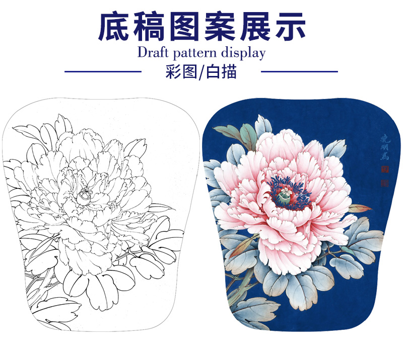 【大彩图】李晓明工笔画白描底稿宫扇《胜丹炉》牡丹临摹勾线花鸟线稿K010