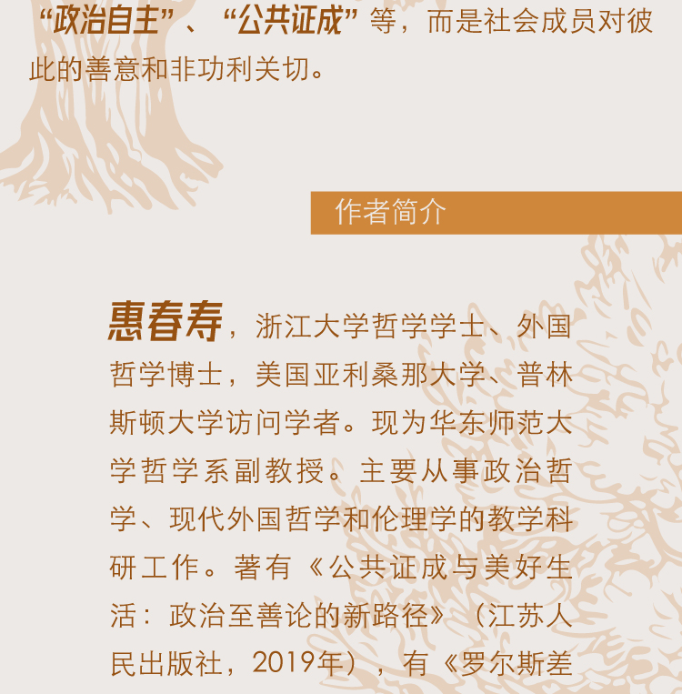 惠春寿,浙江大学哲学学士、外国哲学博士,美国亚利桑那大学、普林斯顿大学访问学者。现为华东师范大学哲学系副教授。主要从事政治哲学、现代外国哲学和伦理学的教学科研工作。著有《公共证成与美好生活:政治至善论的新路径》(江苏人民出版社,2019年),有《罗尔斯差别原则的解放旨趣》(《学术月刊》,2025年第7期)、《原初状态:从契约到建构》(《哲学研究》,2025年第3期)、《公共理性:共识还是聚合》(《哲学动态》,2024年第7期)、《公共理性不是“理性的公共使用”》(《世界哲学》,2024年第3期)等多篇论文发表。