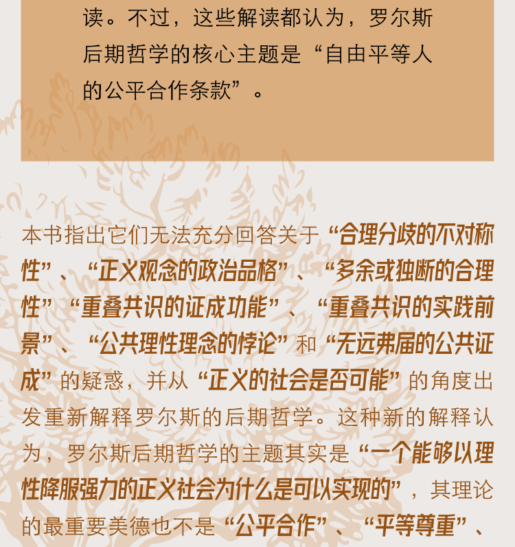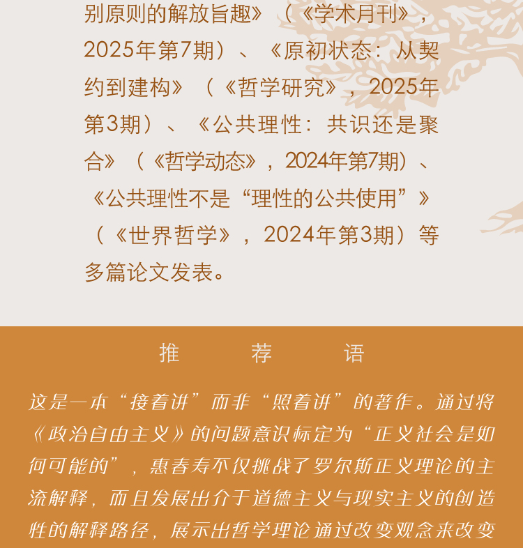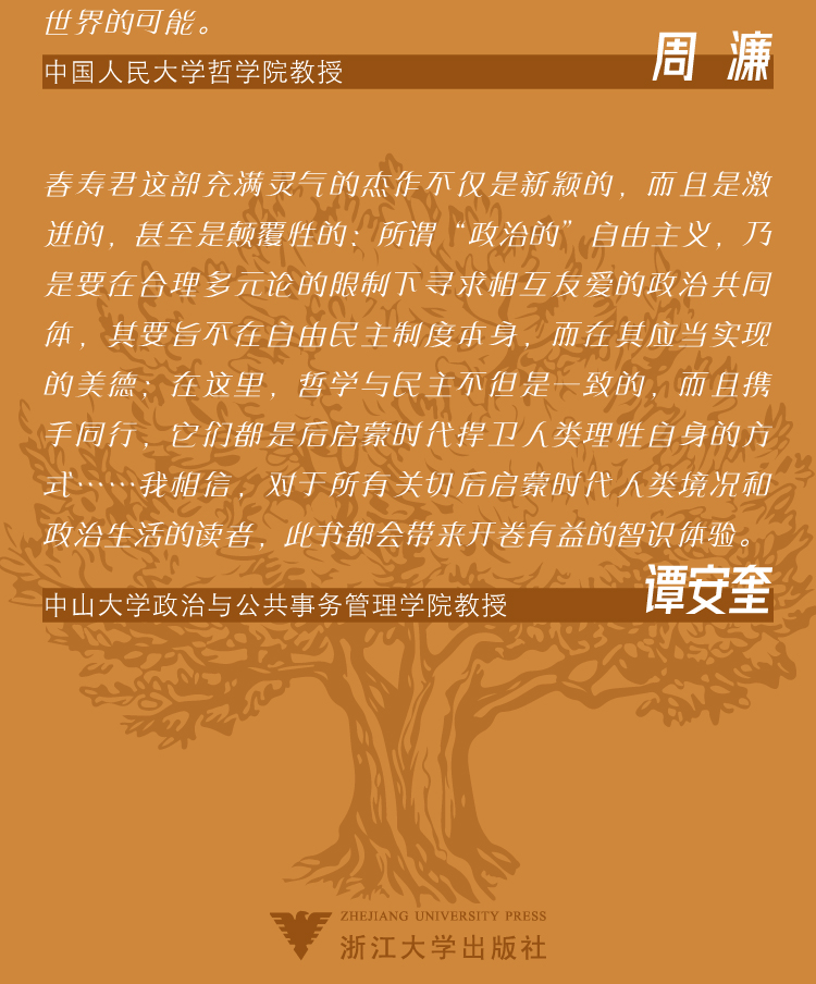 春寿君这部充满灵气的杰作不仅是新颖的,而且是激进的,甚至是颠覆性的:所谓“政治的”自由主义,乃是要在合理多元论的限制下寻求相互友爱的政治共同体,其要旨不在自由民主制度本身,而在其应当实现的美德;在这里,哲学与民主不但是一致的,而且携手同行,它们都是后启蒙时代捍卫人类理性自身的方式……我相信,对于所有关切后启蒙时代人类境况和政治生活的读者,此书都会带来开卷有益的智识体验。
