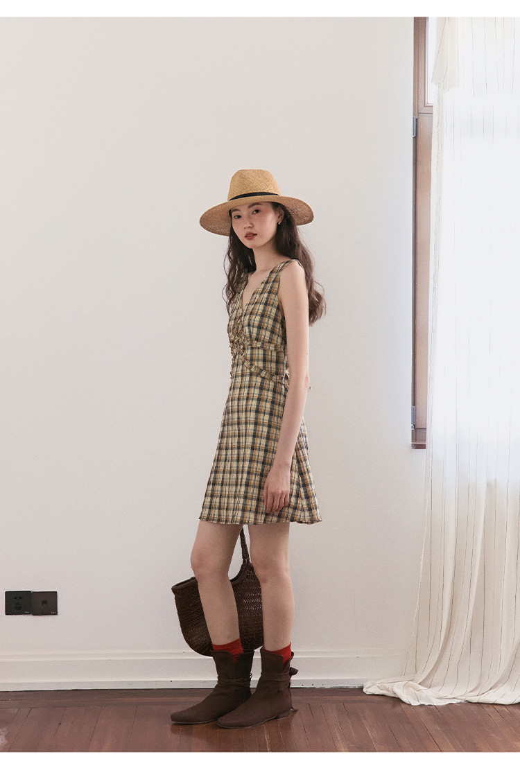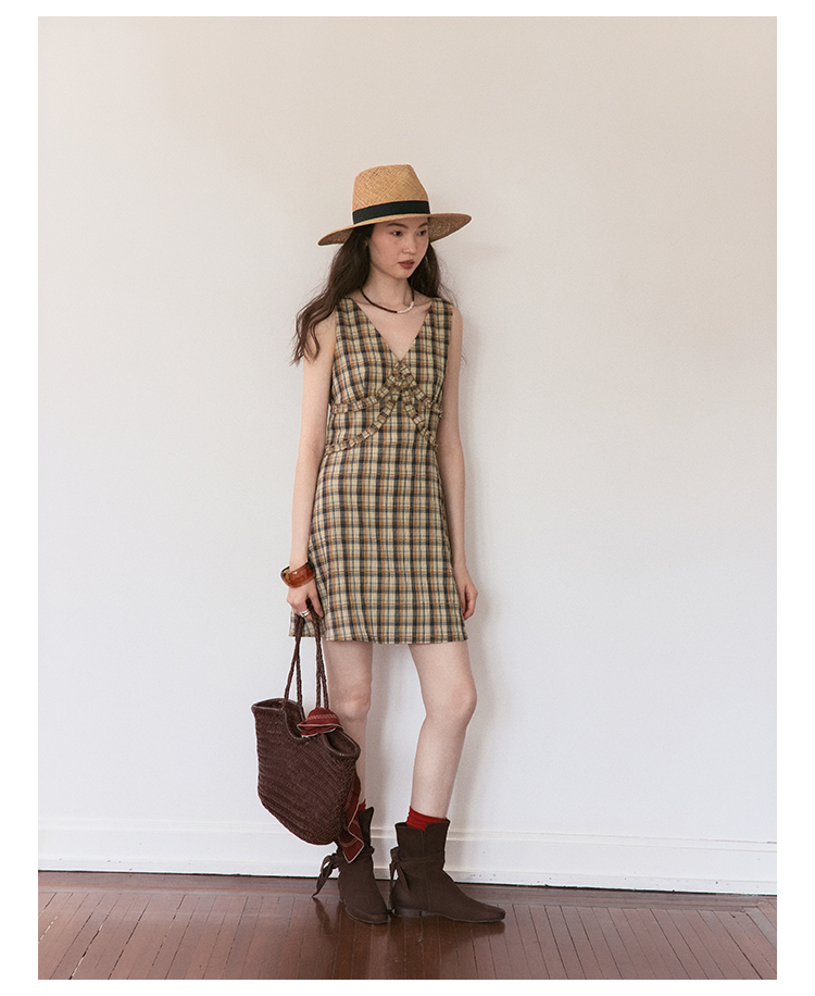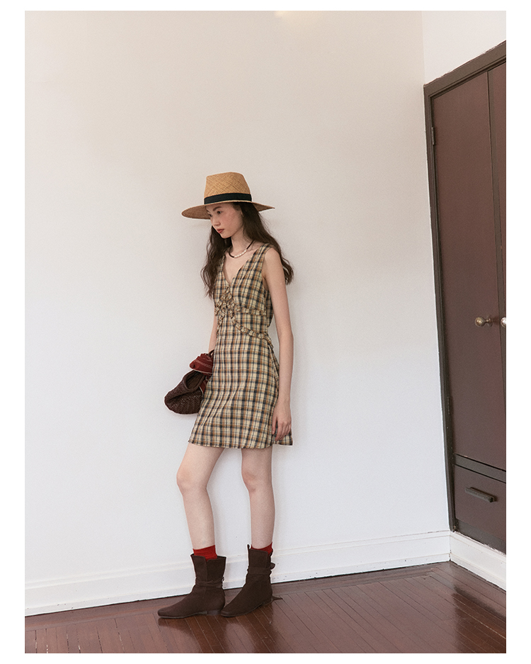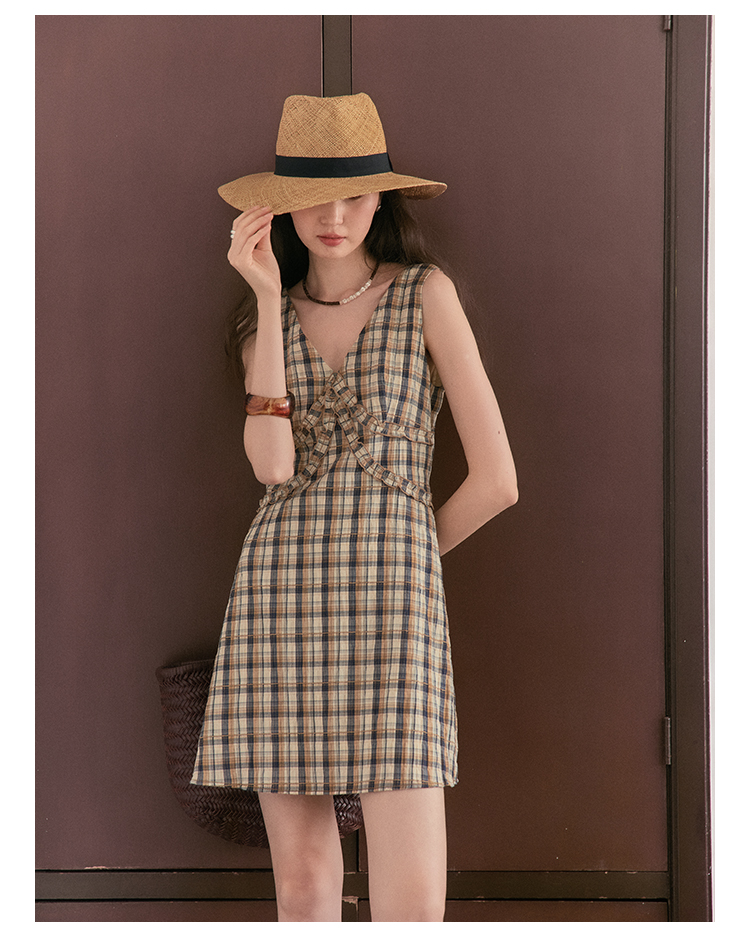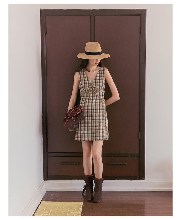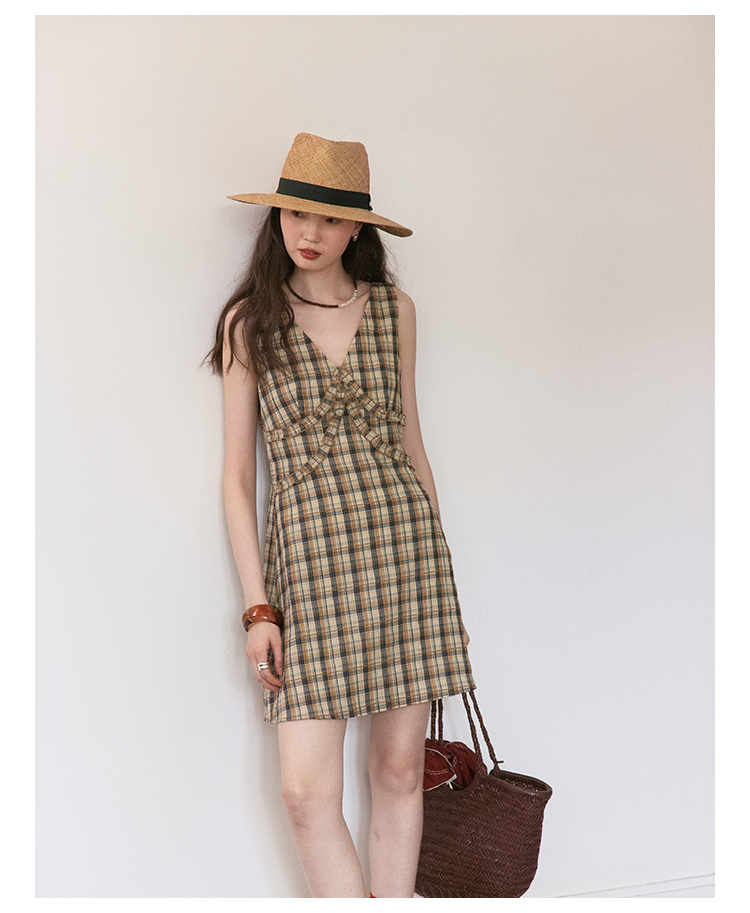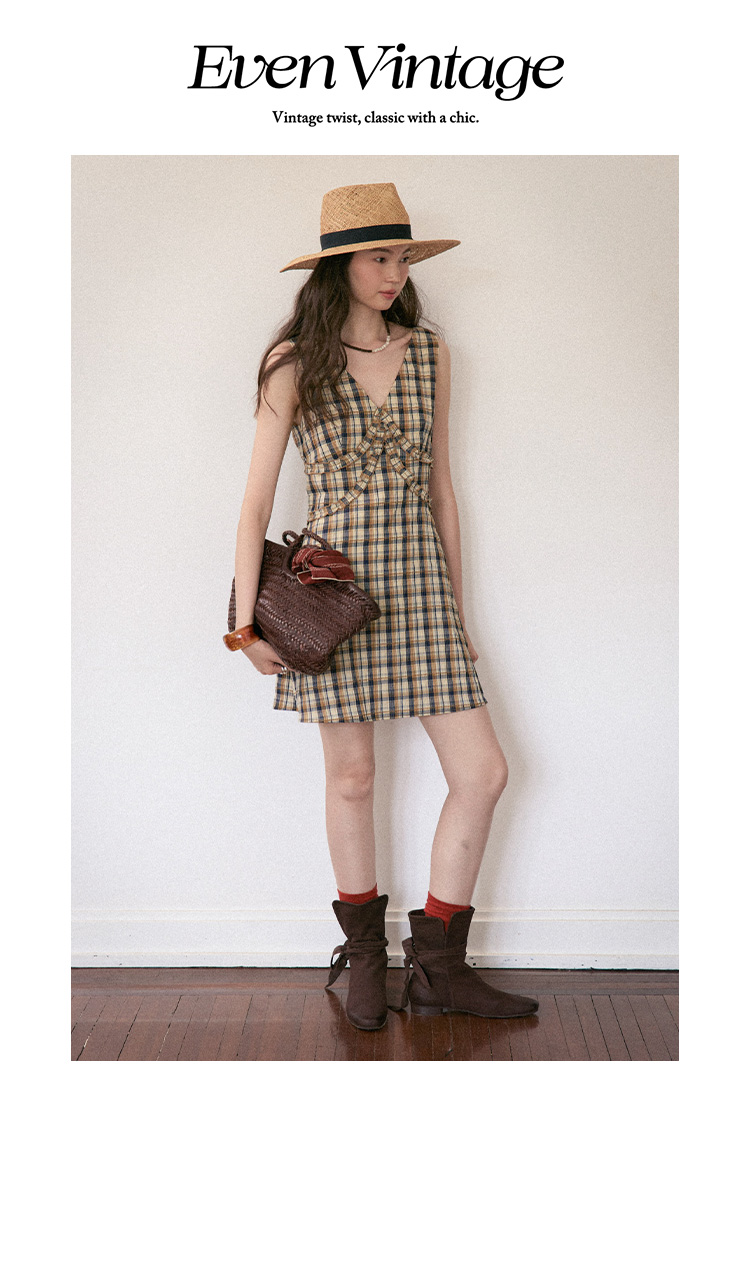 【现货】Even Vintage | 复古泡泡格纹 优雅甜美V领肌理无袖背心连衣裙夏
