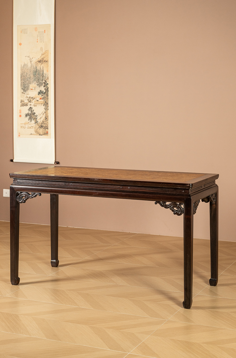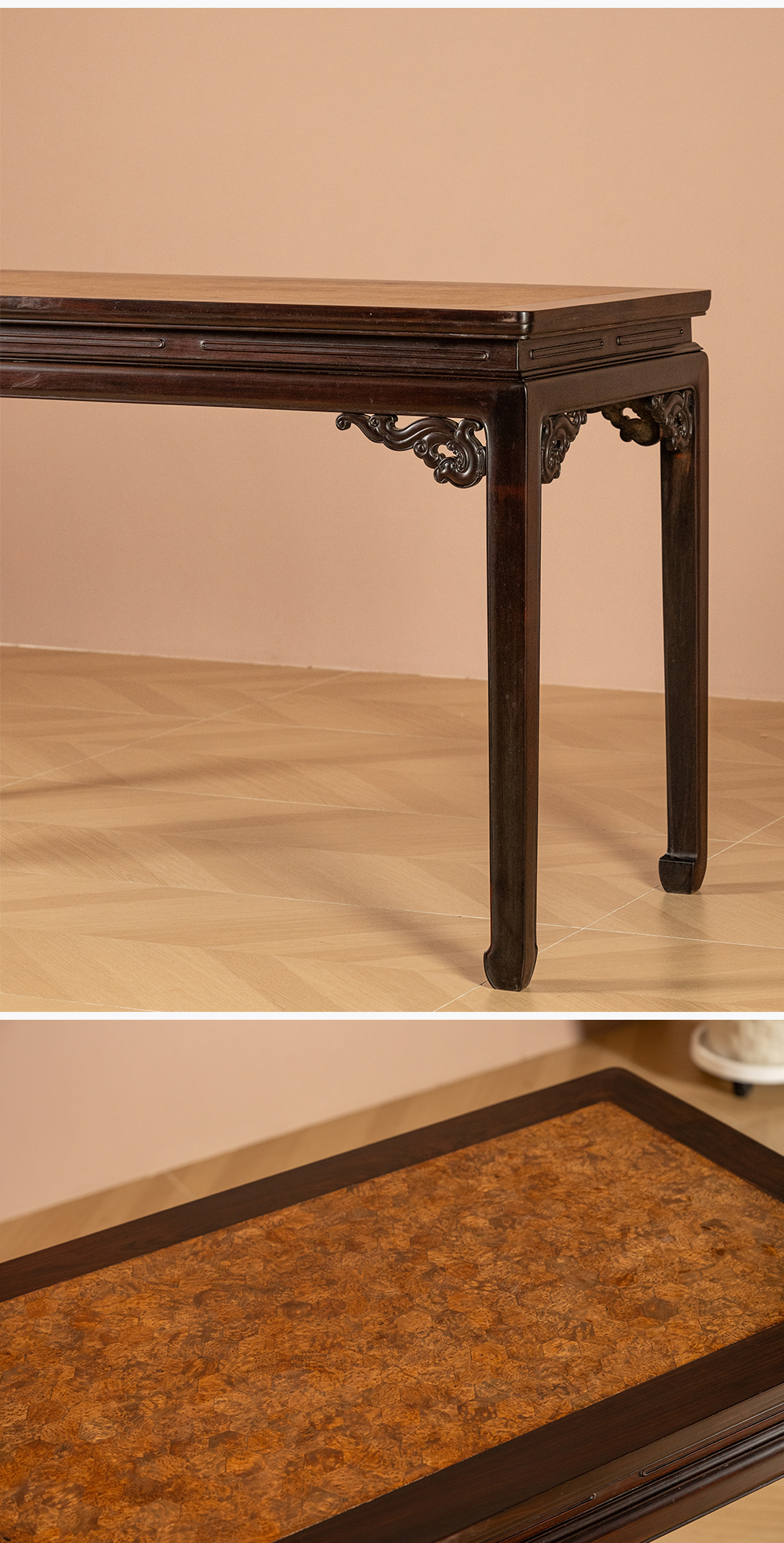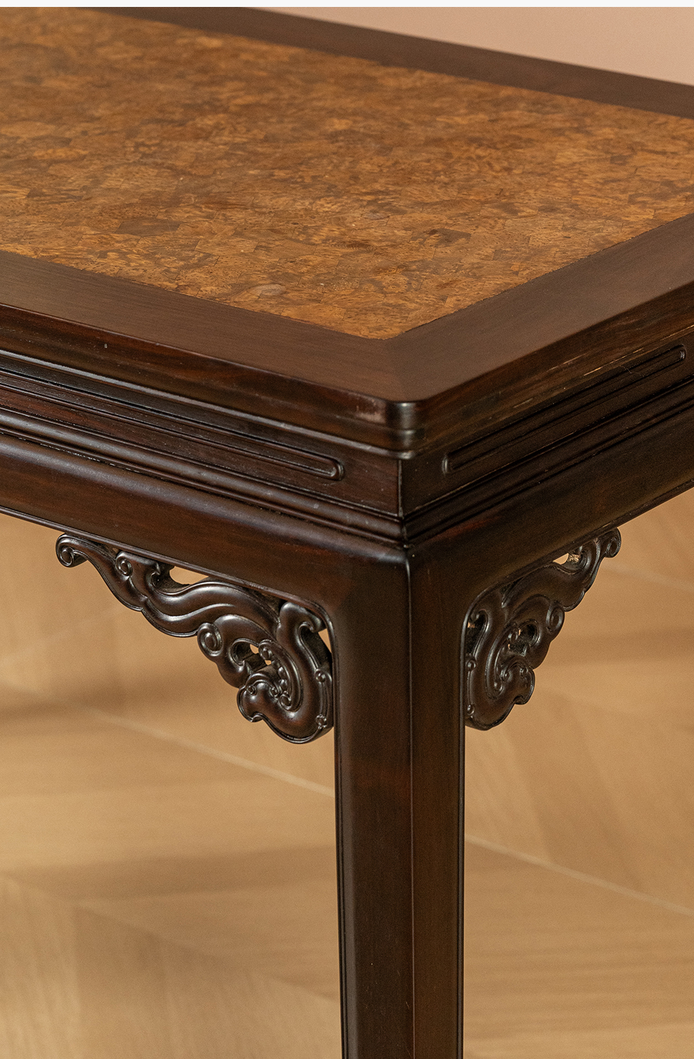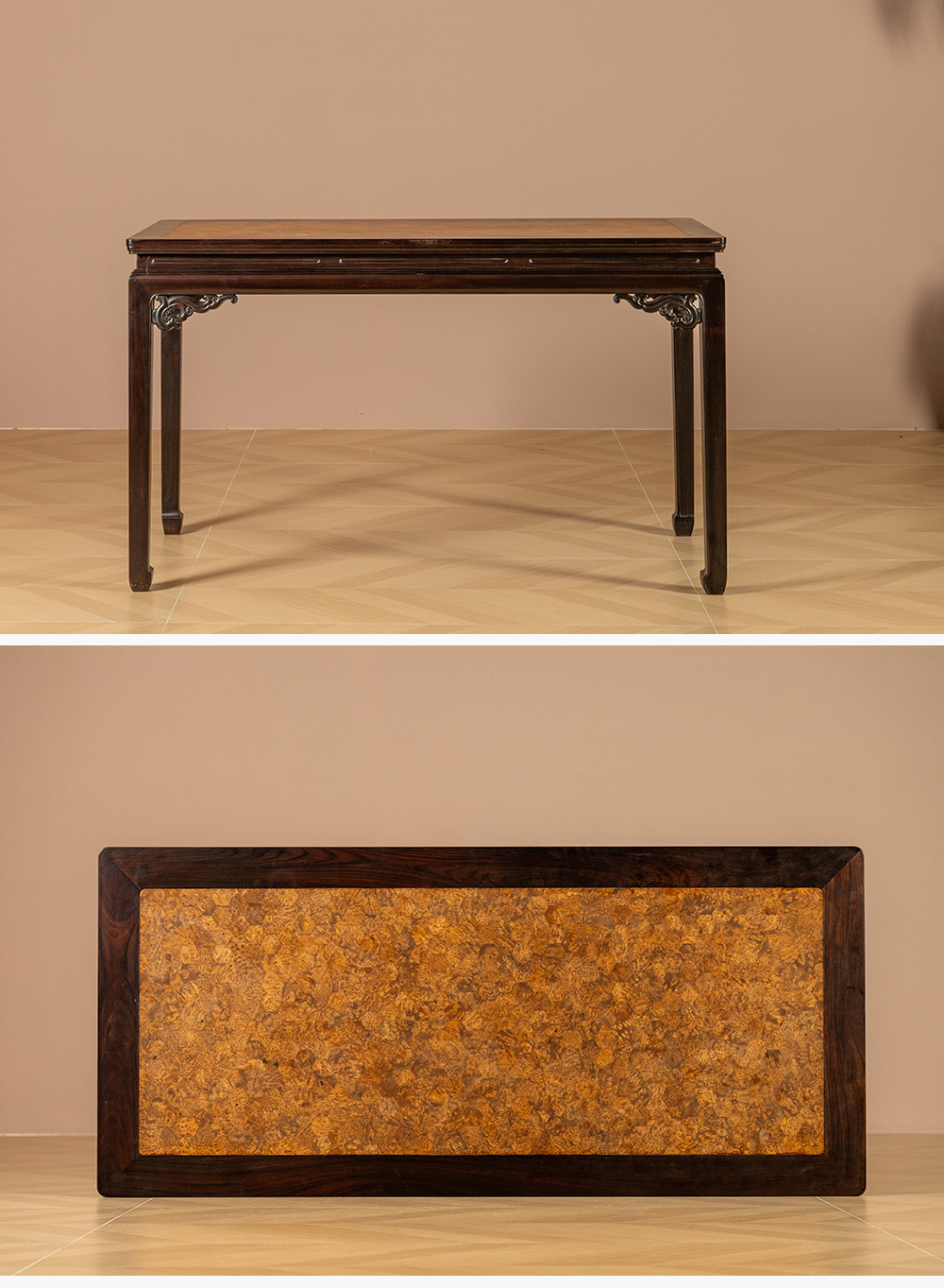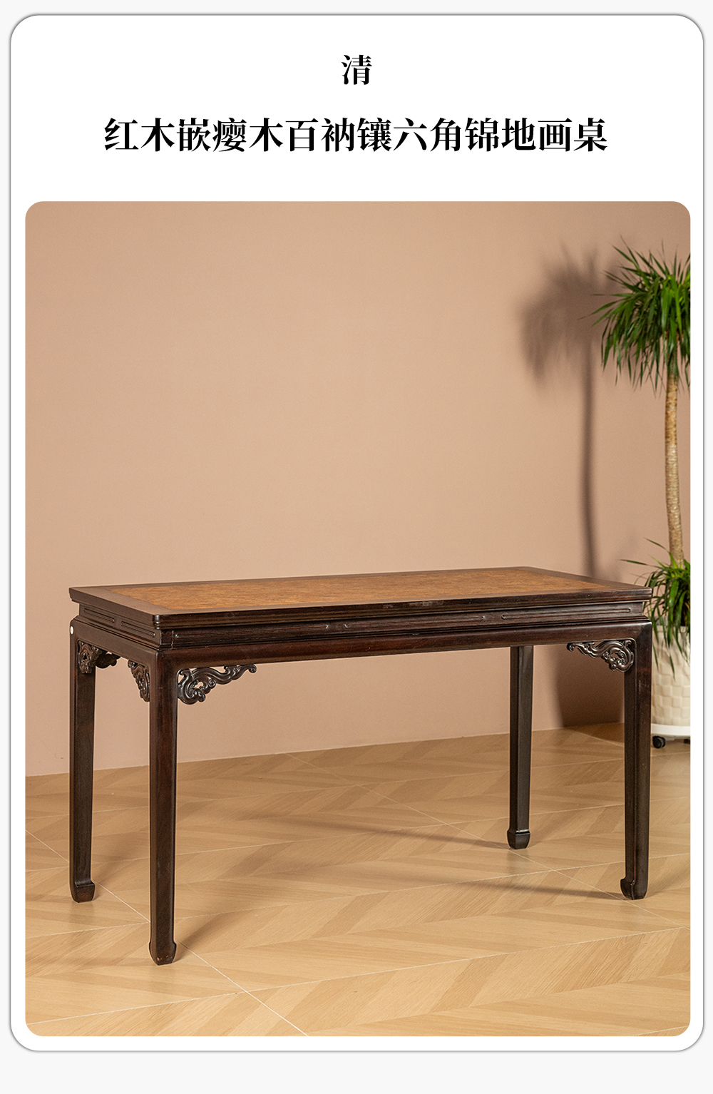 清 红木嵌瘿木百衲镶六角锦地画桌