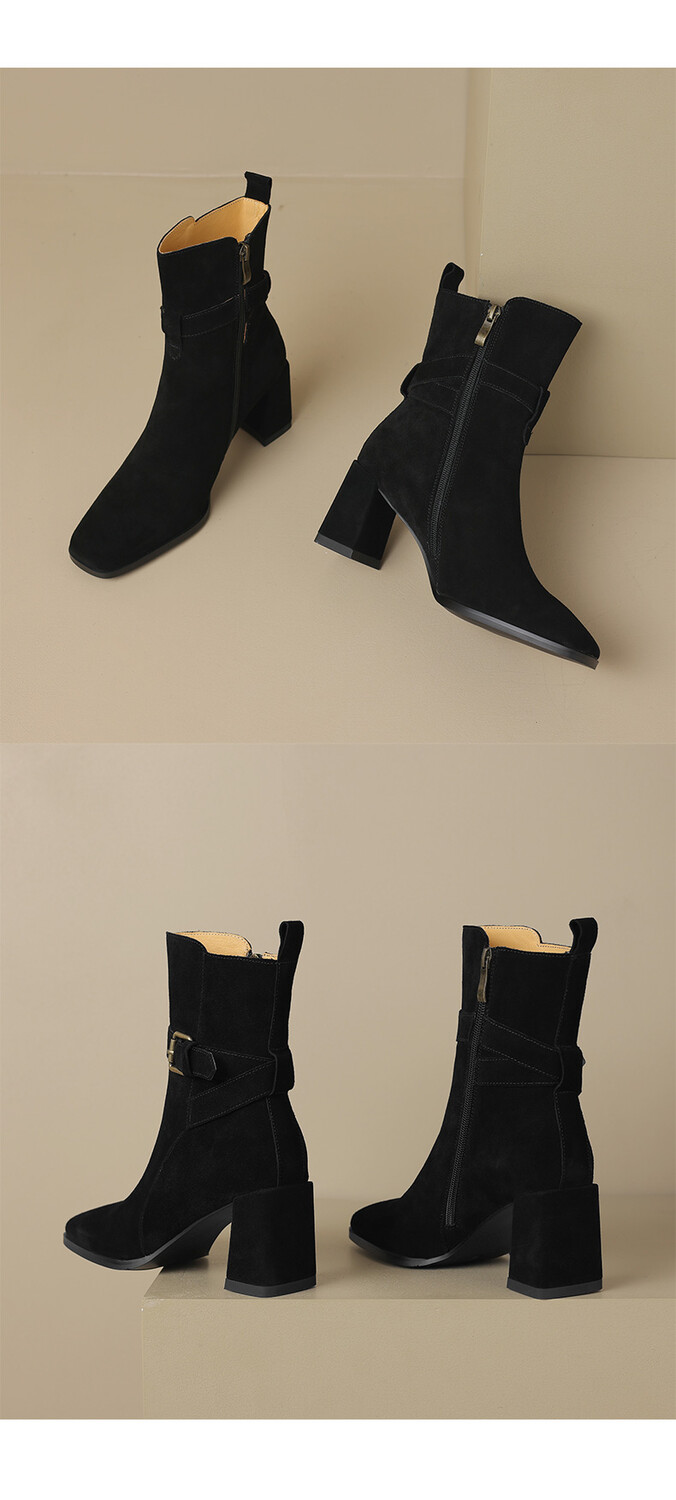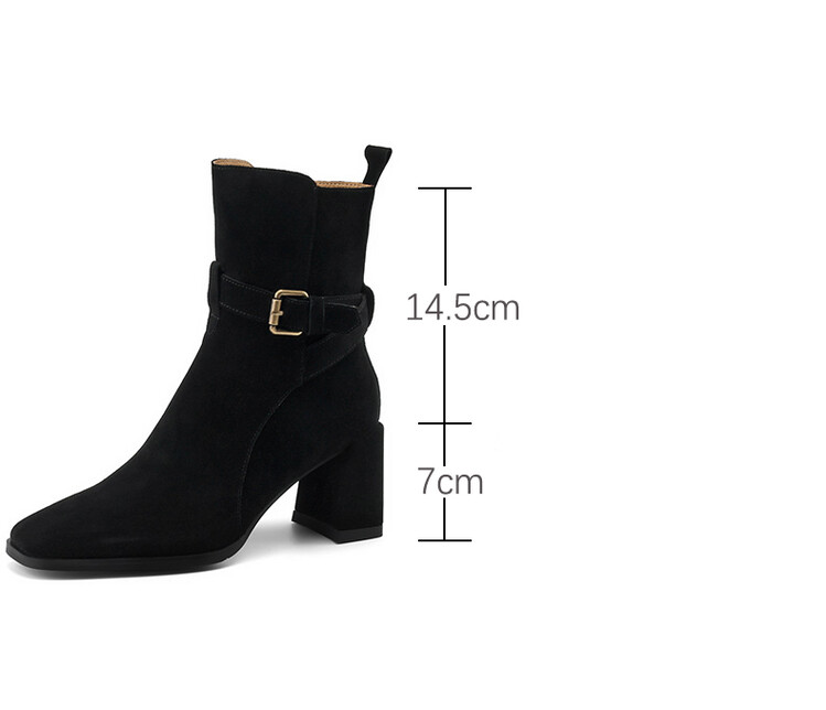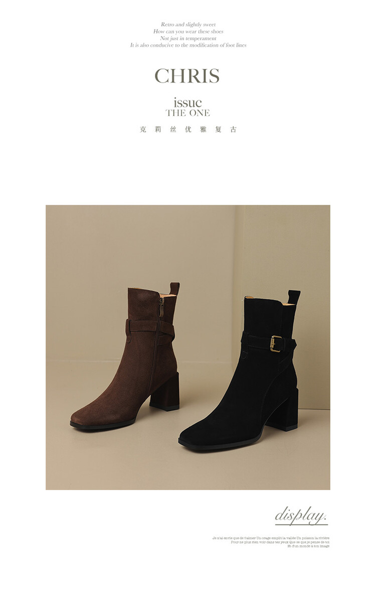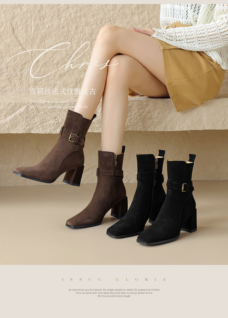 【预售5天】美拉德复古女靴粗跟方头皮带扣侧拉链短靴牛翻皮时尚高跟切尔西靴FDME&FD8357
