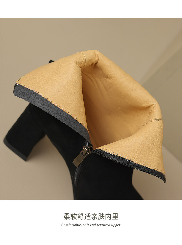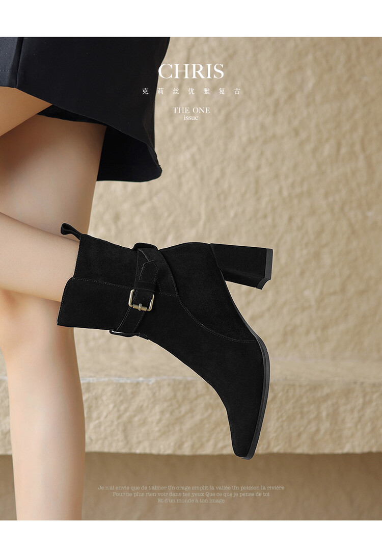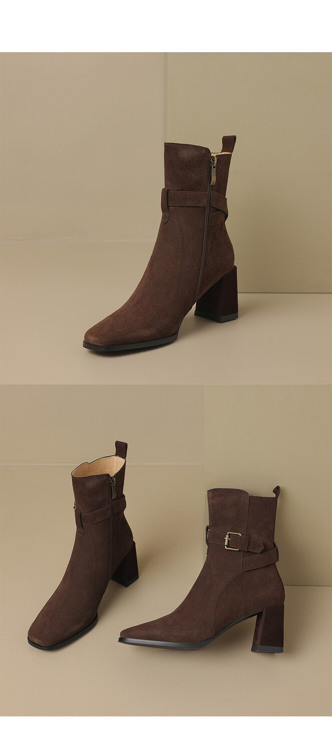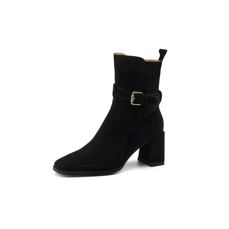 【预售5天】美拉德复古女靴粗跟方头皮带扣侧拉链短靴牛翻皮时尚高跟切尔西靴FDME&FD8357