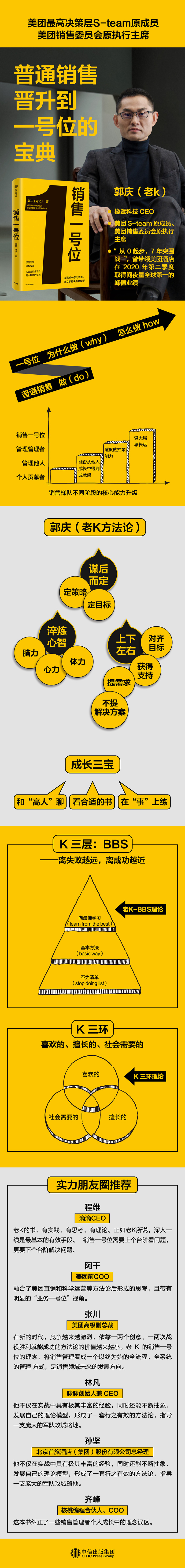 1.在美团内部,郭庆(老K)的业务能力可谓无人不知,公认“老K是能打硬仗”的人。也是是晋升快的VP(8年5次晋升),是一个以VP身份加入S-team的成员。《销售一号位》是作者从业20年来的经验总结,书中涵盖了多个典的模型和方法论,并通过实战案例进行阐述,是普通销售晋升到一号位的宝典。