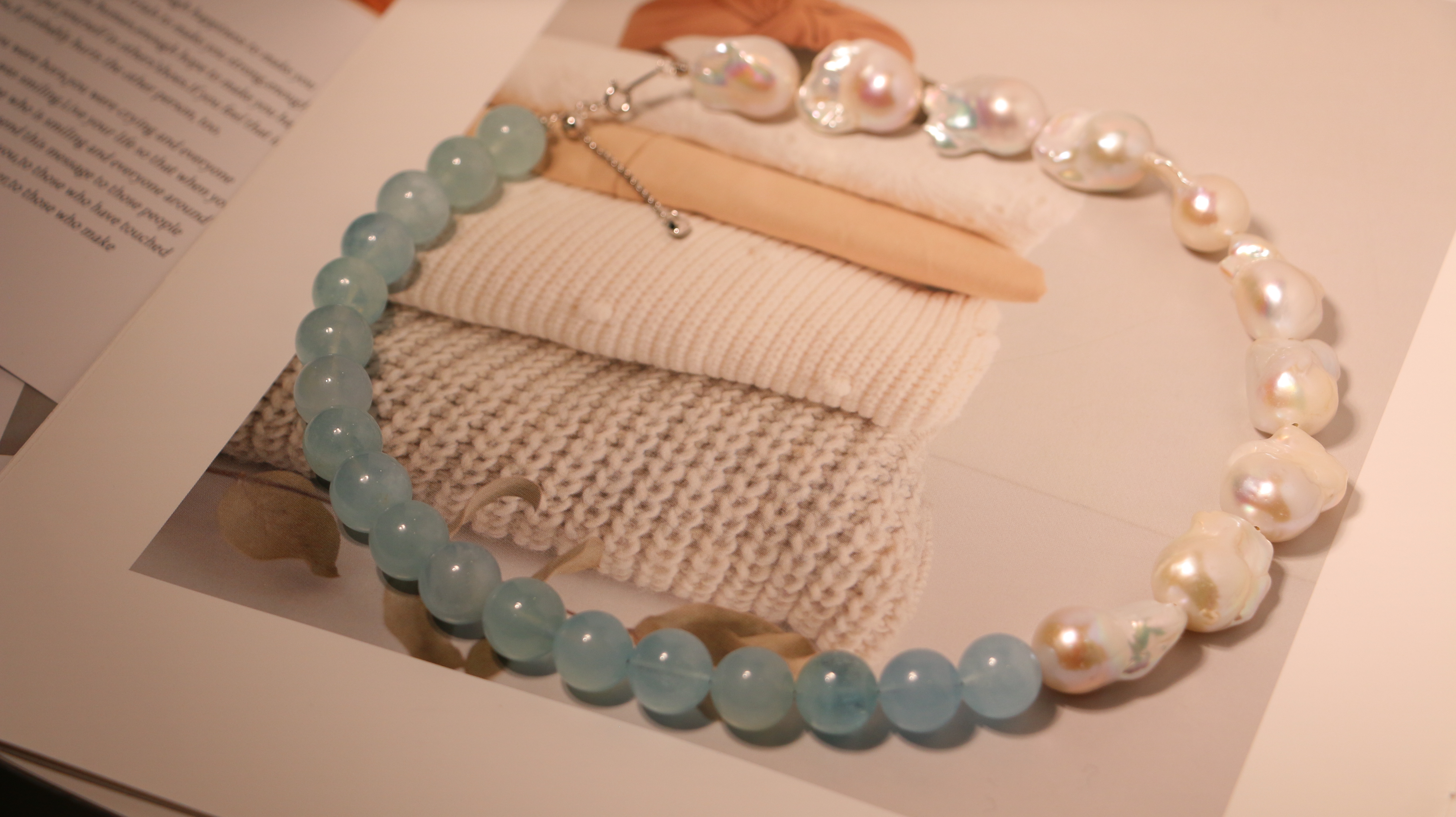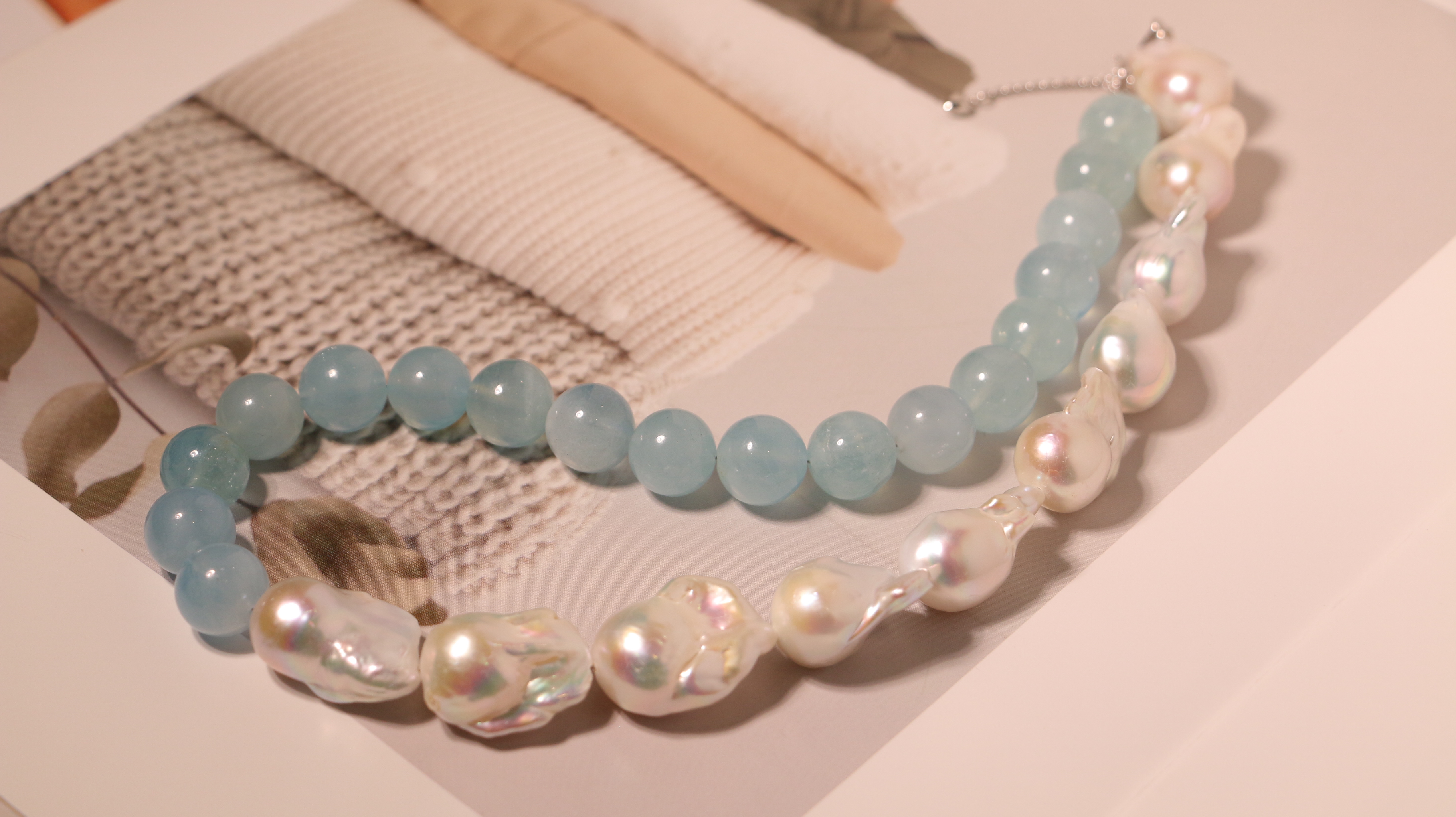 甄珠贝 很梦幻的一串项链 大巴,约13mm,chao油亮,滑皮,ji光炫彩+海蓝宝水晶11mm