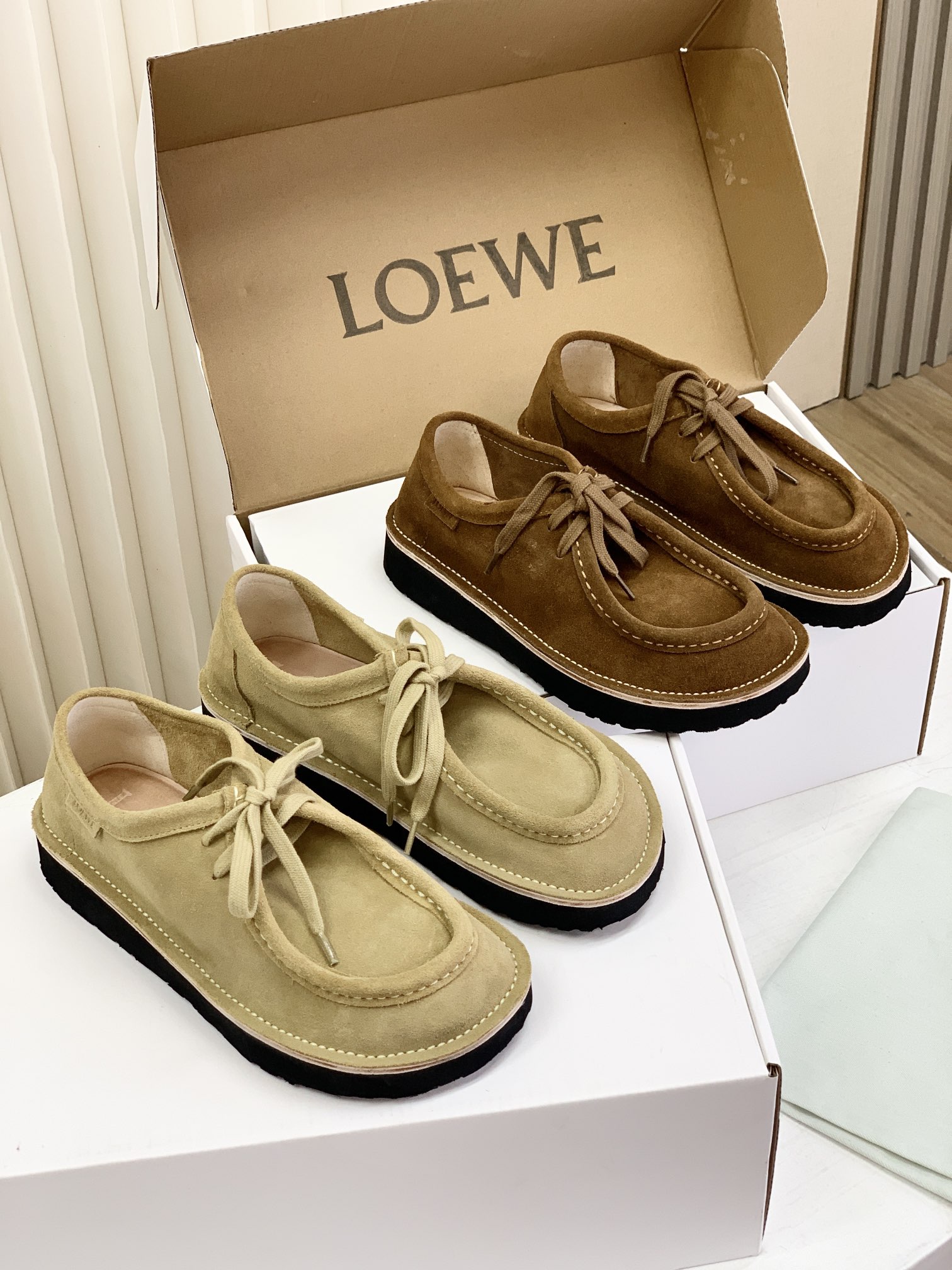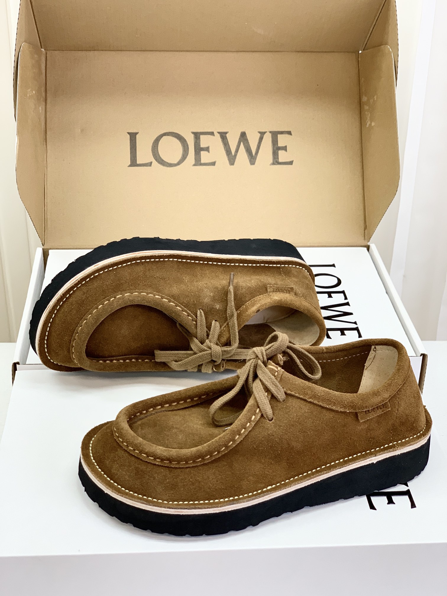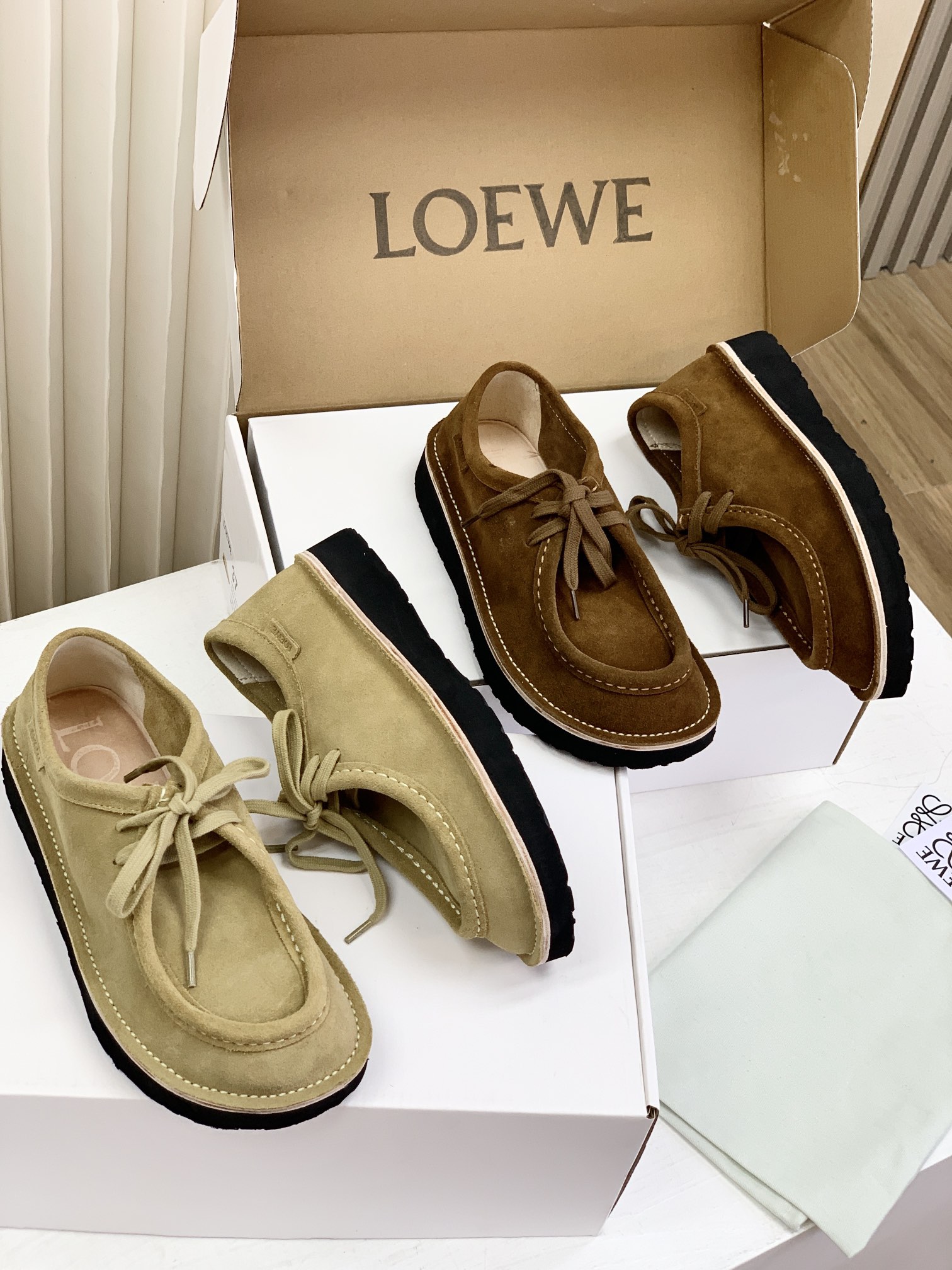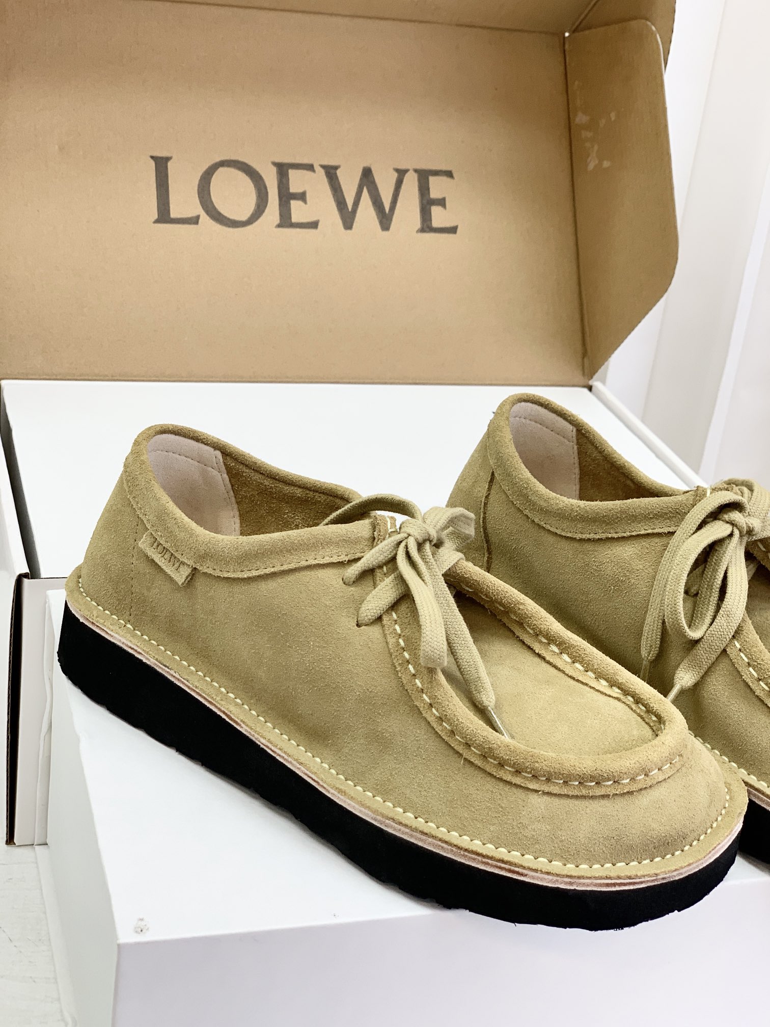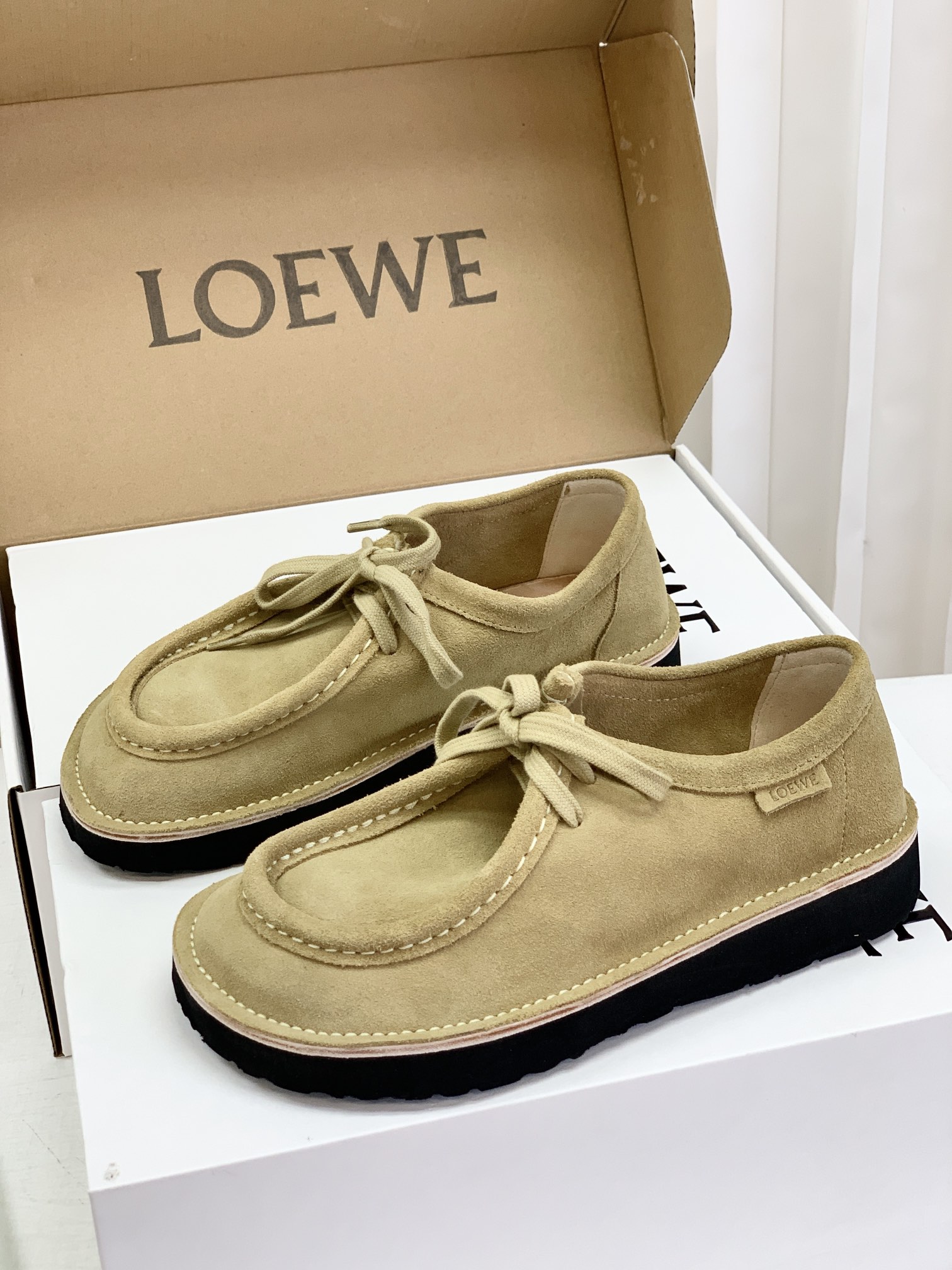 罗yi威,莞产,顶级,官网同步,2025早秋款款,时尚复古系带袋鼠鞋‼️ 从设计到质感,均与官网同步呼应,让你轻松拥有高奢级穿搭体验,鞋面甄选高丝光牛反绒,细腻的肌理带着自然的绒感光泽,每一寸都透着低调的精致;鞋垫采用水染牛皮,触感温润且富有韧性,与脚感轻盈的EVA发泡大底搭配,3公分跟高恰到好处,既悄悄拉长身形,又能带来如履平地的舒适,久穿也无负担! 经典棕色沉稳大气,卡其色温柔雅致,两种色调皆是百搭之选,轻松融入各式穿搭场景,贴合脚型的设计让每一步都自在从容,从材质的严苛甄选到细节的精心打磨,这双鞋不仅是舒适的陪伴,更是品味与高端的具象表达! 原盒包装,尺码,35 36 37 38 39 40 正码!