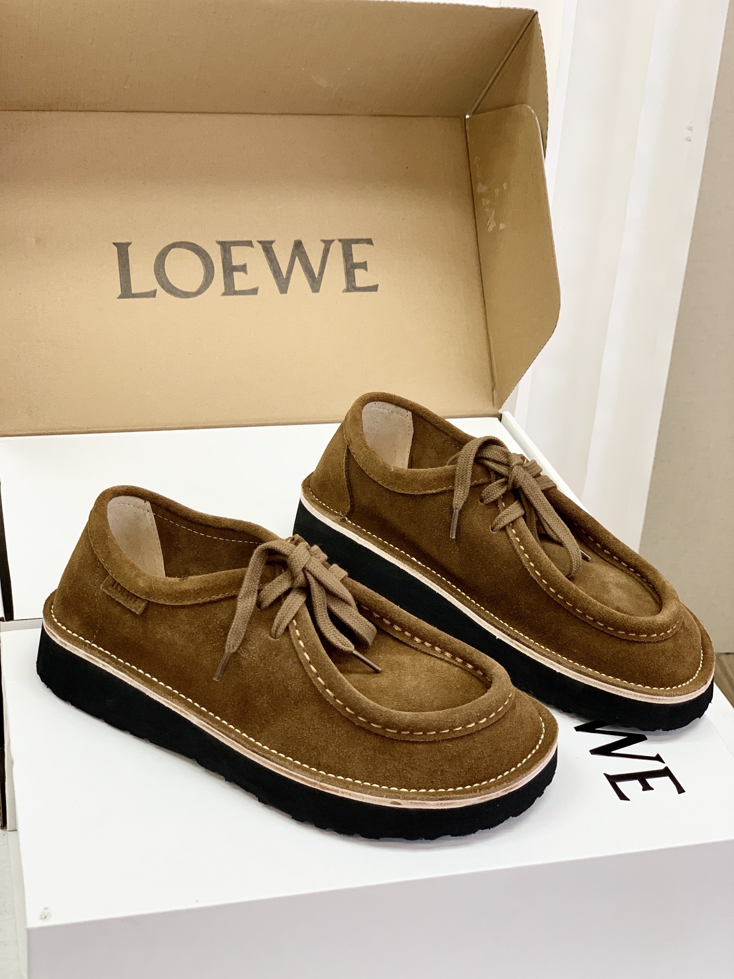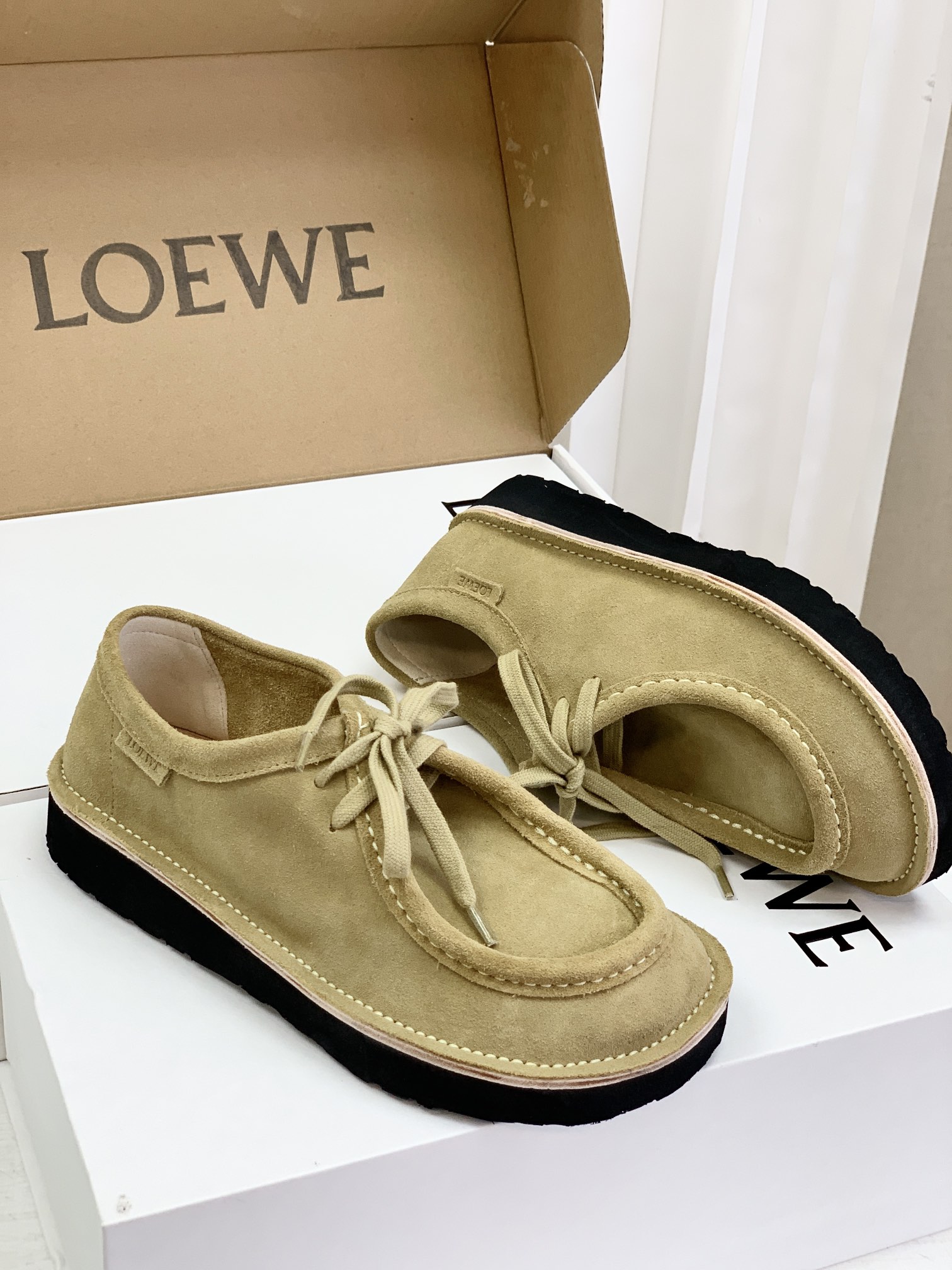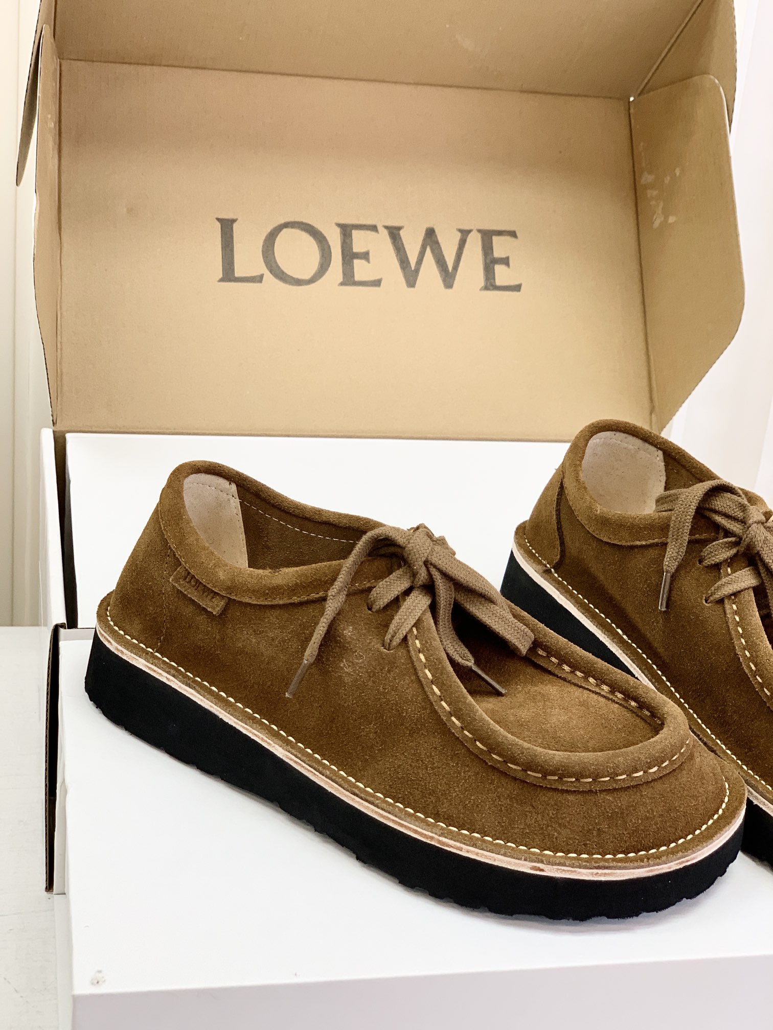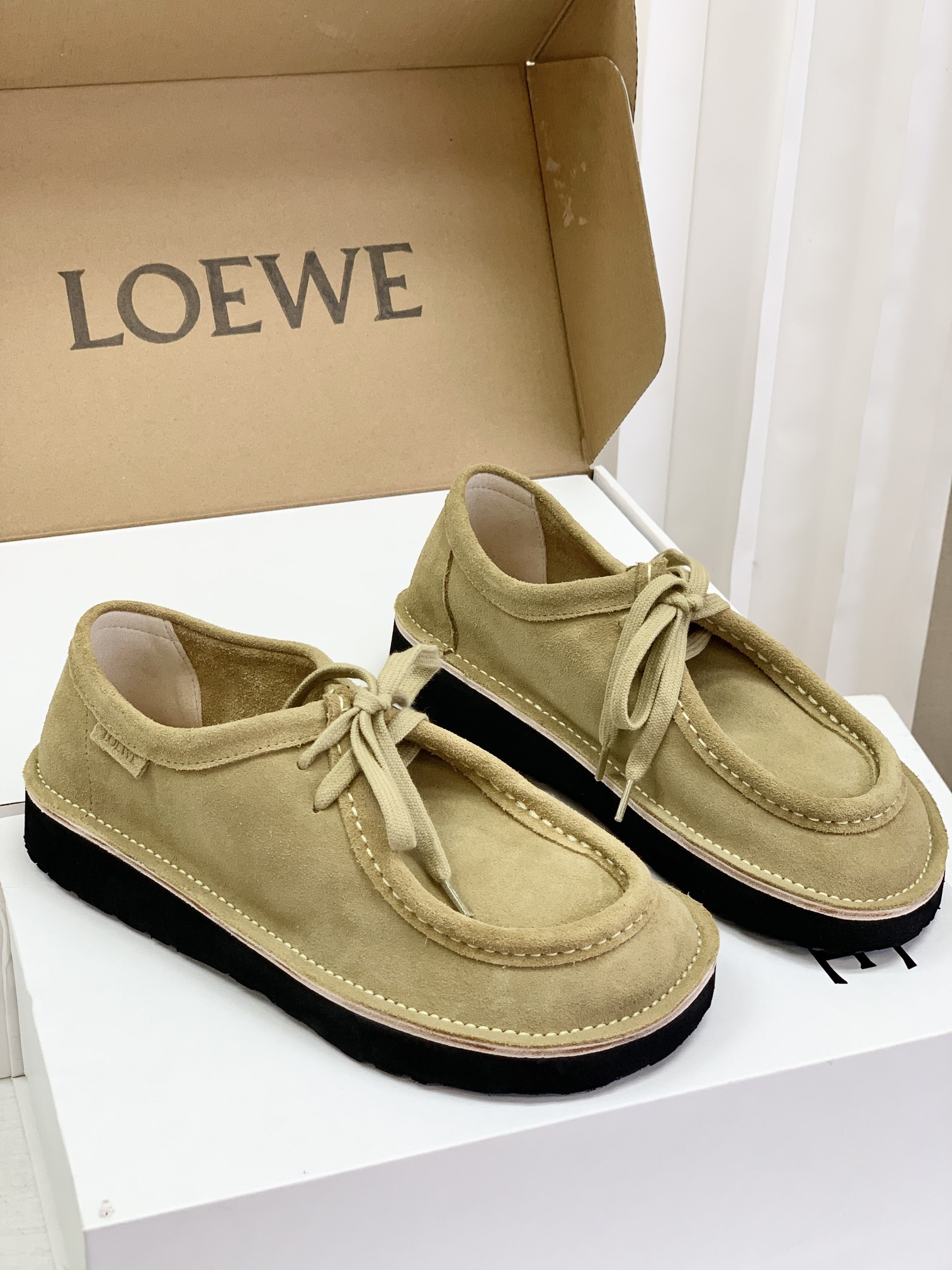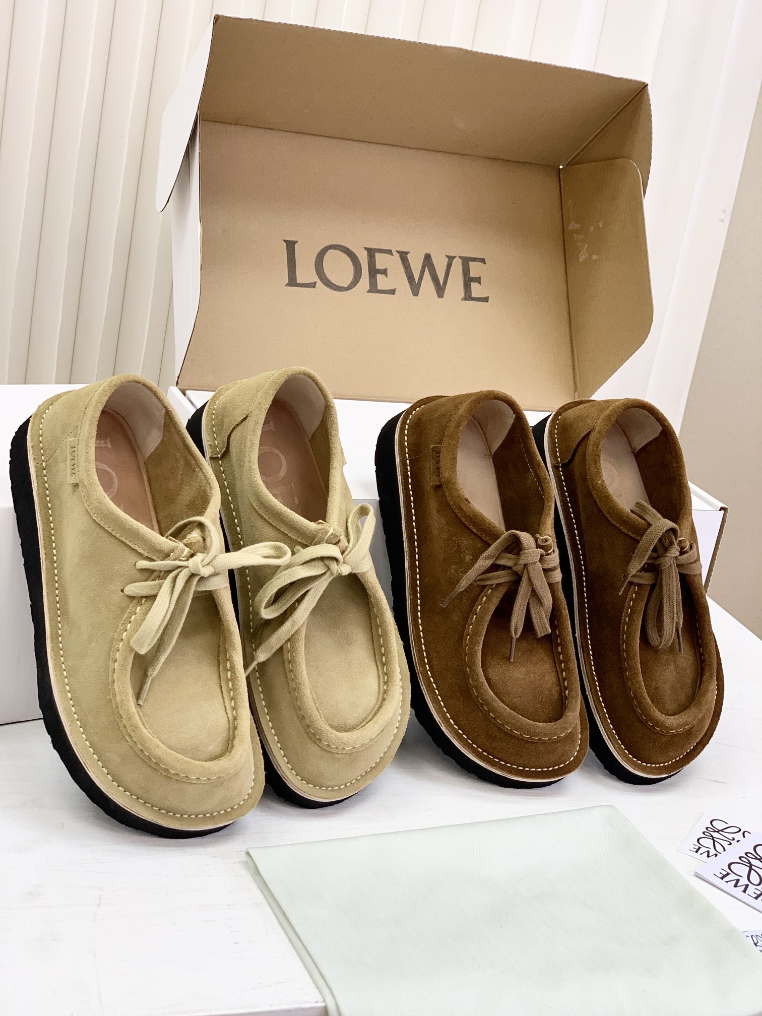 罗yi威,莞产,顶级,官网同步,2025早秋款款,时尚复古系带袋鼠鞋‼️ 从设计到质感,均与官网同步呼应,让你轻松拥有高奢级穿搭体验,鞋面甄选高丝光牛反绒,细腻的肌理带着自然的绒感光泽,每一寸都透着低调的精致;鞋垫采用水染牛皮,触感温润且富有韧性,与脚感轻盈的EVA发泡大底搭配,3公分跟高恰到好处,既悄悄拉长身形,又能带来如履平地的舒适,久穿也无负担! 经典棕色沉稳大气,卡其色温柔雅致,两种色调皆是百搭之选,轻松融入各式穿搭场景,贴合脚型的设计让每一步都自在从容,从材质的严苛甄选到细节的精心打磨,这双鞋不仅是舒适的陪伴,更是品味与高端的具象表达! 原盒包装,尺码,35 36 37 38 39 40 正码!