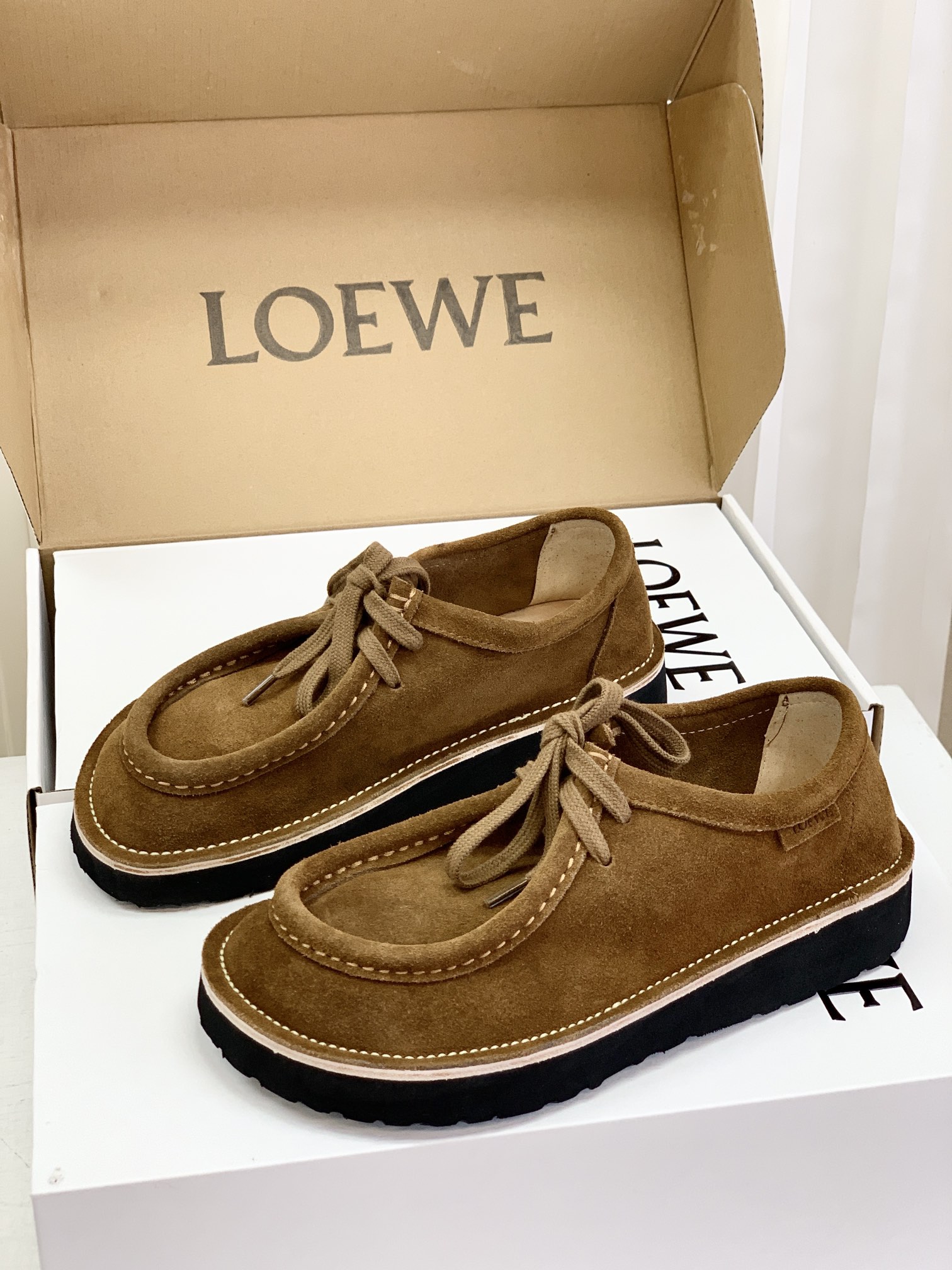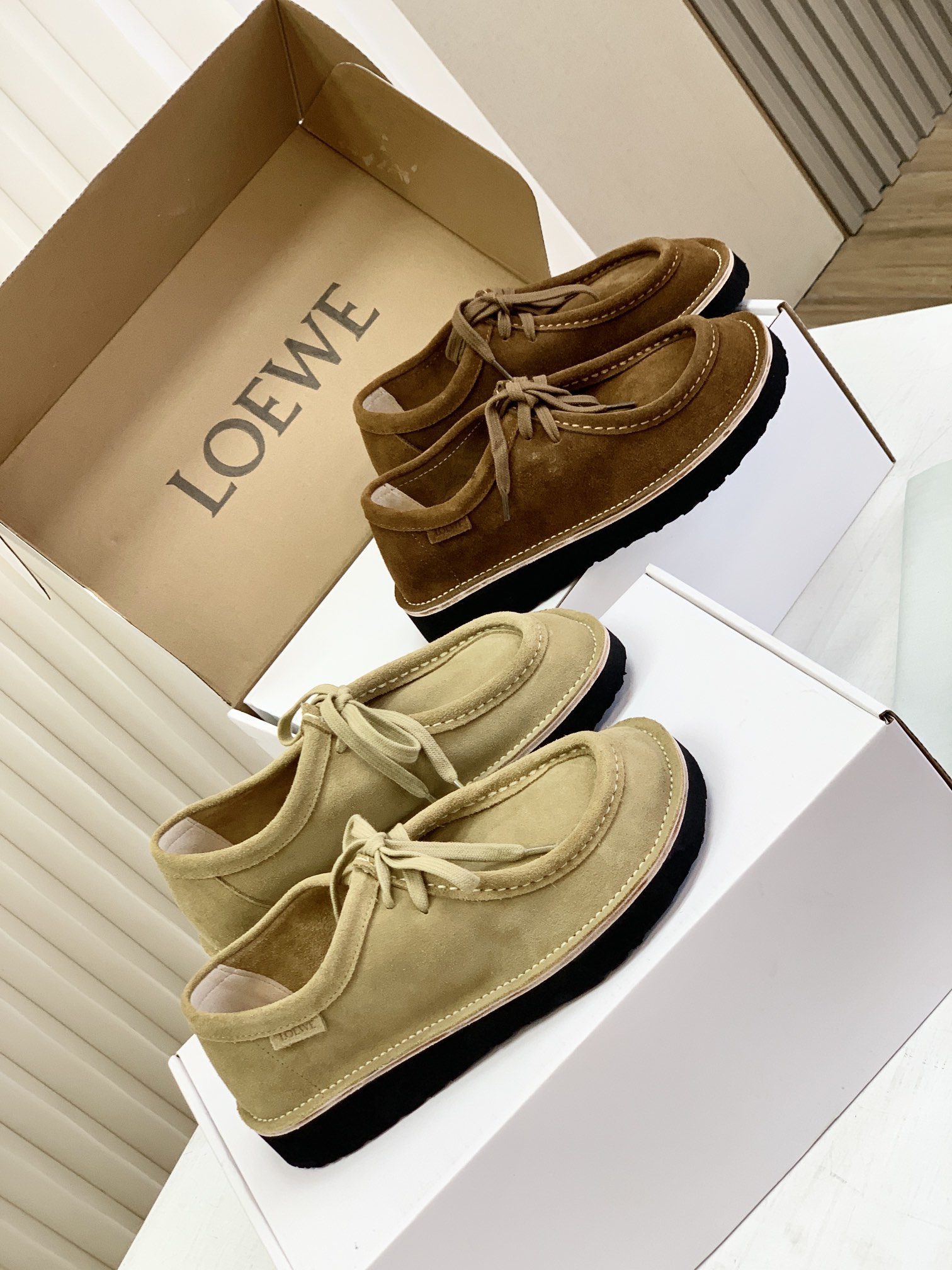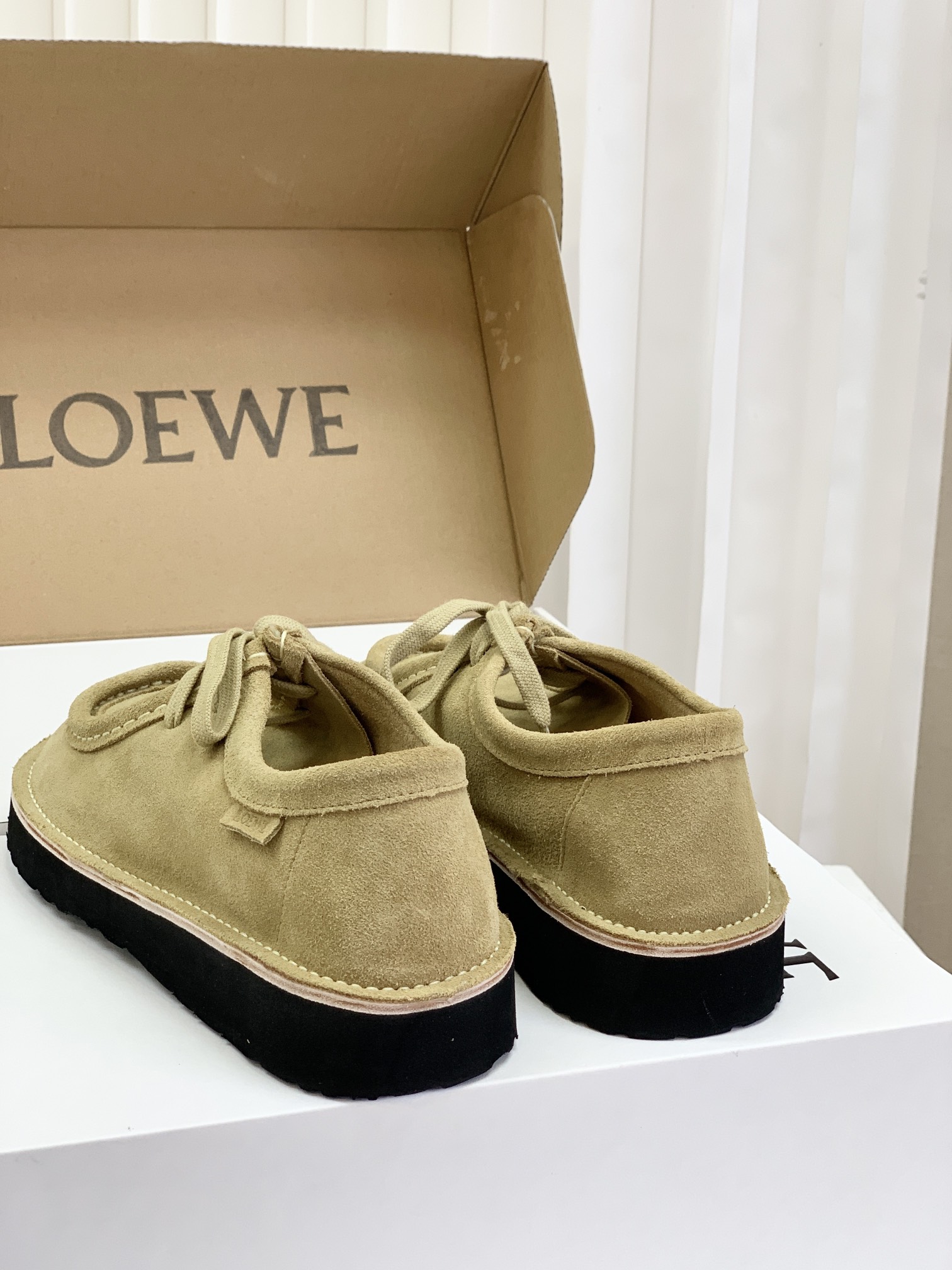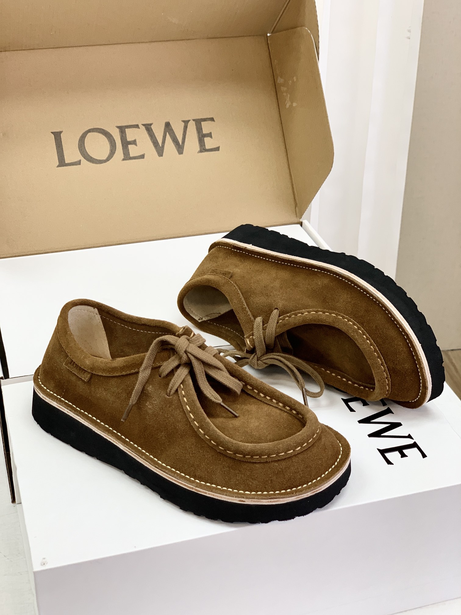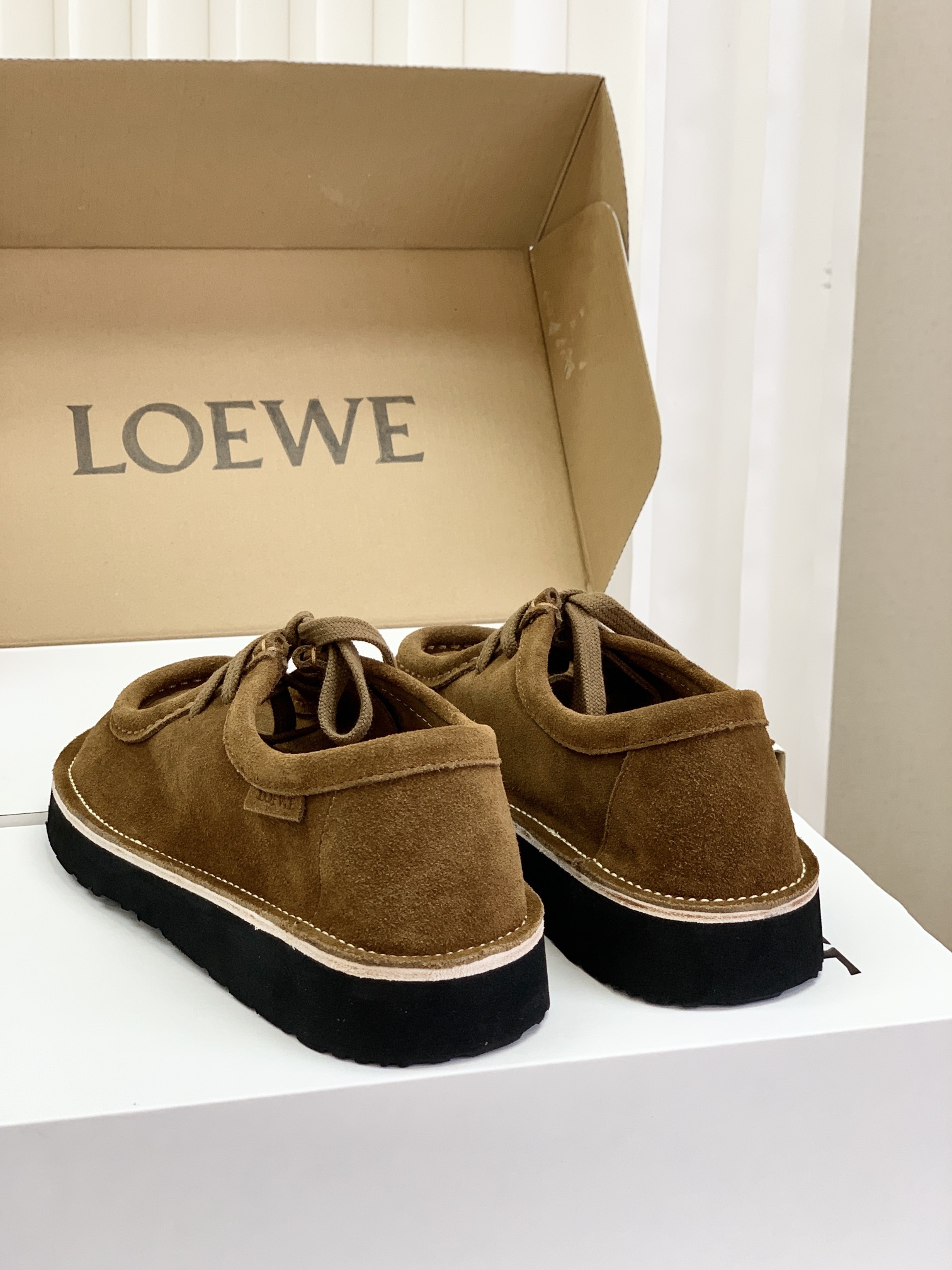 罗yi威,莞产,顶级,官网同步,2025早秋款款,时尚复古系带袋鼠鞋‼️ 从设计到质感,均与官网同步呼应,让你轻松拥有高奢级穿搭体验,鞋面甄选高丝光牛反绒,细腻的肌理带着自然的绒感光泽,每一寸都透着低调的精致;鞋垫采用水染牛皮,触感温润且富有韧性,与脚感轻盈的EVA发泡大底搭配,3公分跟高恰到好处,既悄悄拉长身形,又能带来如履平地的舒适,久穿也无负担! 经典棕色沉稳大气,卡其色温柔雅致,两种色调皆是百搭之选,轻松融入各式穿搭场景,贴合脚型的设计让每一步都自在从容,从材质的严苛甄选到细节的精心打磨,这双鞋不仅是舒适的陪伴,更是品味与高端的具象表达! 原盒包装,尺码,35 36 37 38 39 40 正码!