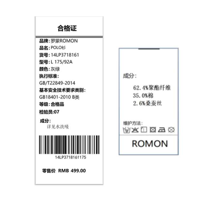 面料:62.4%聚酯纤维 35.0%棉 2.6%桑蚕丝