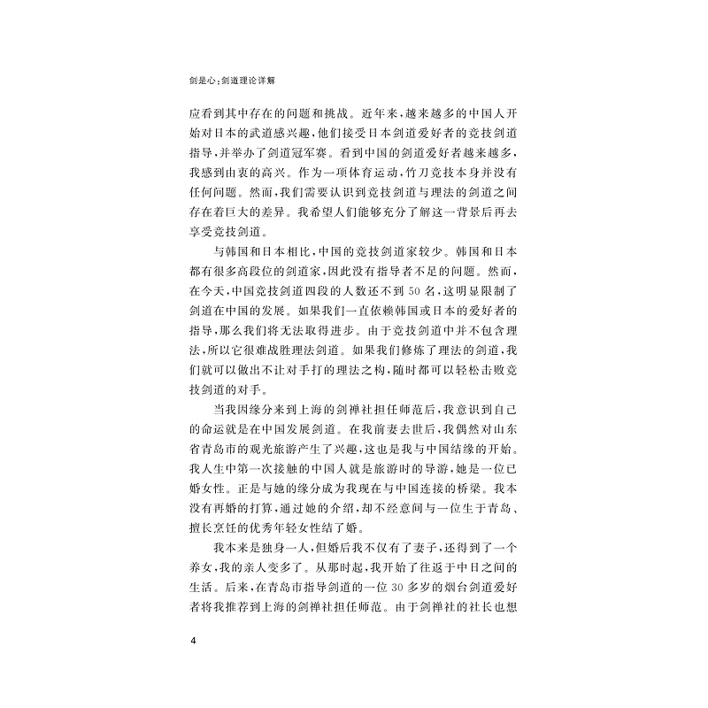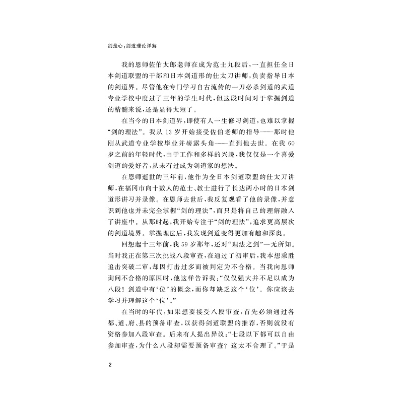 剑道,是传统的竞技性器械武术。正式比赛通常在室内进行,因选手赤足,因此对场地木地板的质量有较高要求。选手一对一进行比赛,双方均穿剑道服,戴护具,持竹剑,按规则相互击打有效部位,由裁判计点数判胜负。亦可举行团体比赛,由选手数相等的团体双方分别一对一决出胜负后计算总分。 “剑道”一词的文献来源是《吴越春秋》。本书将以剑道运动为论述的主题,通过文字及图式两方面的材料,来阐述剑道运动的至高境界,以及其与心之间的联系。