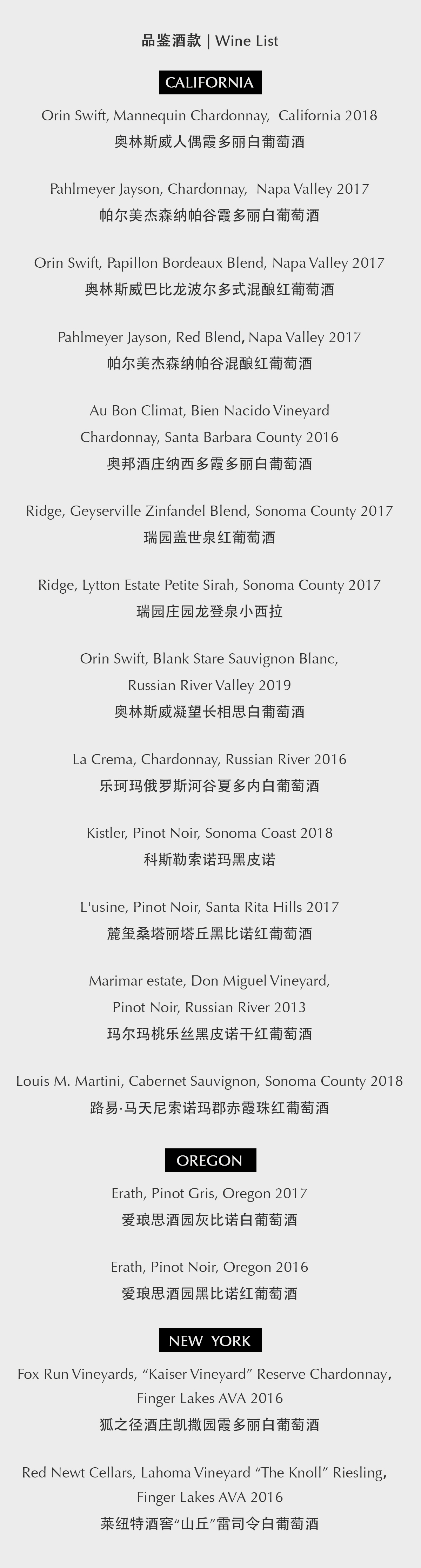 当天的酒单不仅如此,放眼加州之外,俄勒冈州的皮诺家族风情,以及纽约州五指湖区的优雅风格白葡萄酒,都是您领略美国多样性葡萄酒风格的另一个角度。