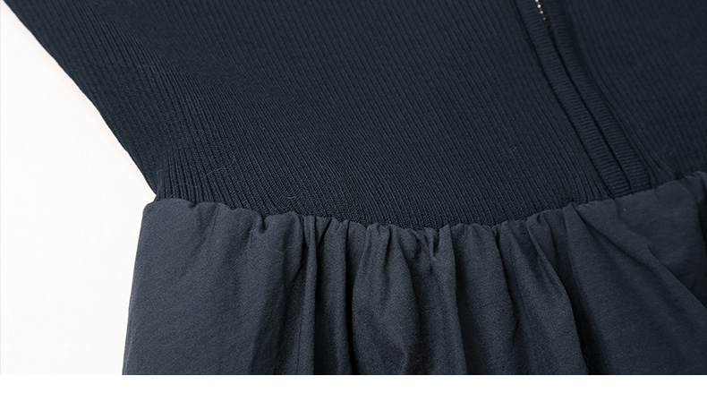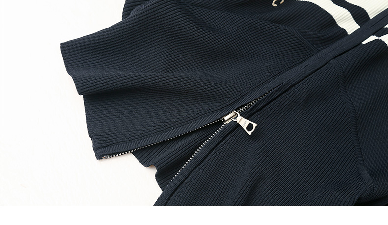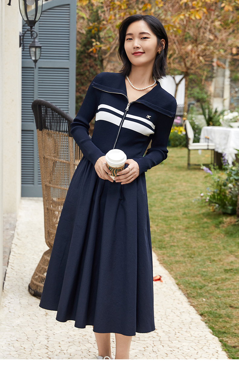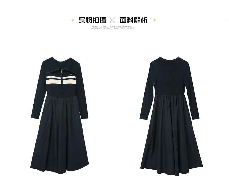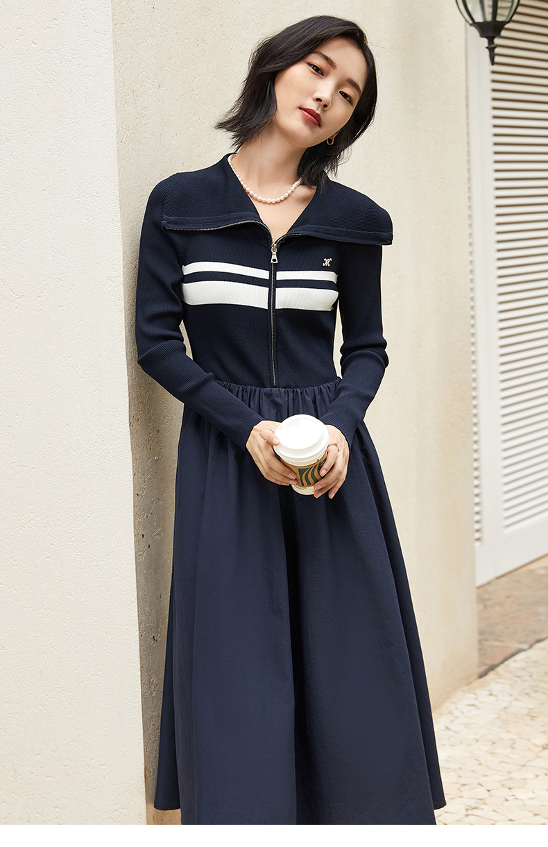 海军风撞色拉链针织连衣裙女 修身显瘦中长款气质长裙