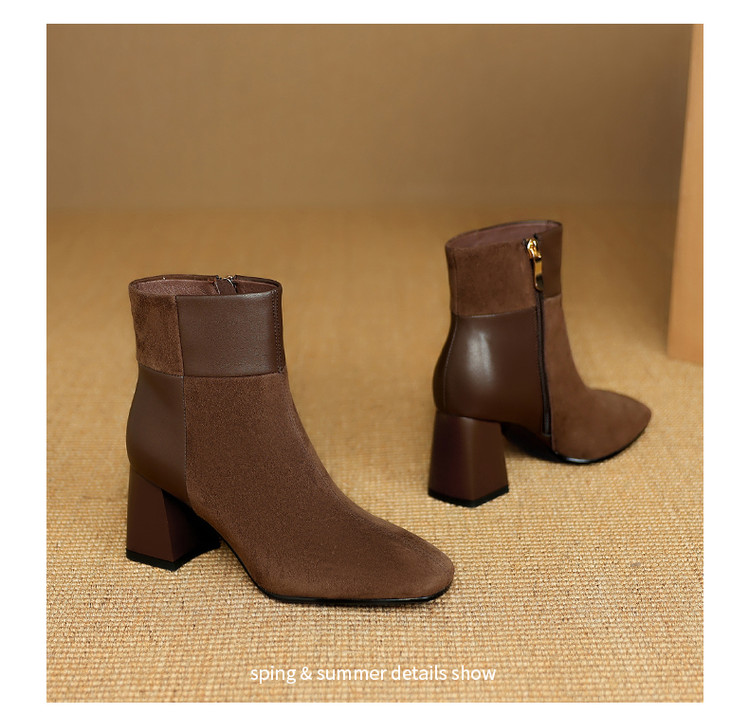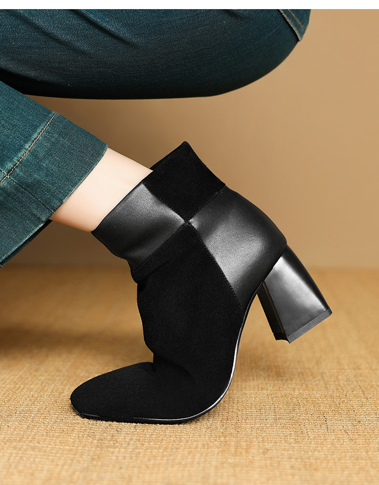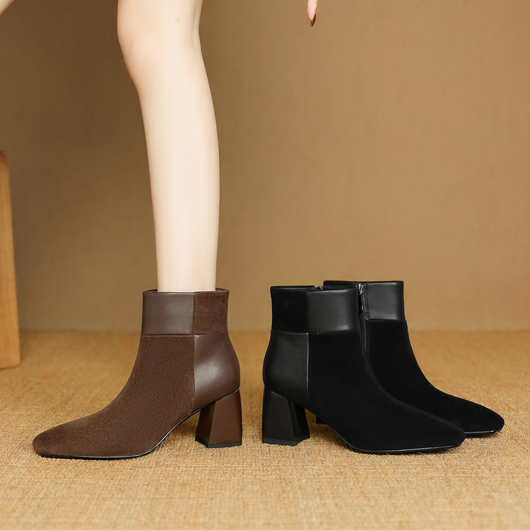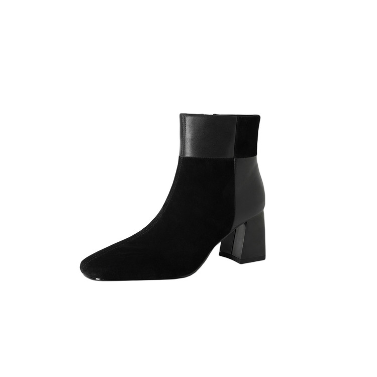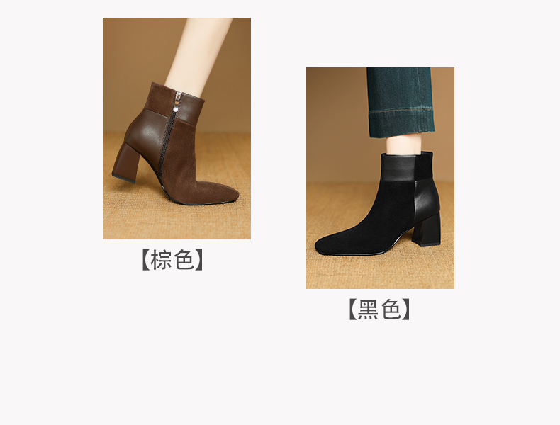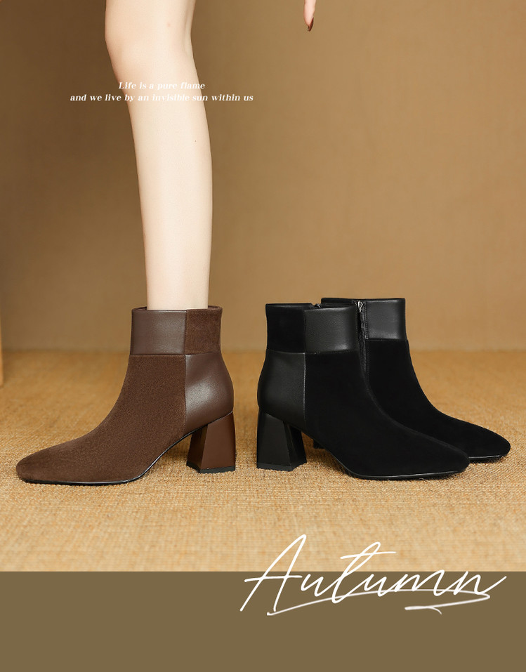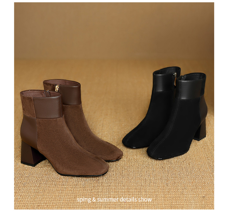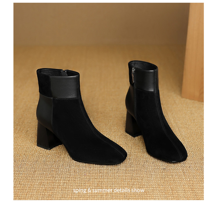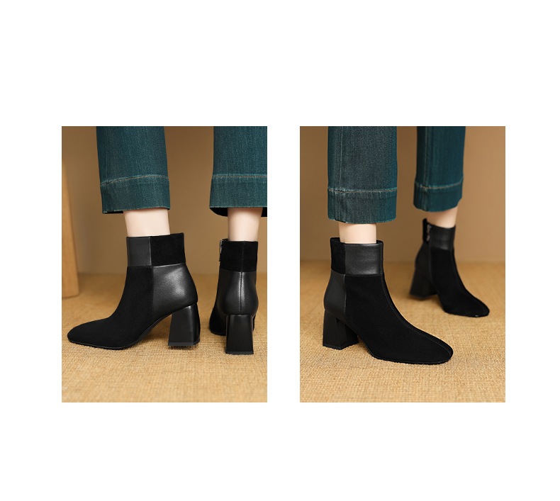 【预售5天】时尚真皮拼接粗跟短靴,方头高跟百搭时装女靴气质马丁靴NJMK&K1791