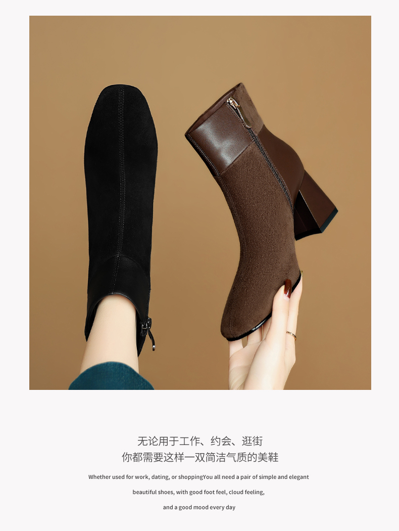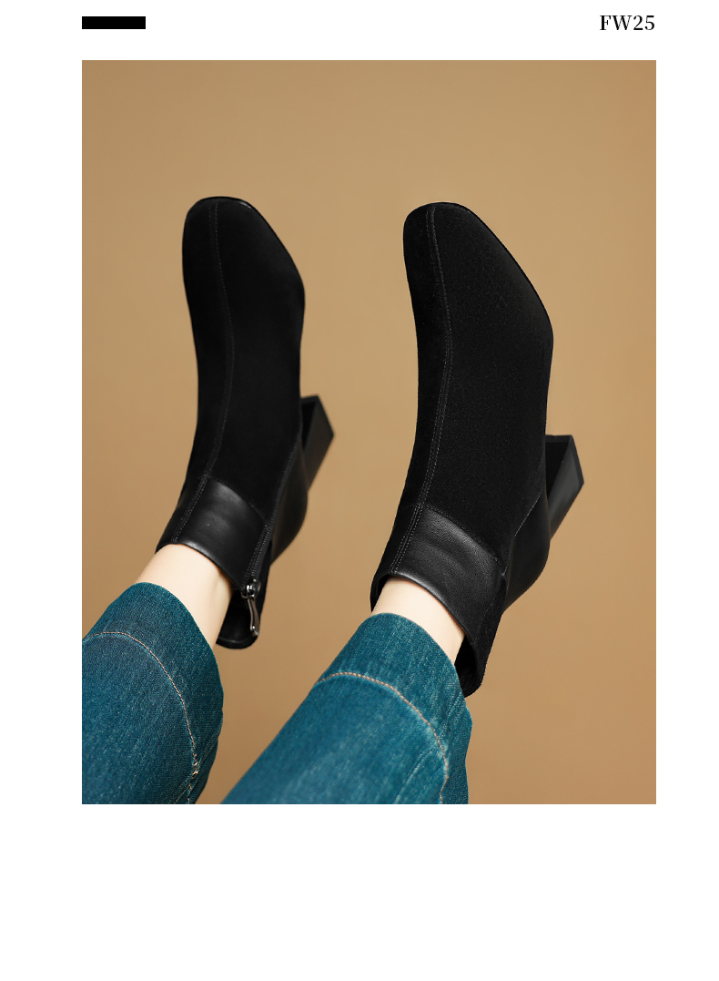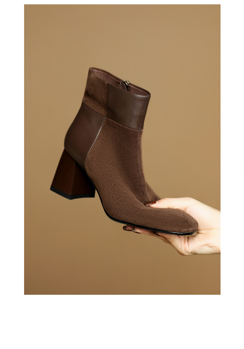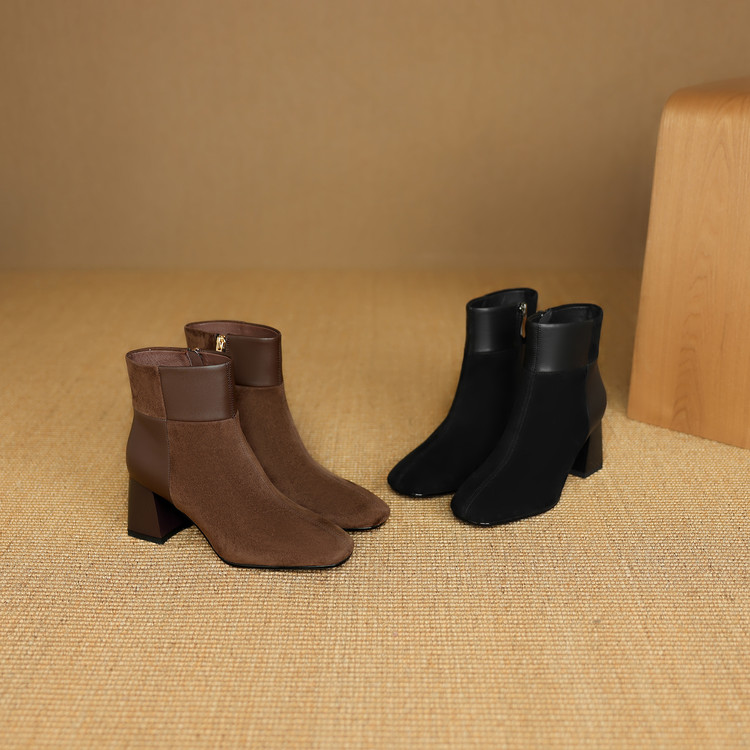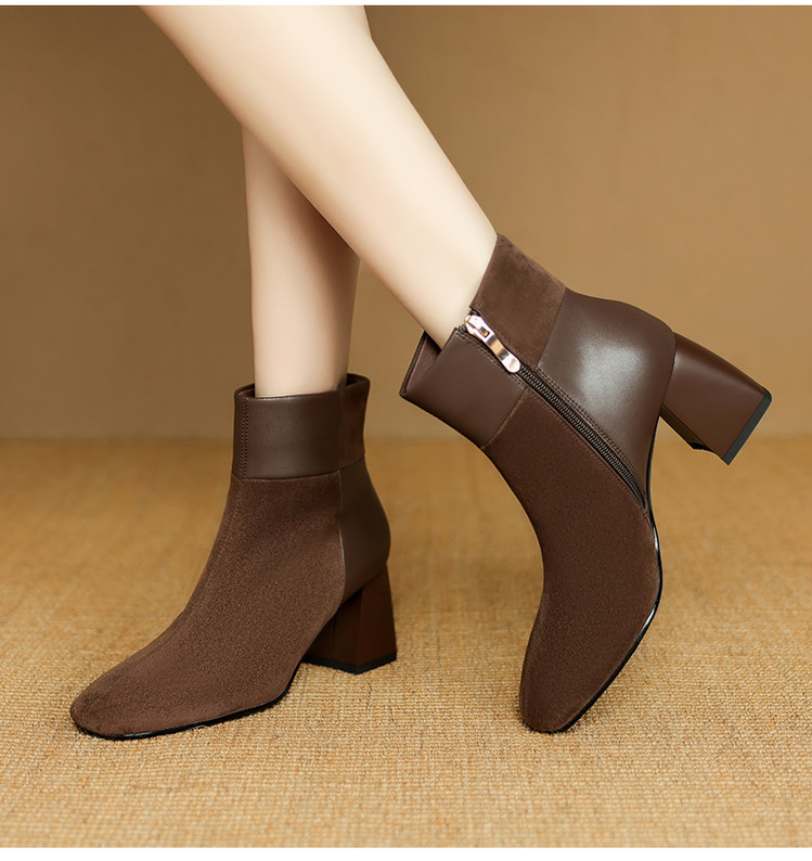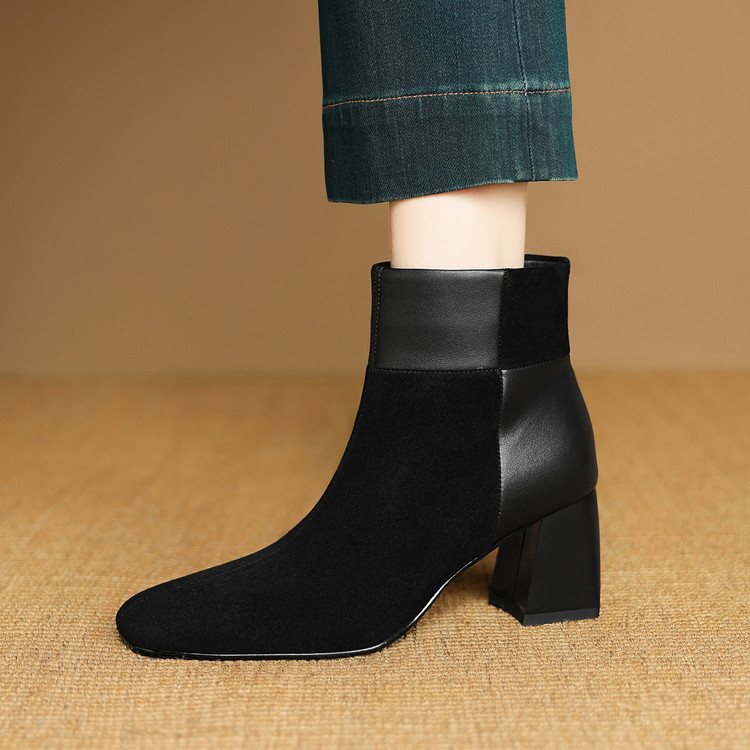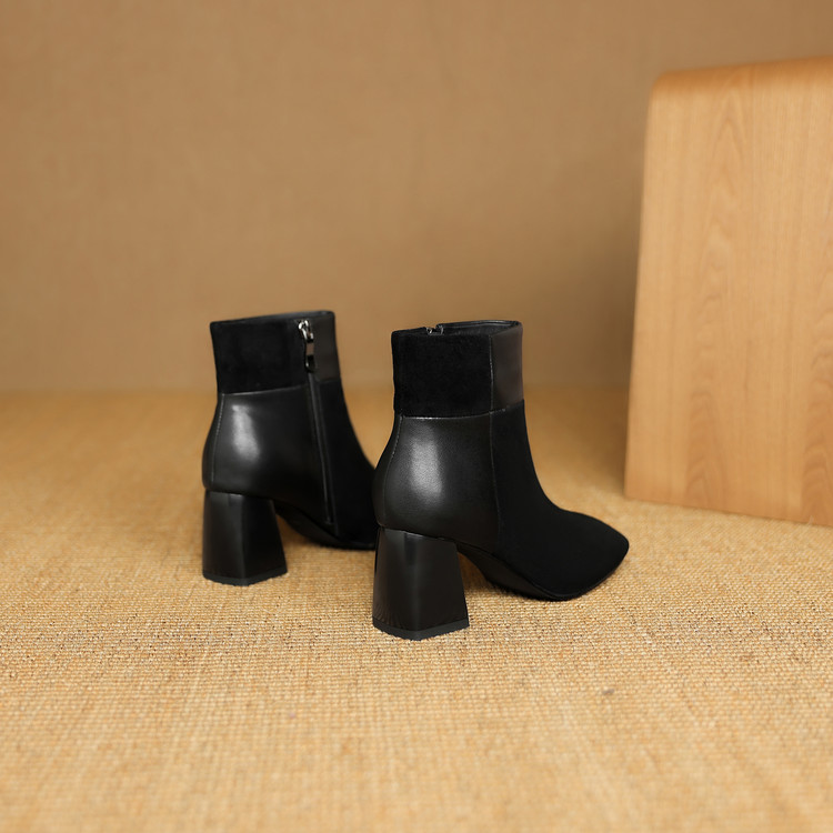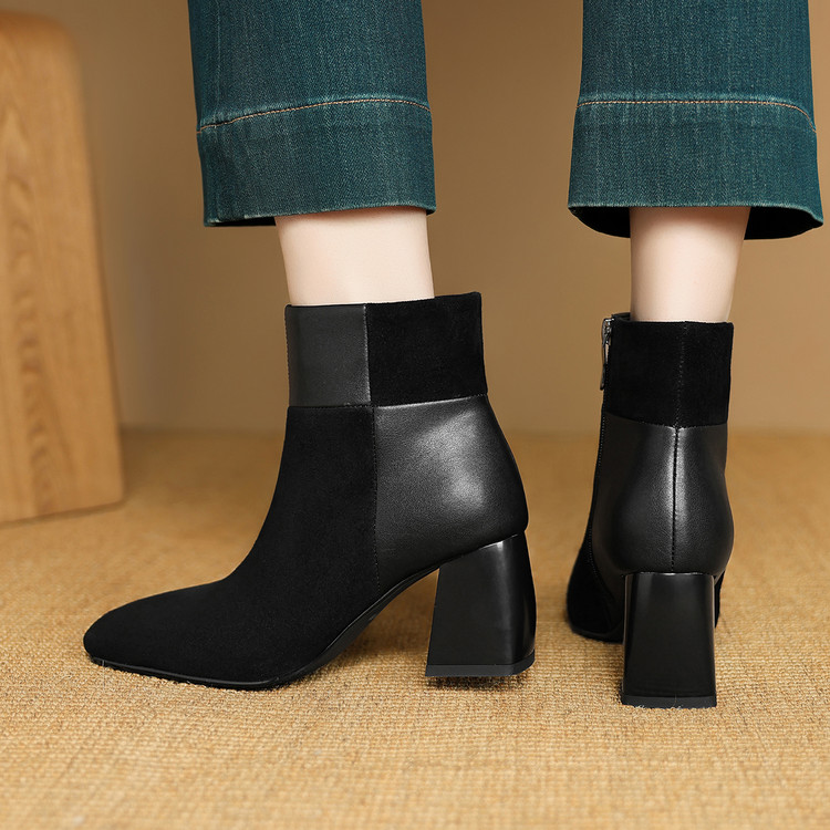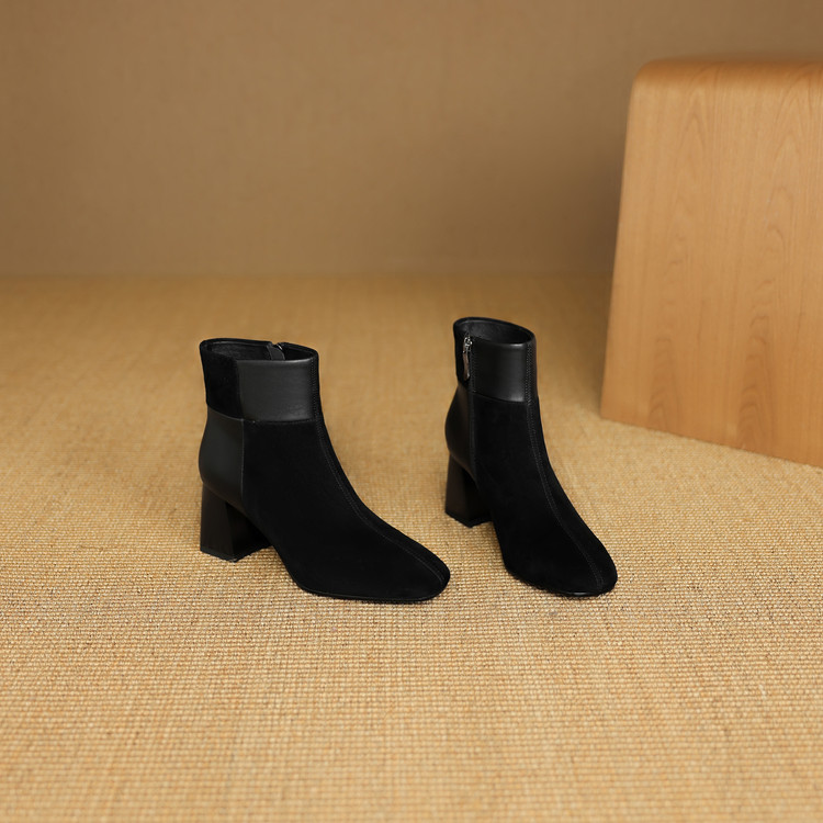 【预售5天】时尚真皮拼接粗跟短靴,方头高跟百搭时装女靴气质马丁靴NJMK&K1791