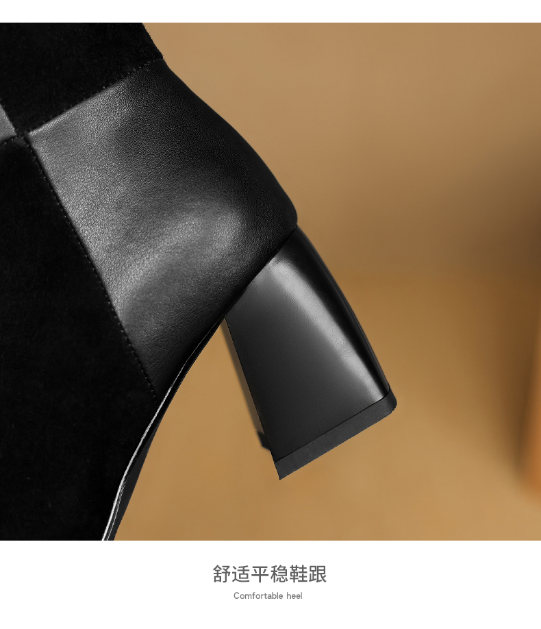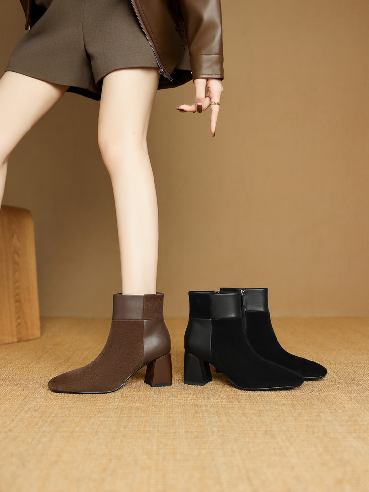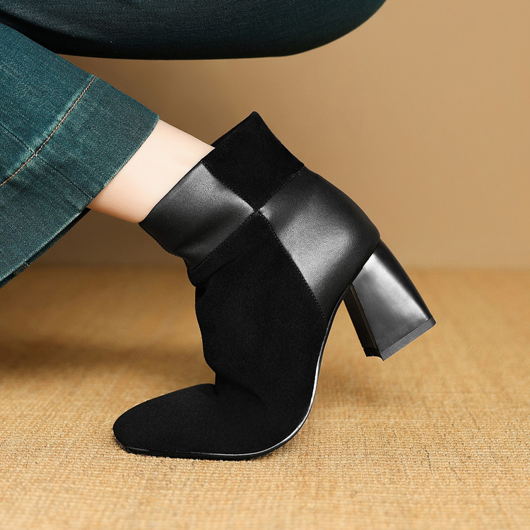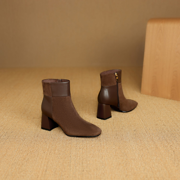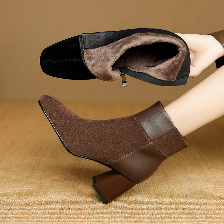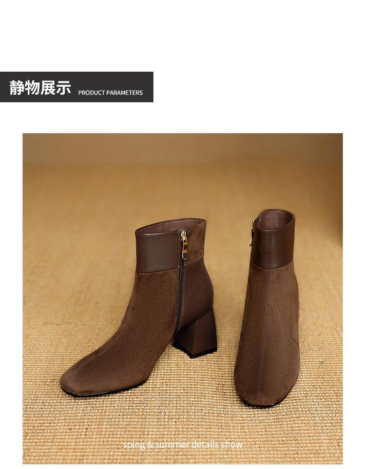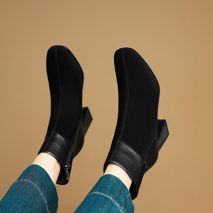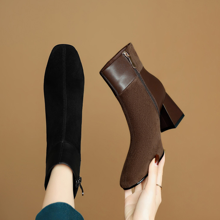 【预售5天】时尚真皮拼接粗跟短靴,方头高跟百搭时装女靴气质马丁靴NJMK&K1791