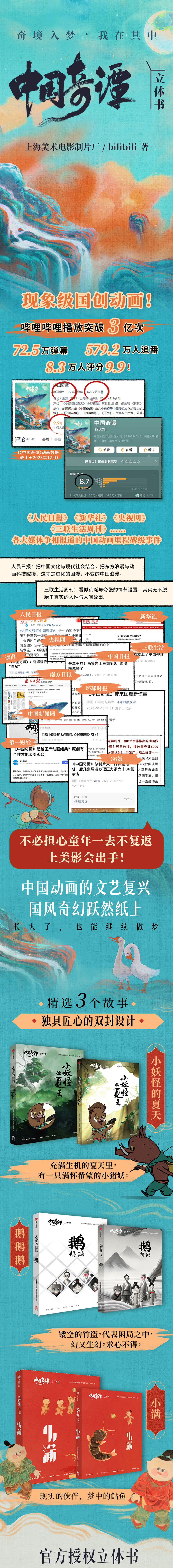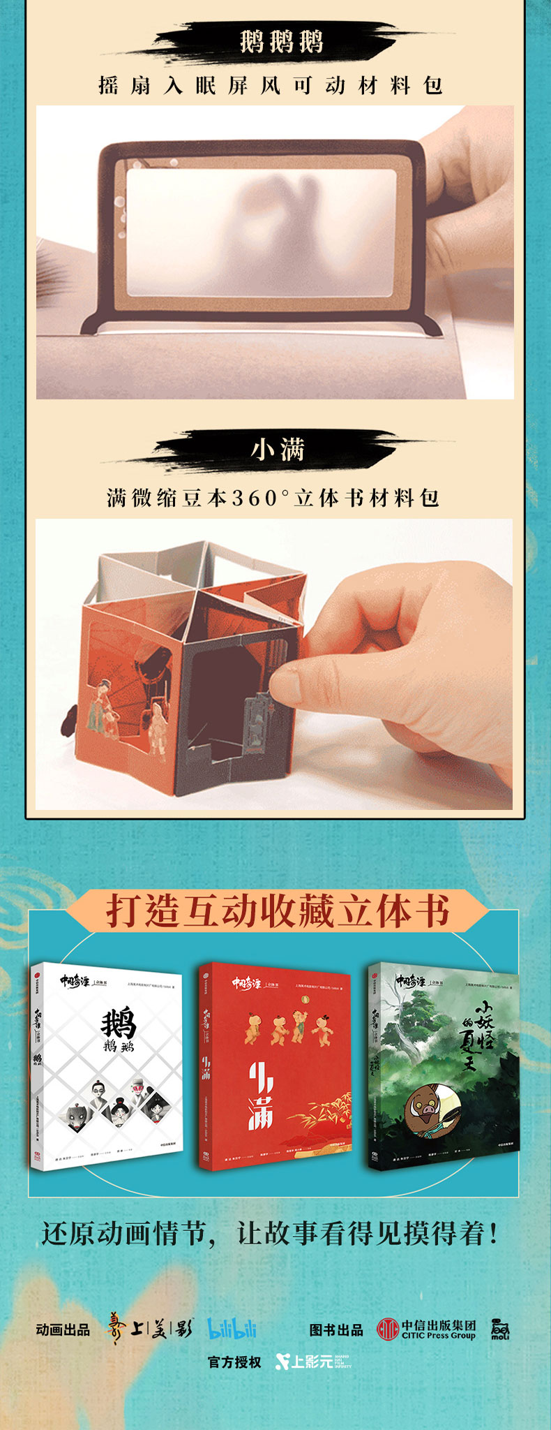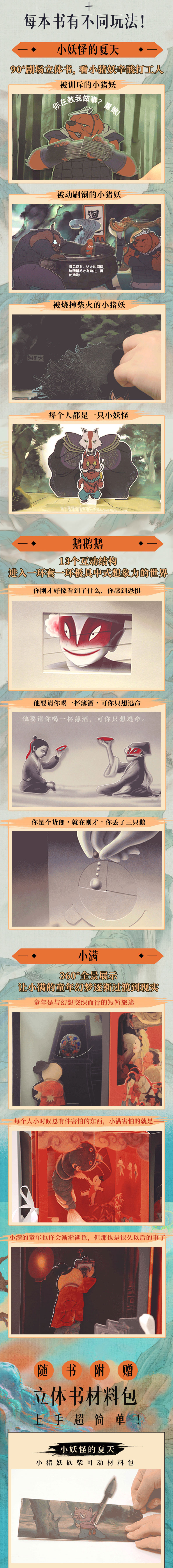 《中国奇谭立体书》是由原创动画《中国奇谭》剧情出发衍生出的立体书。是由三个植根于中国传统文化的独立的故事组成:《小妖怪的夏天》《鹅鹅鹅》《小满》。通过立体书独特的视觉表达方式与立体互动结构为读者提供了一种重新审视故事的角度。在设计的过程中维持与动画剧情的对应关系,有各种互动结构,具有创新性和趣味性。