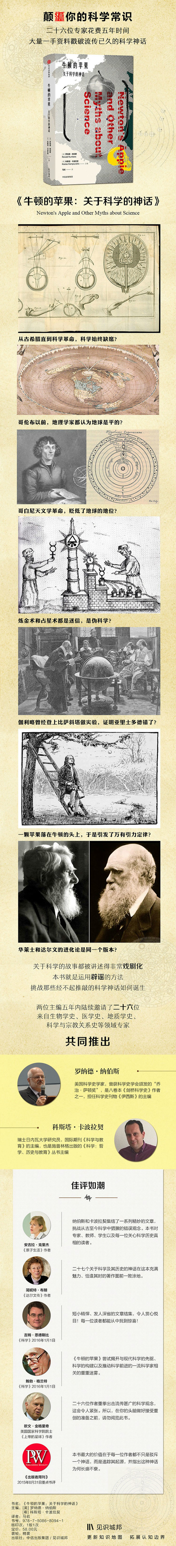 很多我们自以为了解的科学知识,比如一个苹果砸到牛顿头上,从而顿悟出万有引力,这纯属谣言。由科学家和历史学家共同执笔的这部著作挑战了科学的前进是由一些个人的发现或创新所推动的这种观念,解释了科学的进展往往来自微小的突破渐渐积累而成。——亨利埃塔·维尔马(Henrietta Verma),美国《图书馆杂志》2015年9月1日