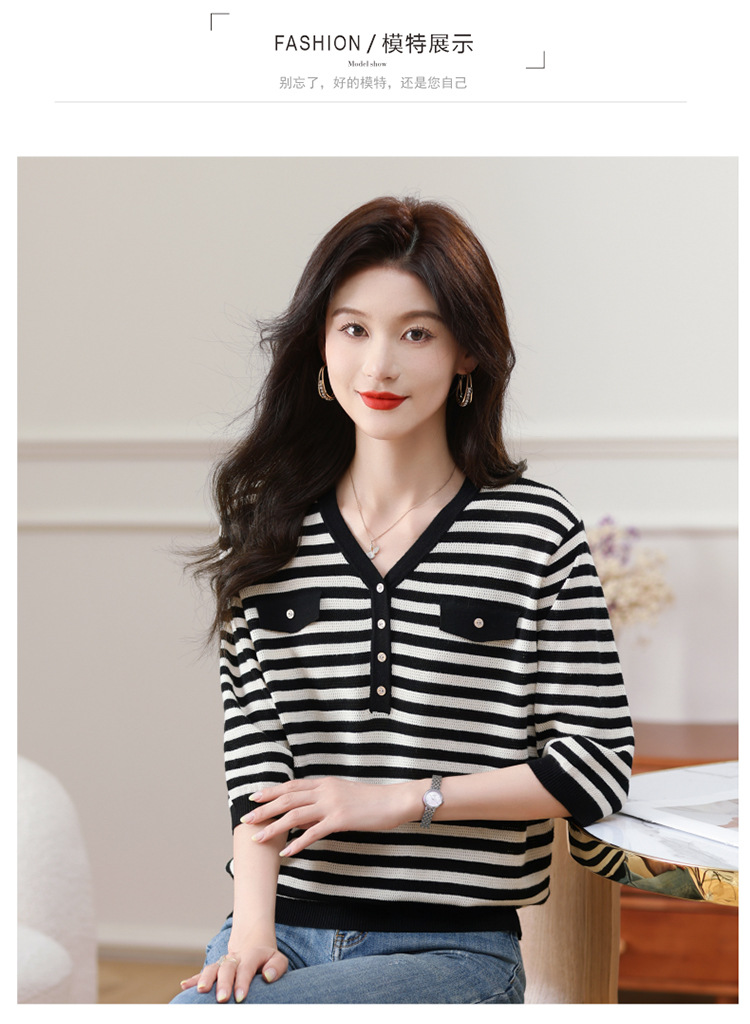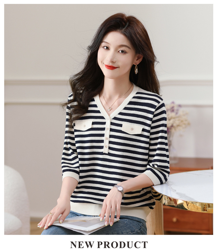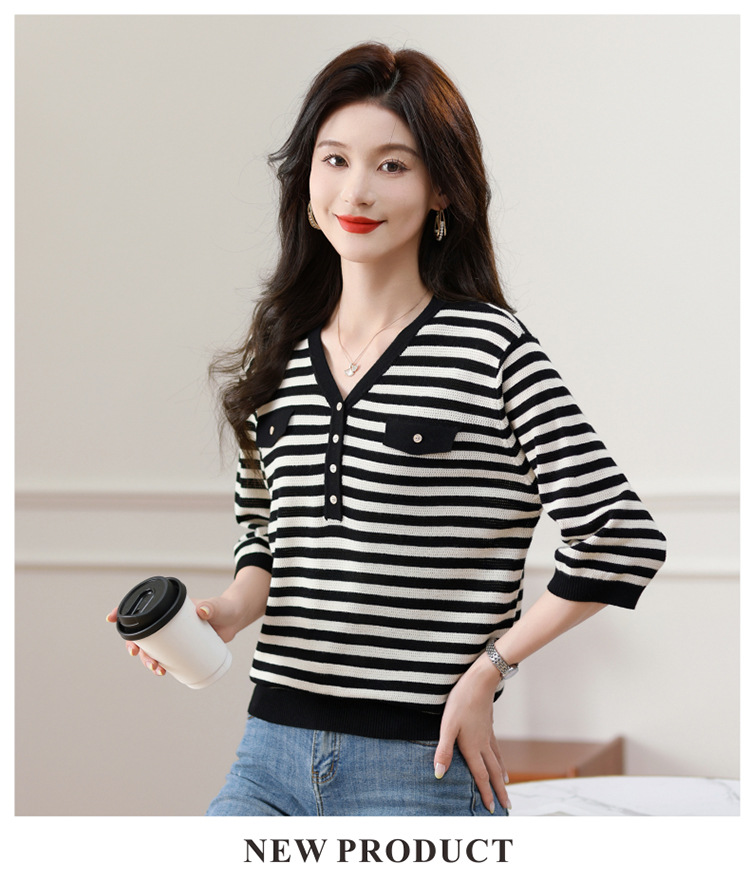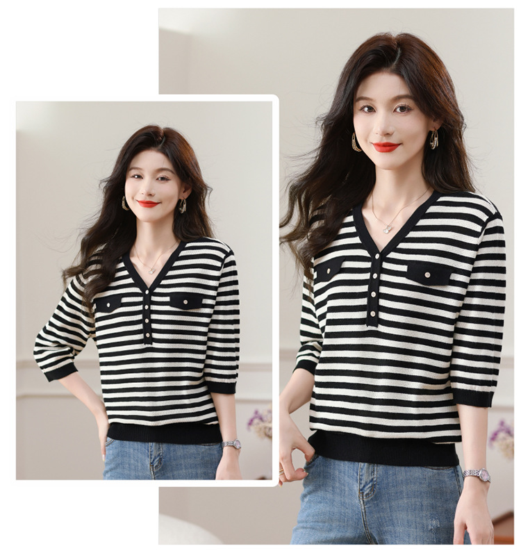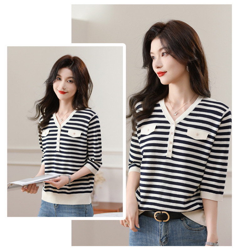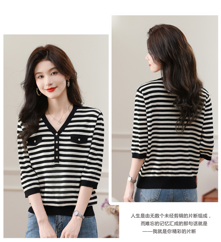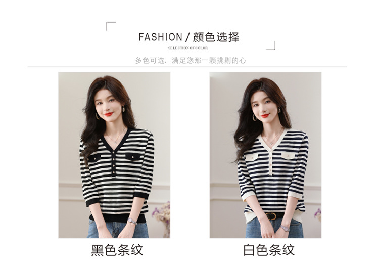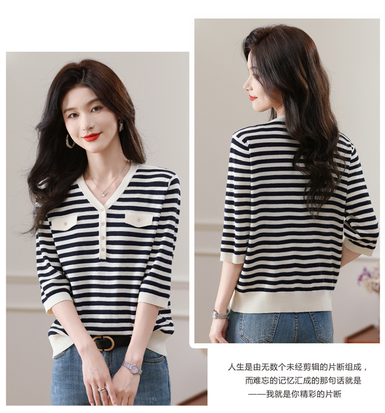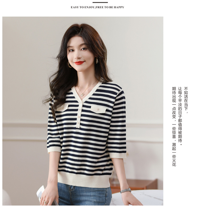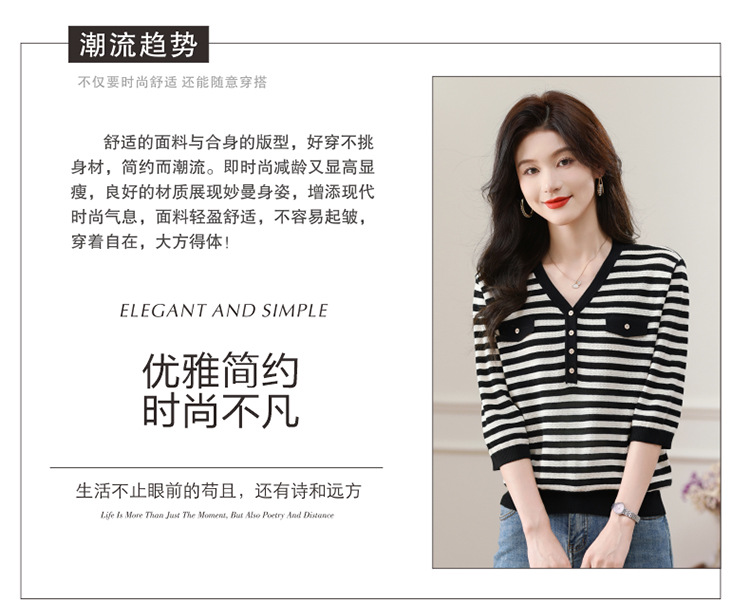 CC-5-6005七分袖条纹针织衫女夏新款2024早秋新款宽松V领中袖洋气减龄上衣