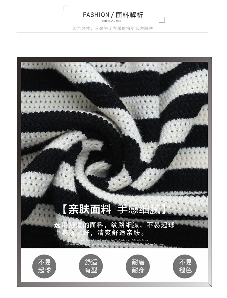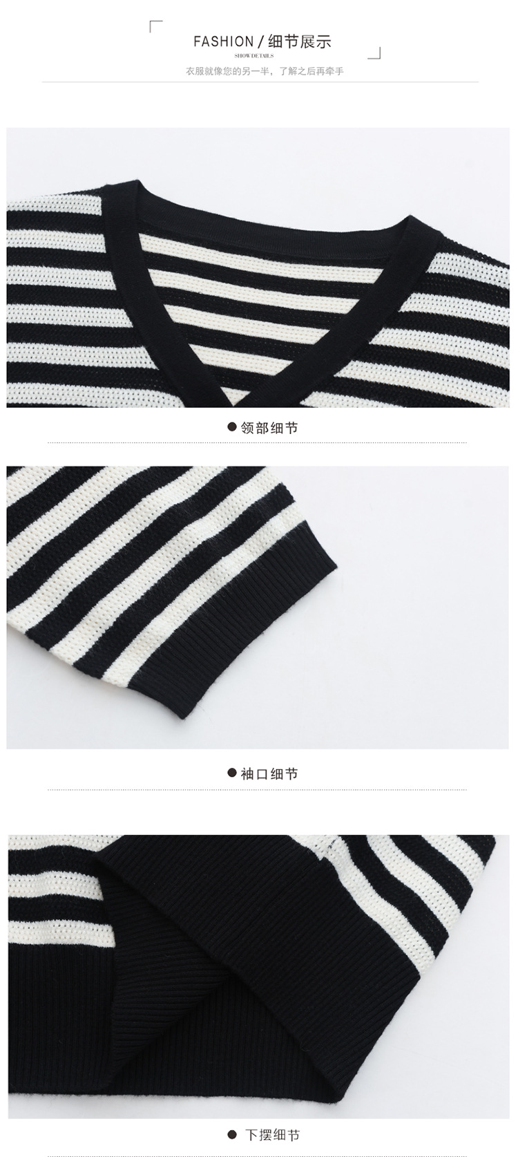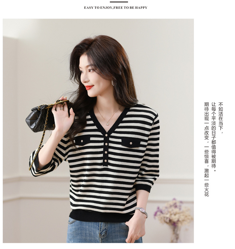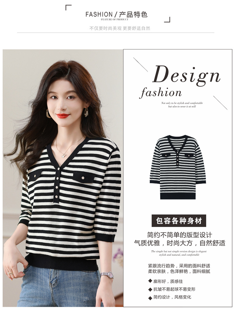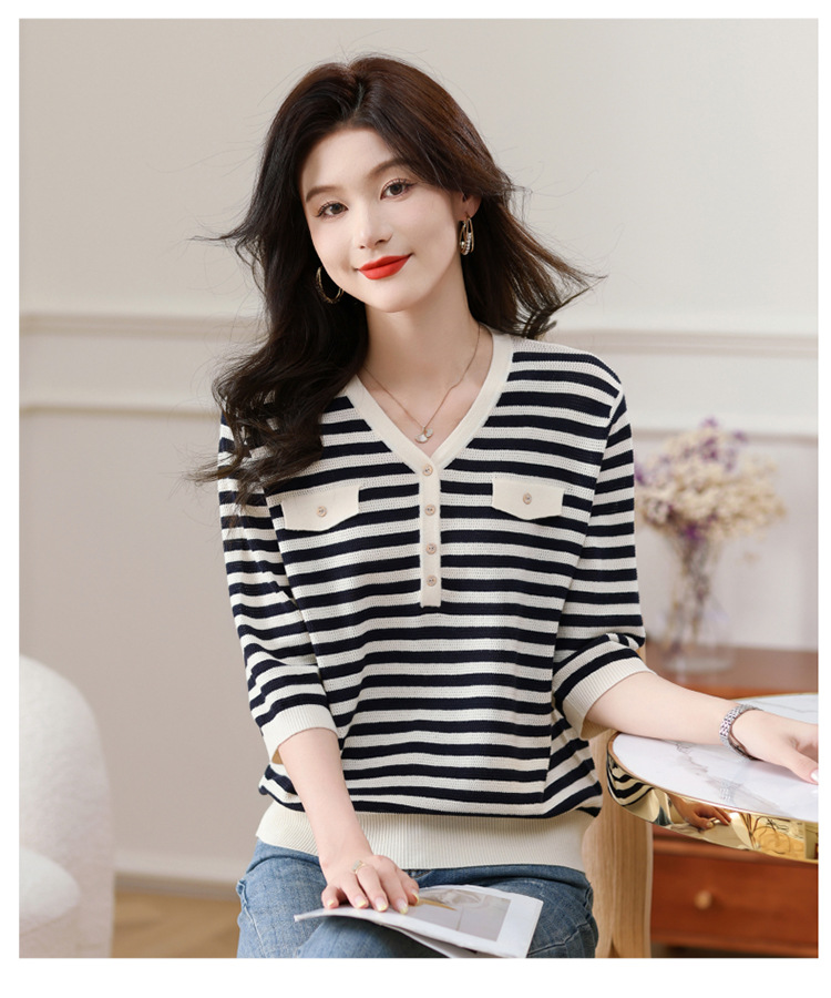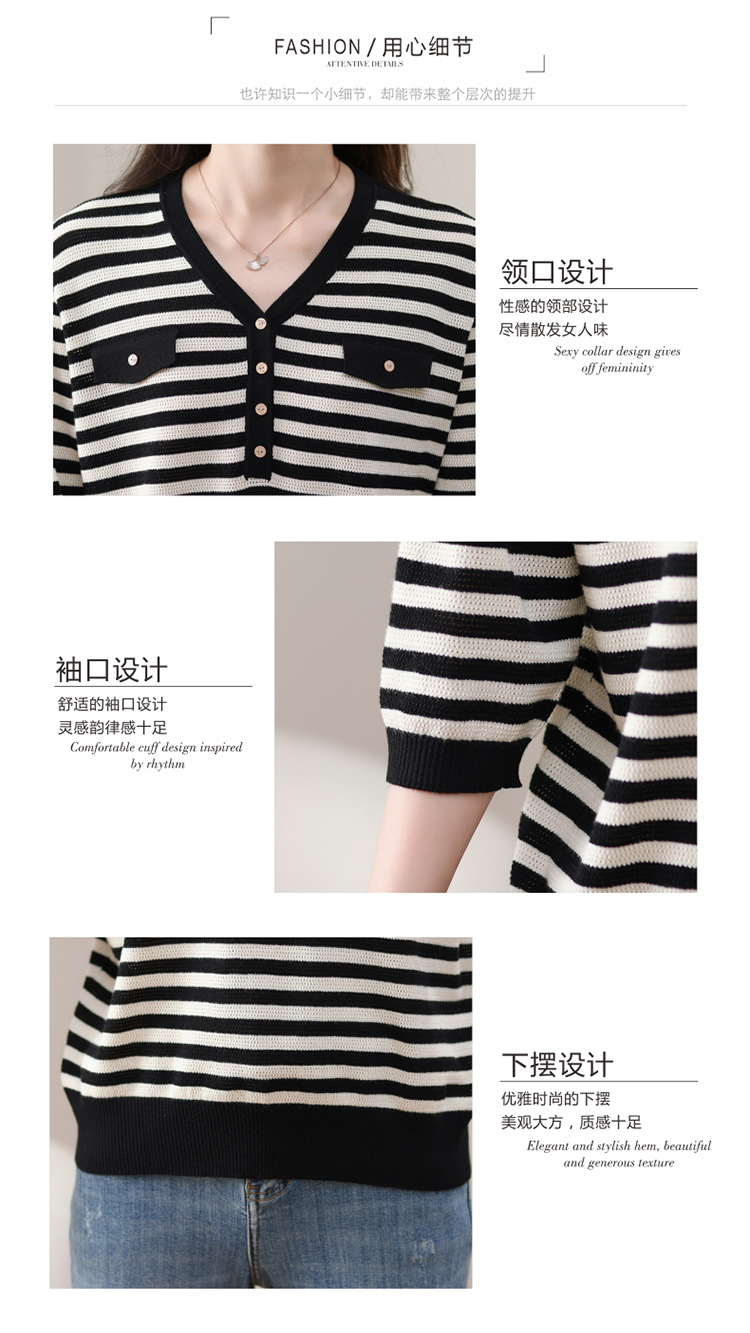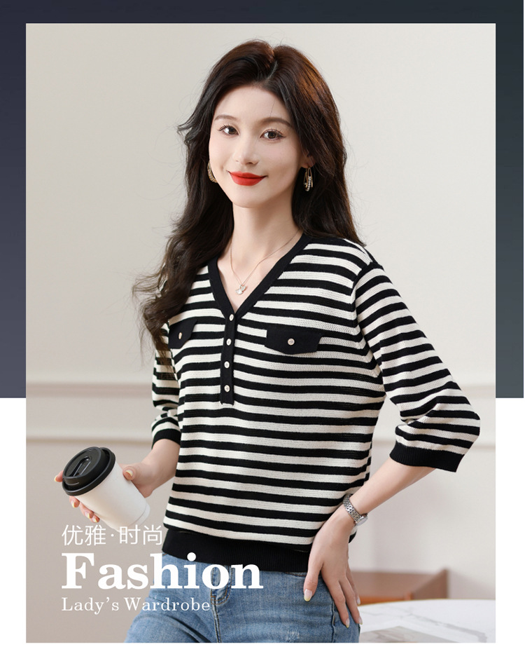 CC-5-6005七分袖条纹针织衫女夏新款2024早秋新款宽松V领中袖洋气减龄上衣
