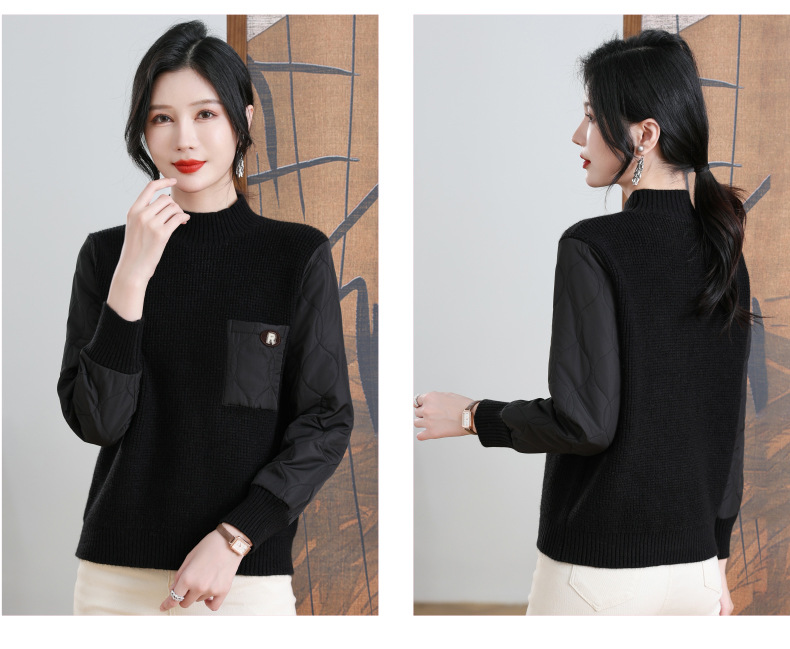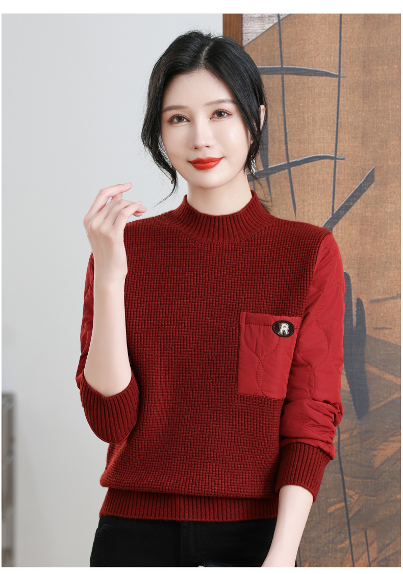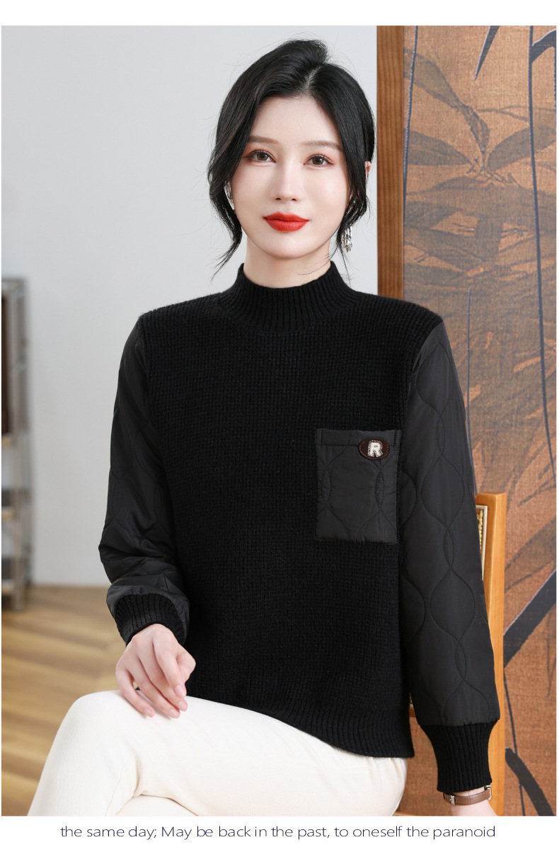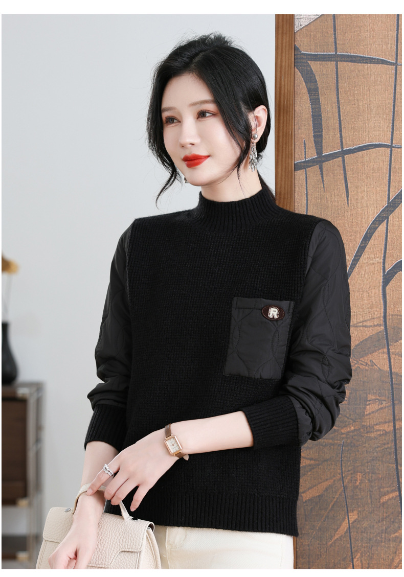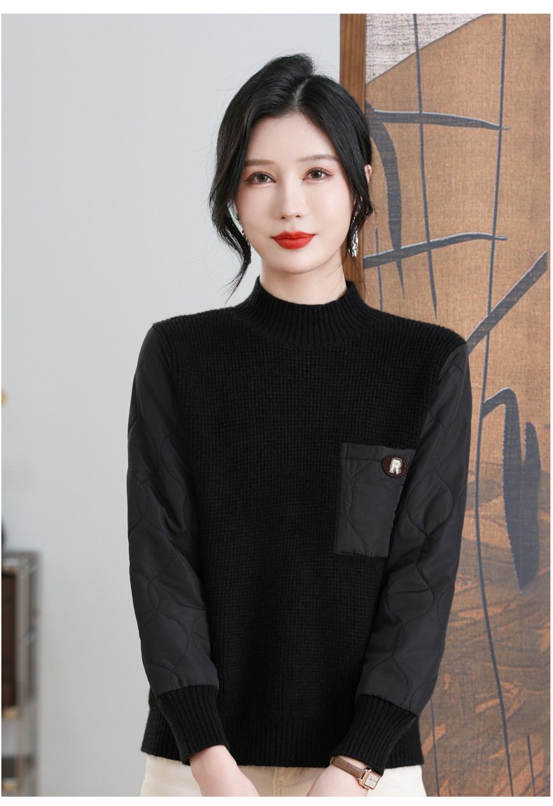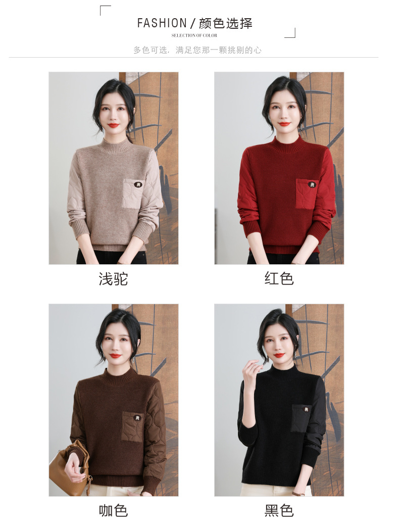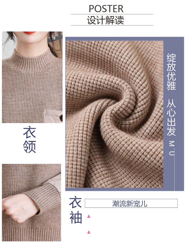 CC-101-3337半高领毛衣女秋冬2024内搭加棉厚款拼接保暖宽松打底上衣女