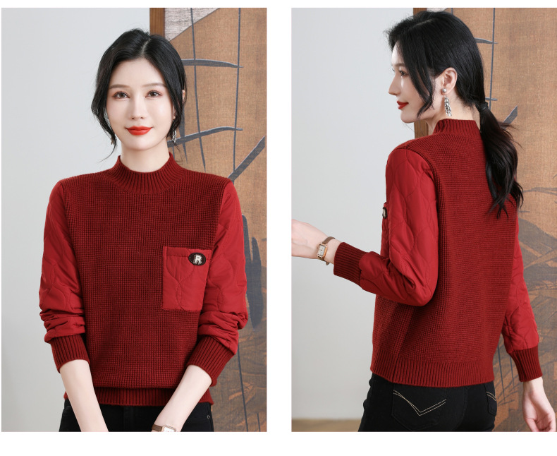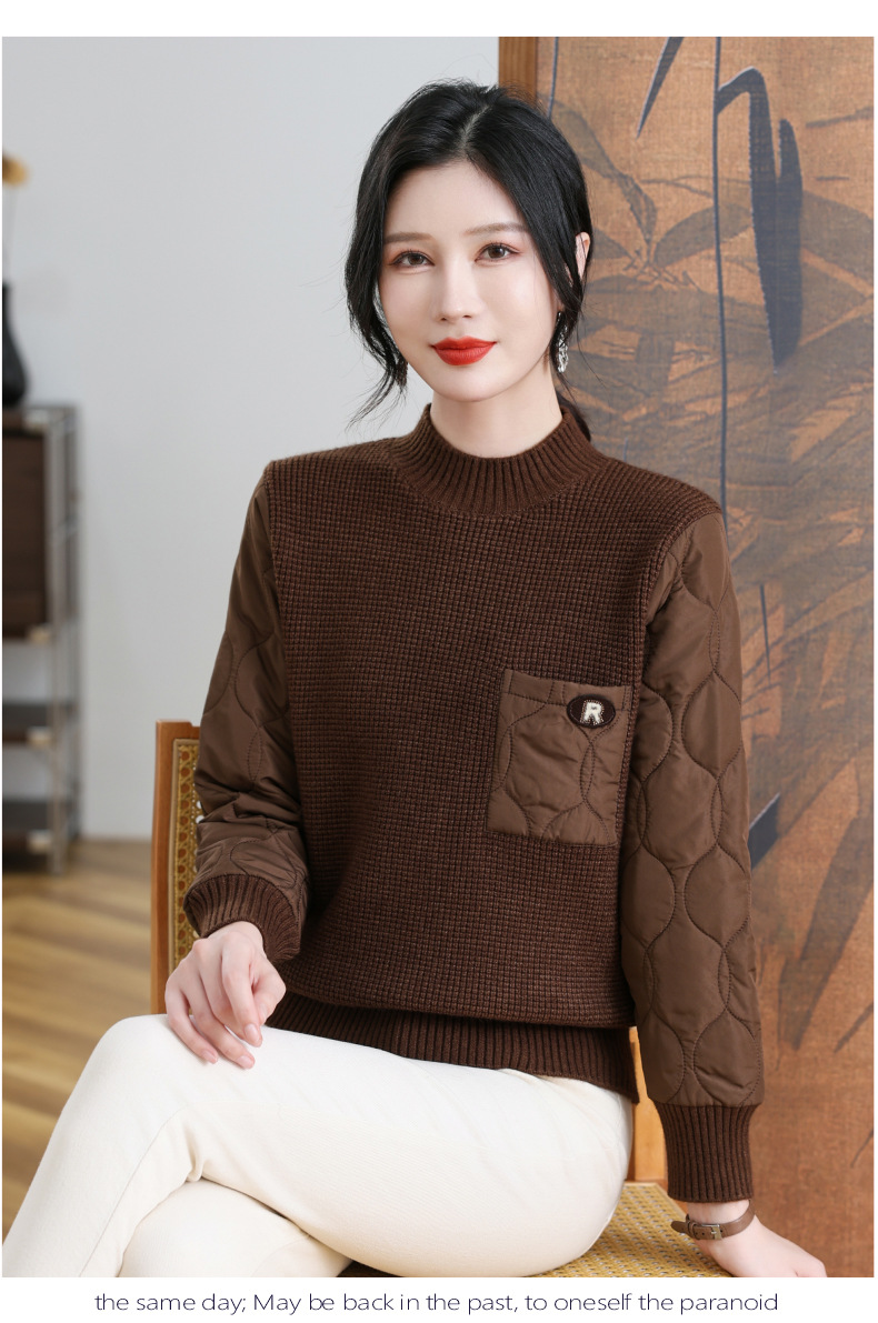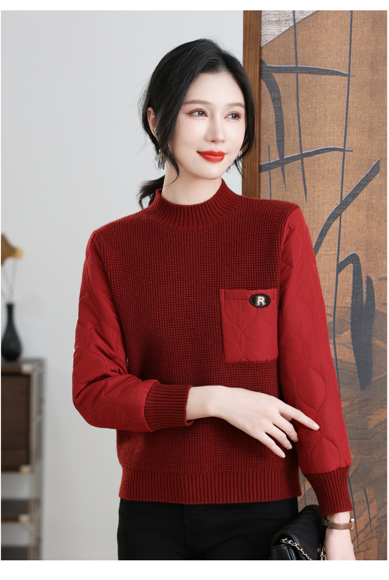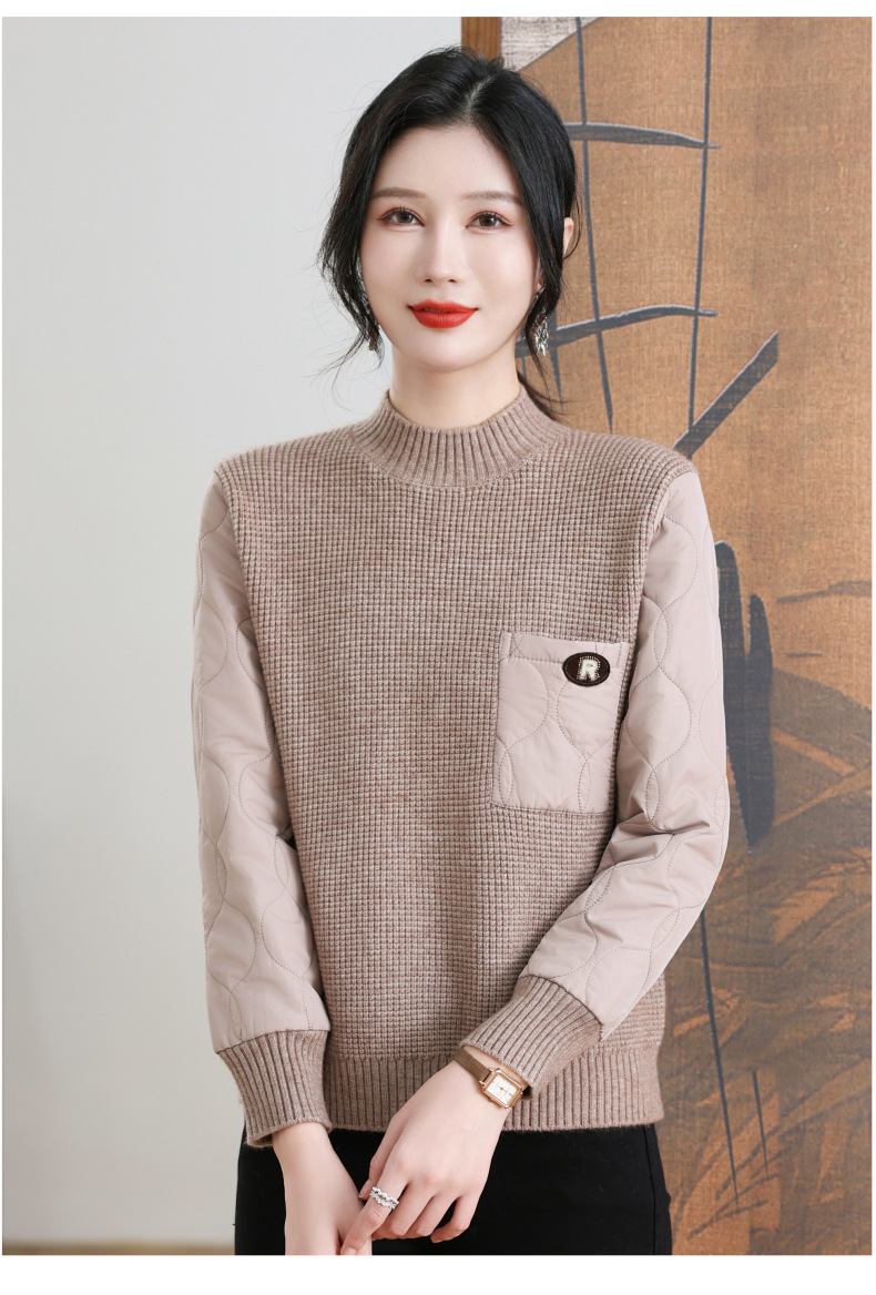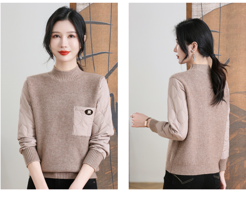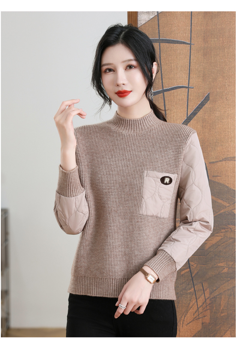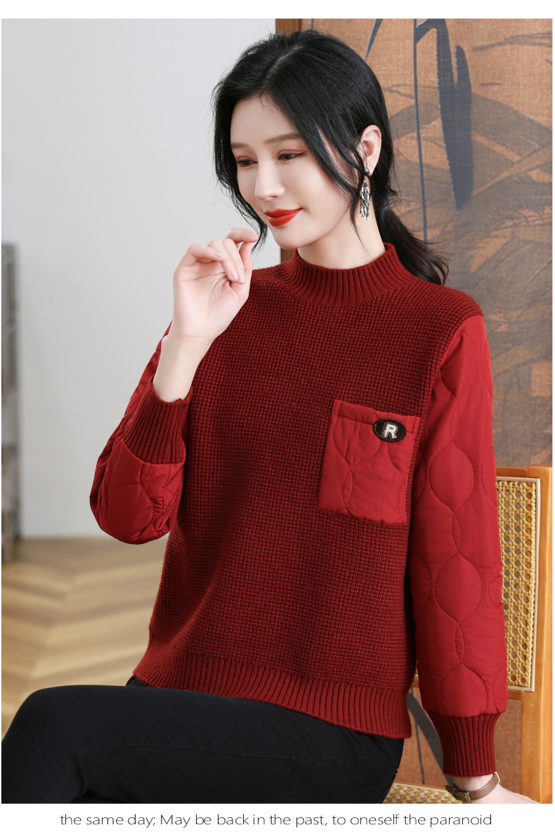 CC-101-3337半高领毛衣女秋冬2024内搭加棉厚款拼接保暖宽松打底上衣女