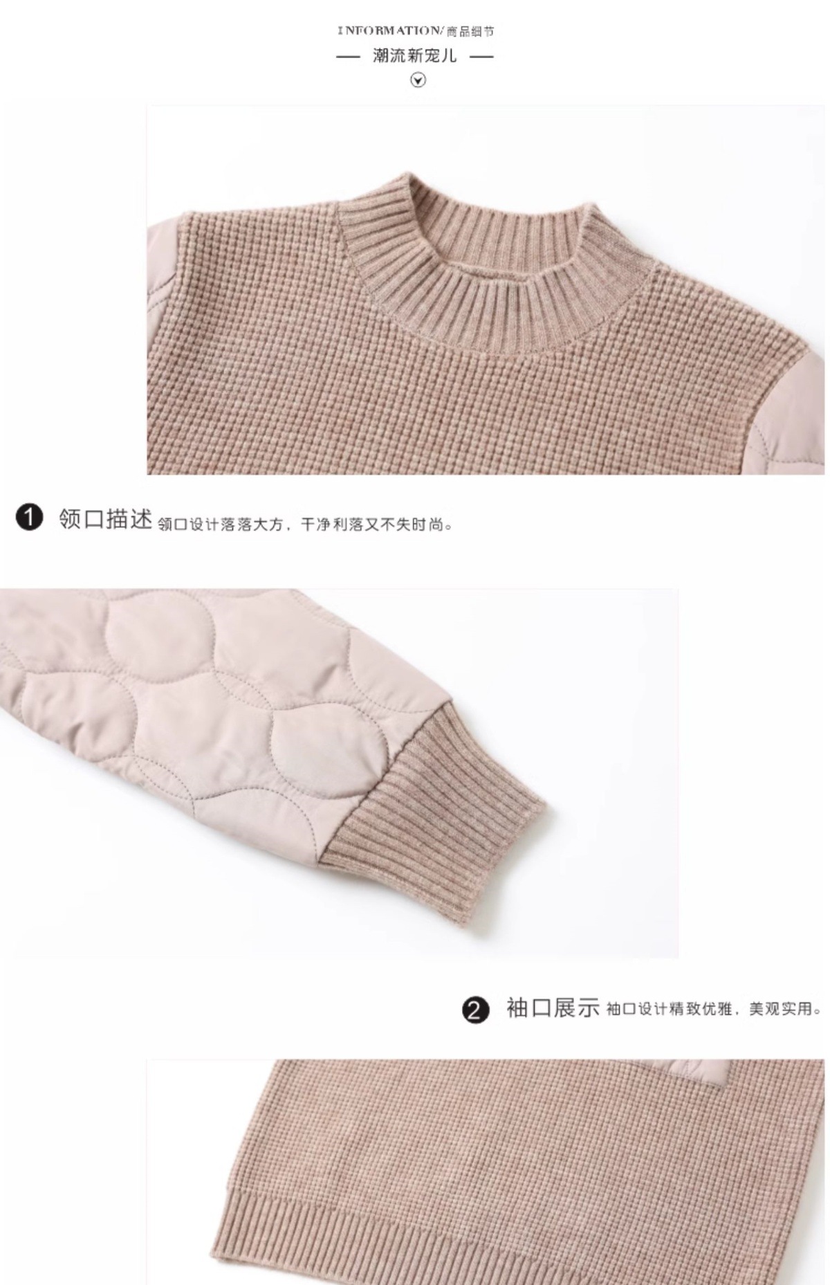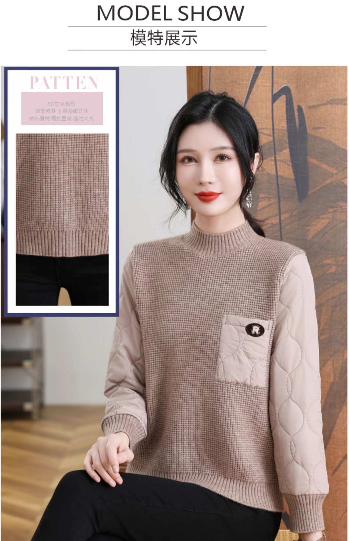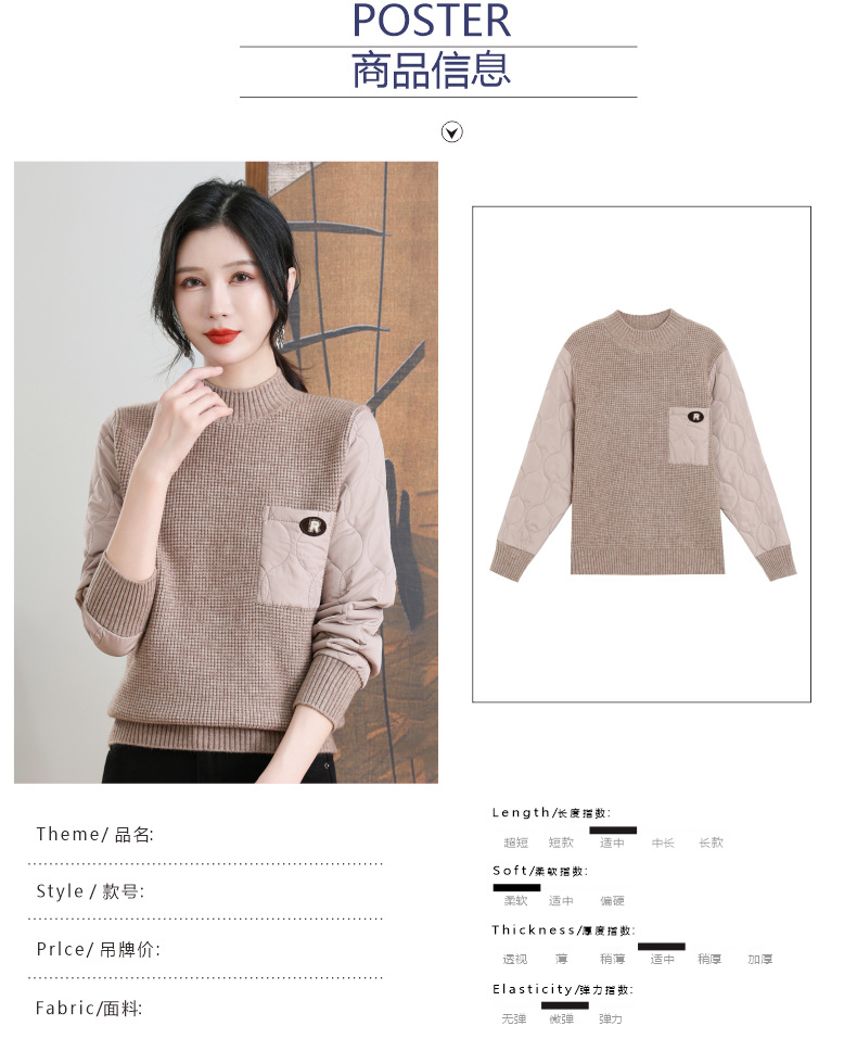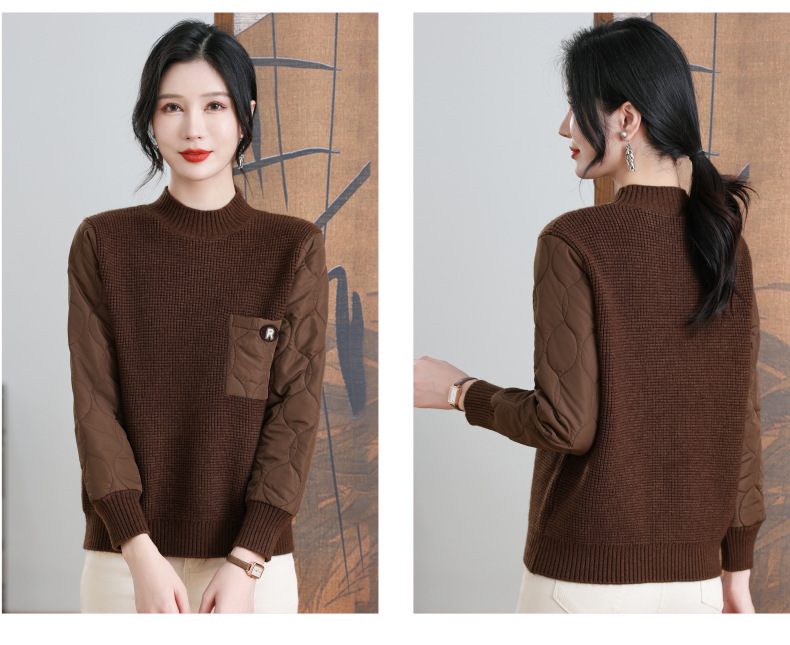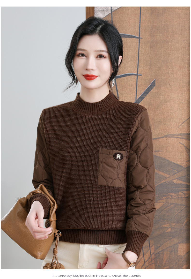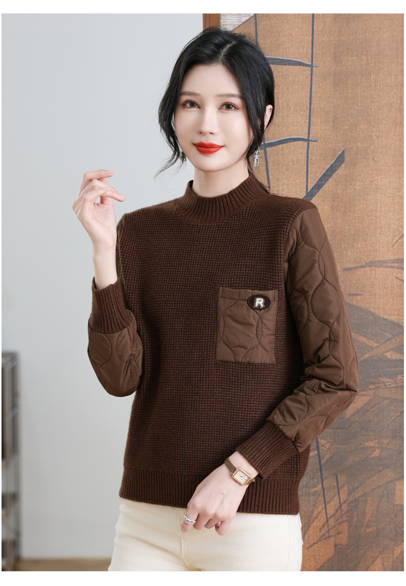 CC-101-3337半高领毛衣女秋冬2024内搭加棉厚款拼接保暖宽松打底上衣女
