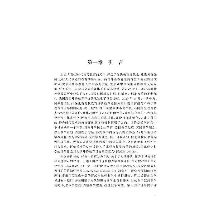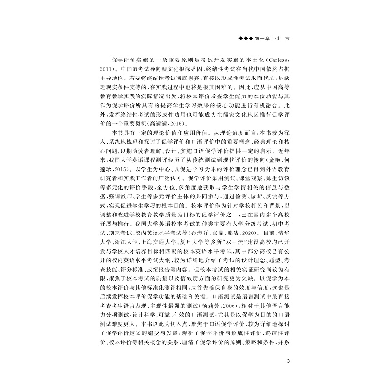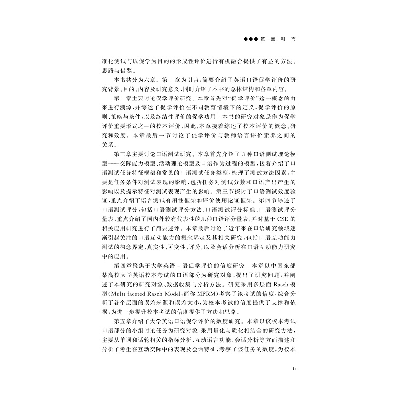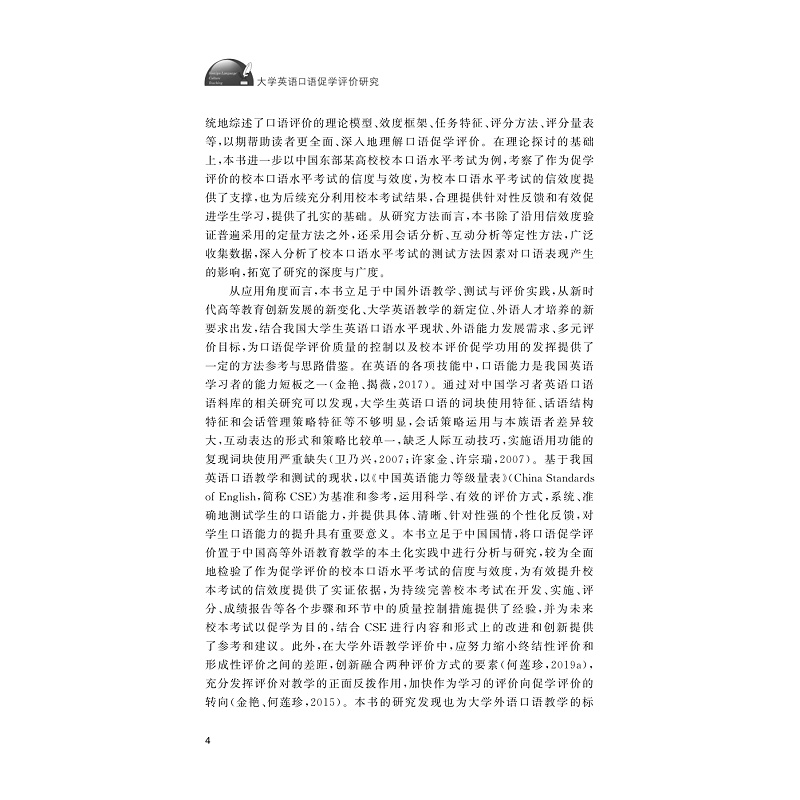 本书聚焦于大学英语口语促学评价,梳理了促学评价定义的嬗变与发展,辨析了促学评价与形成性评价、终结性评价、校本评价等相关概念的关系,廓清了促学评价的原则、策略和条件,并较为系统地综述和探讨了口语评价的理论模型、效度框架、任务特征、评分方法、评分量表等。在理论探讨的基础上,本书立足于中国外语教学、测试与评价实践,进一步以中国东部某高校校本口语水平考试为例,采用量化和质化相结合的研究方法,较为深入地考察了作为促学评价的校本口语水平考试的信度与效度,为有效提升校本考试的信效度提供了实证依据,并为未来校本考试以促学为目的,结合《中国英语能力等级量表》进行内容和形式上的改进和创新提供了参考和建议。