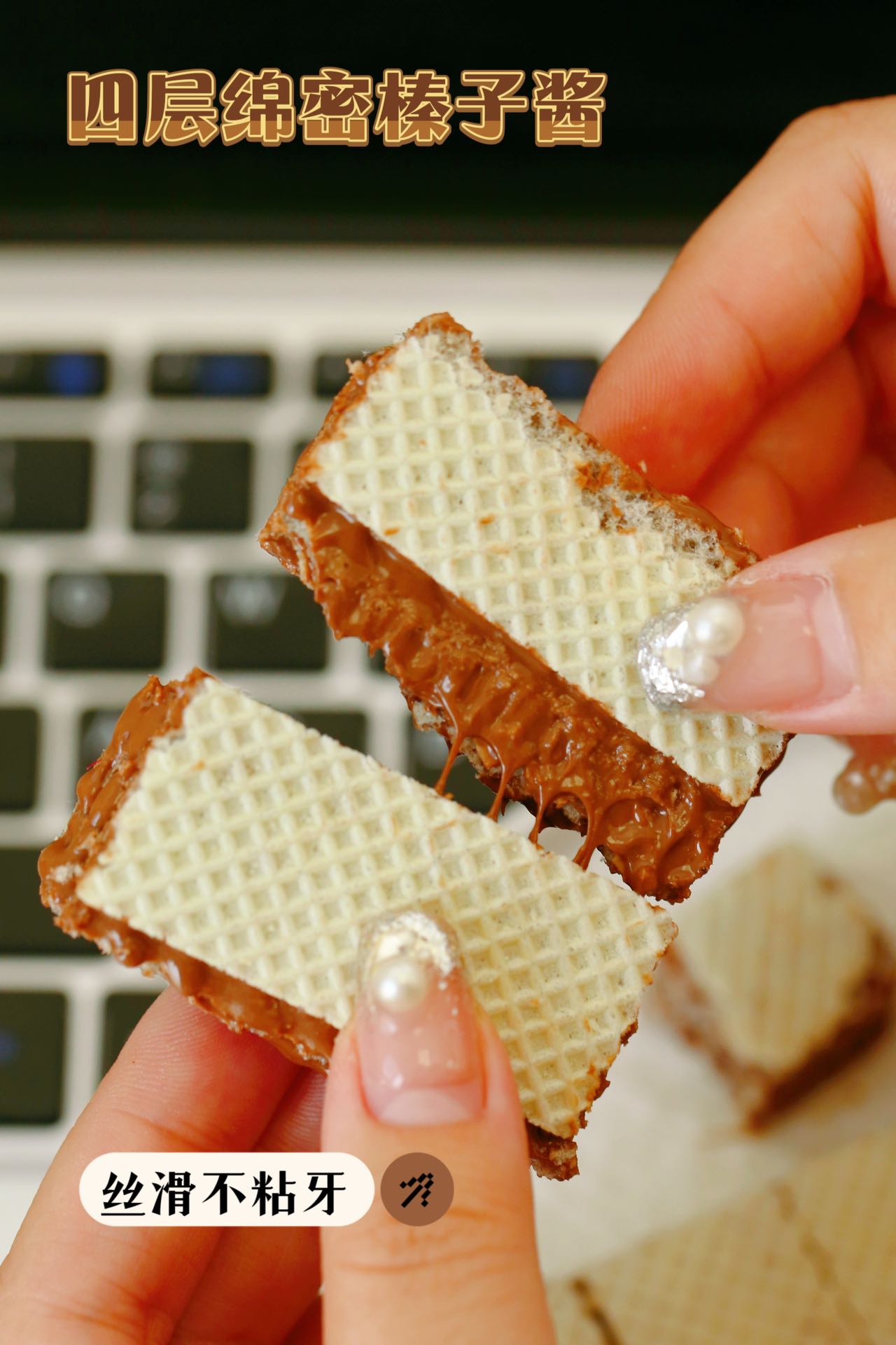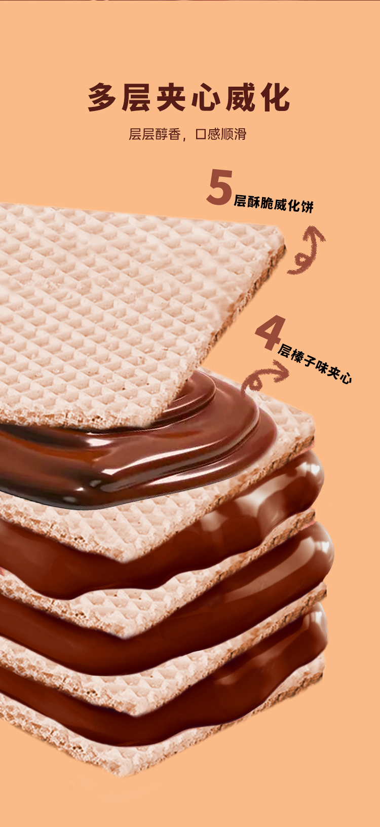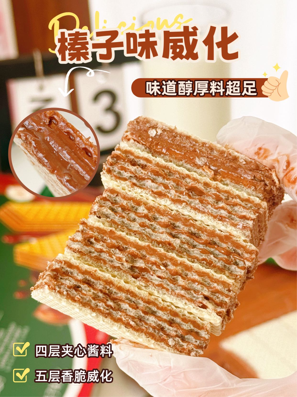 2.5层威化,4层夹心,独特的菱格纹理华夫表层,入口咔咔脆响