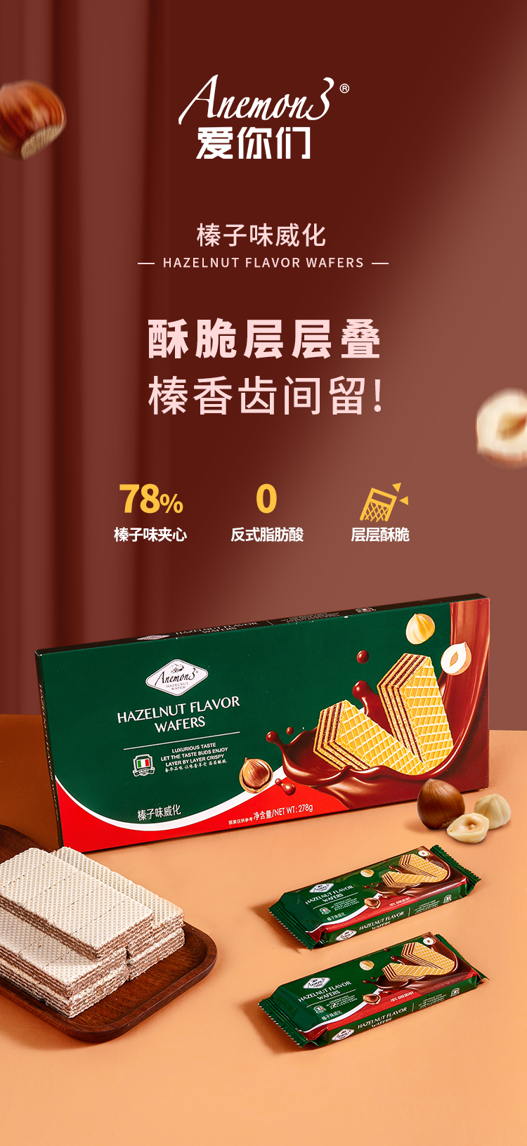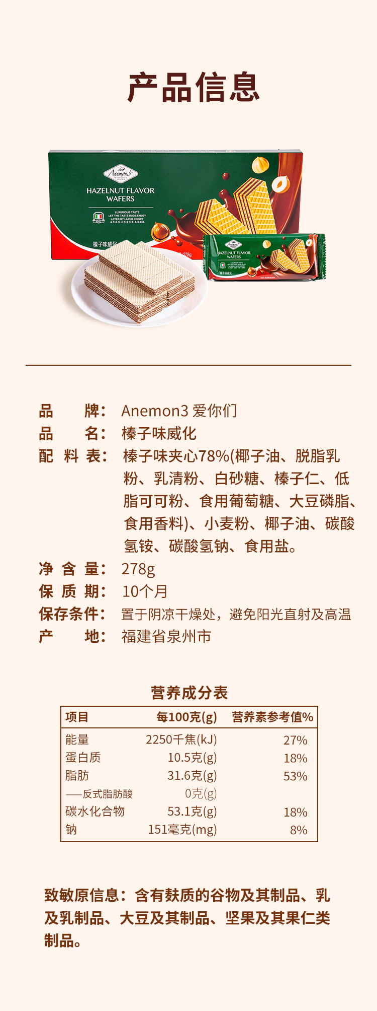 Anemon3爱你们 榛子味威化278g ✅4层夹心酱料➕5层香脆威化 ✅0反式脂肪❗0添加代可可脂‼️解馋又解饿