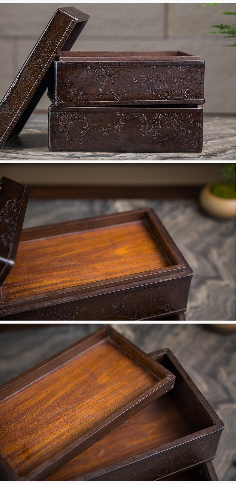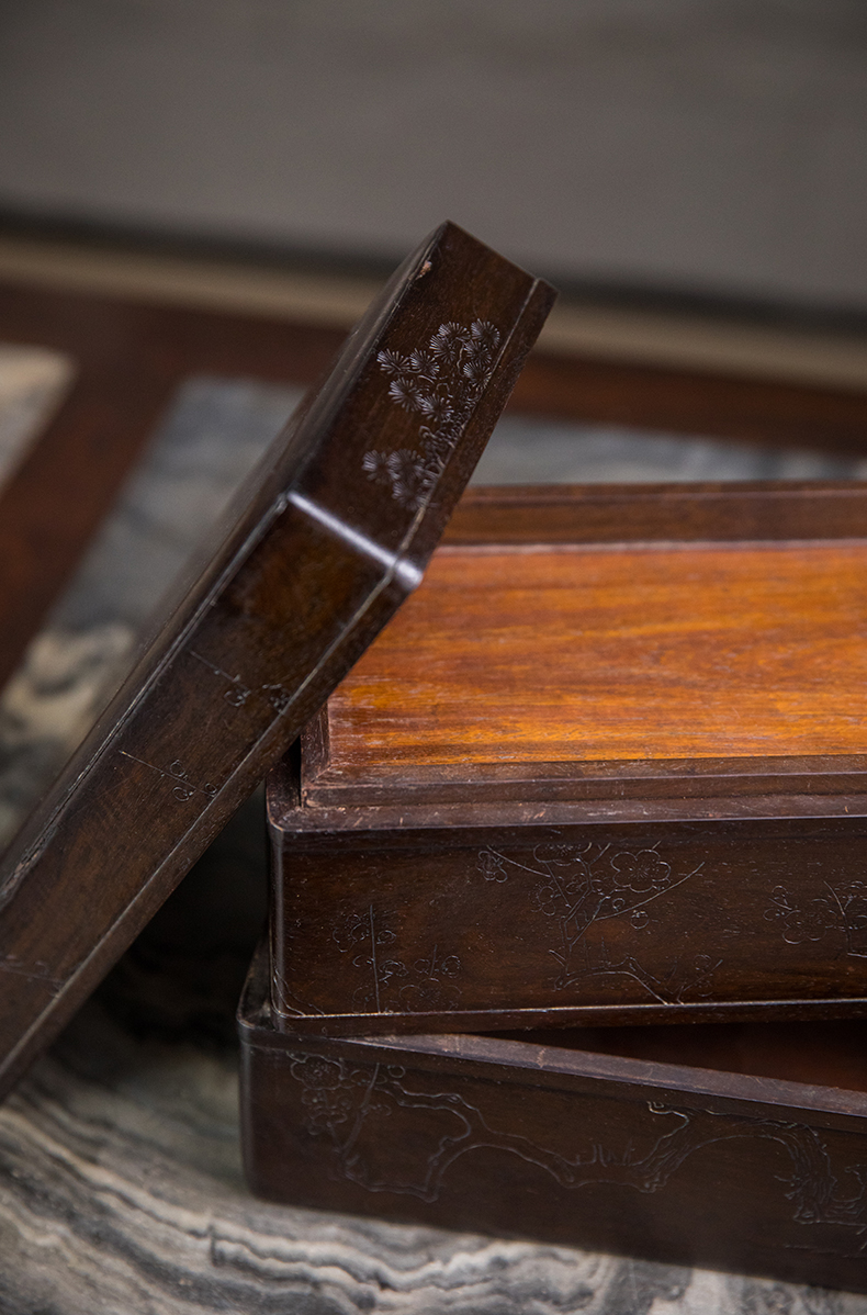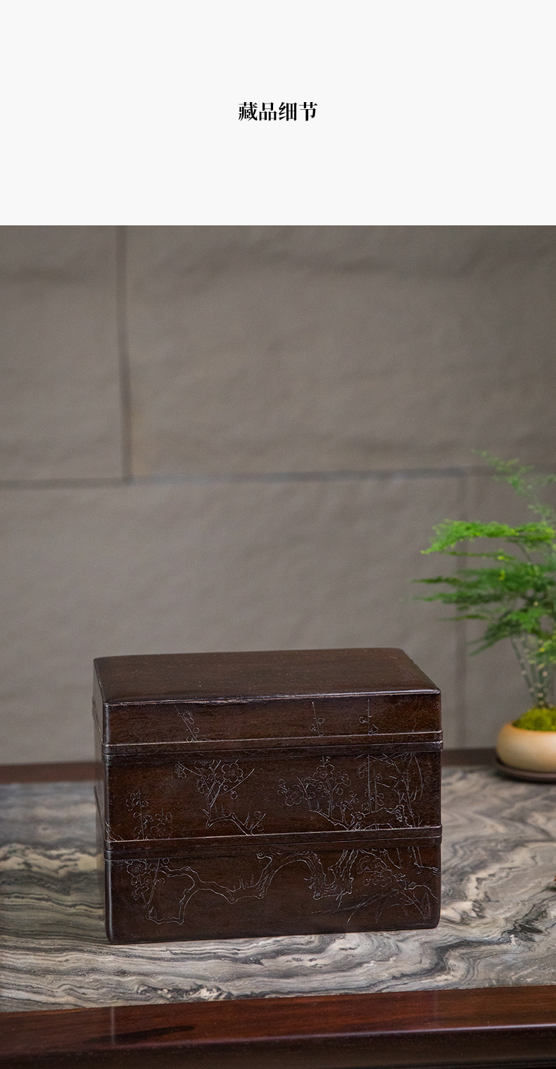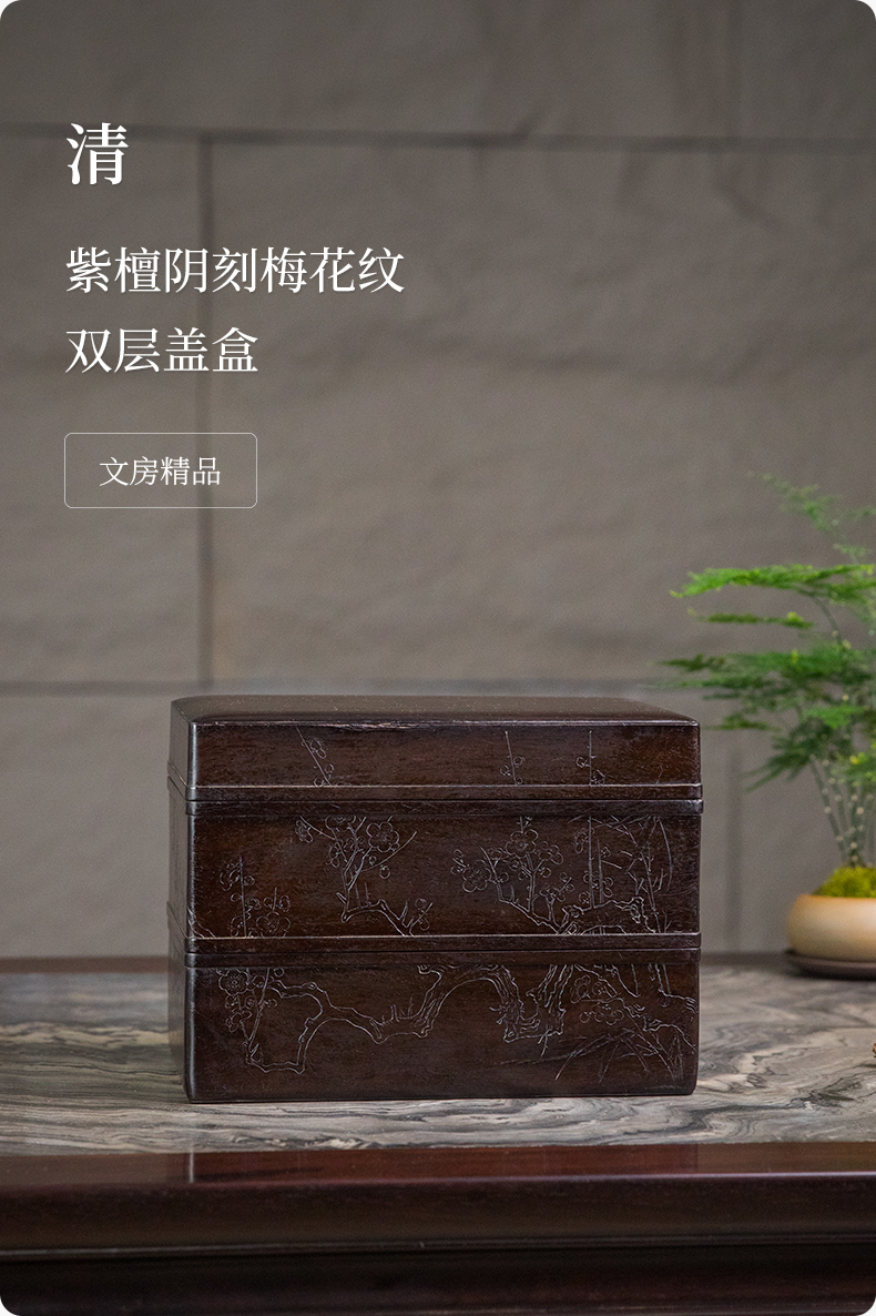 清 紫檀阴刻梅花纹双层盖盒